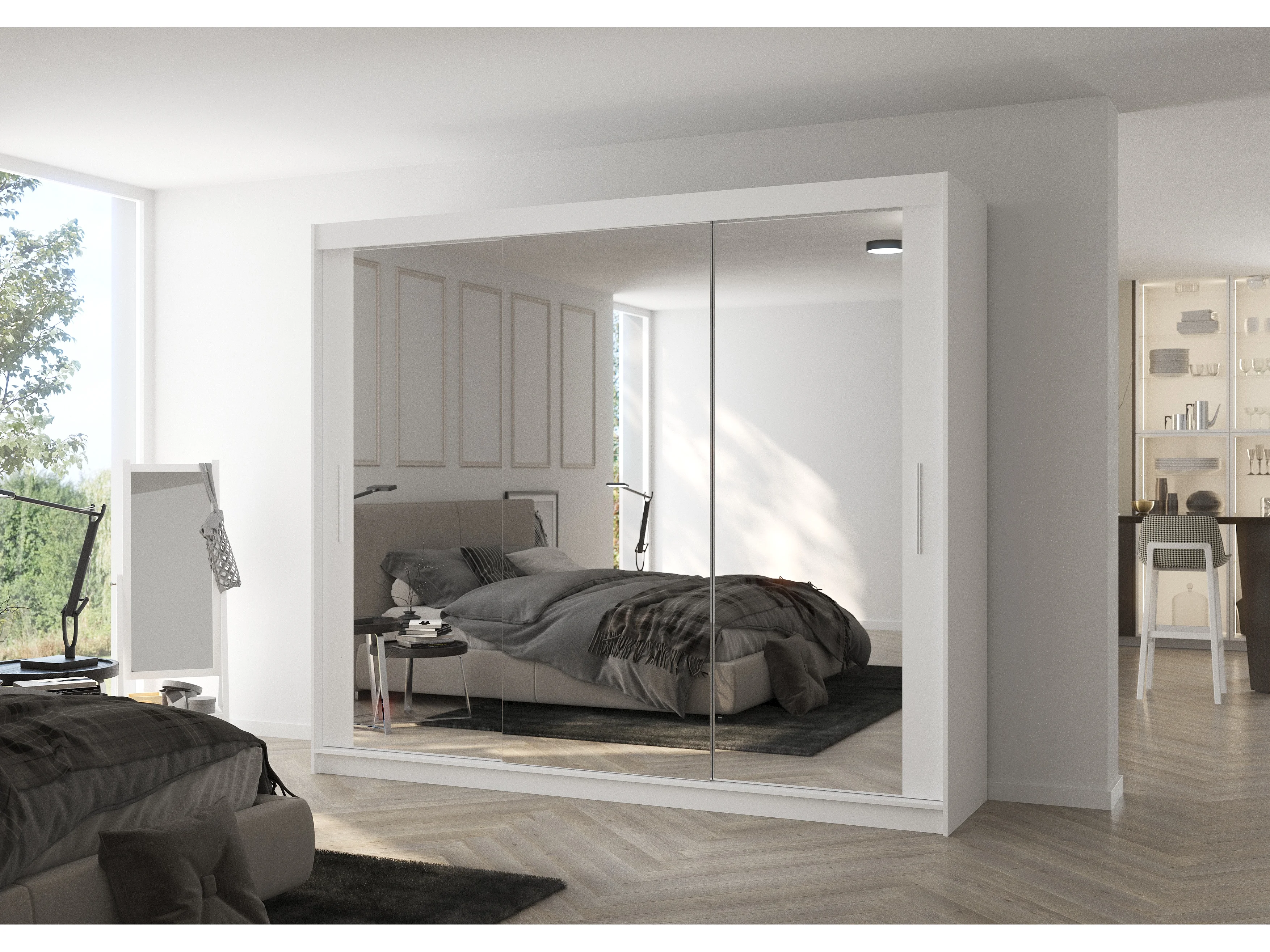 Grote moderne slaapkamerkast met 3 witte schuifdeuren en Douko spiegel 250 cm