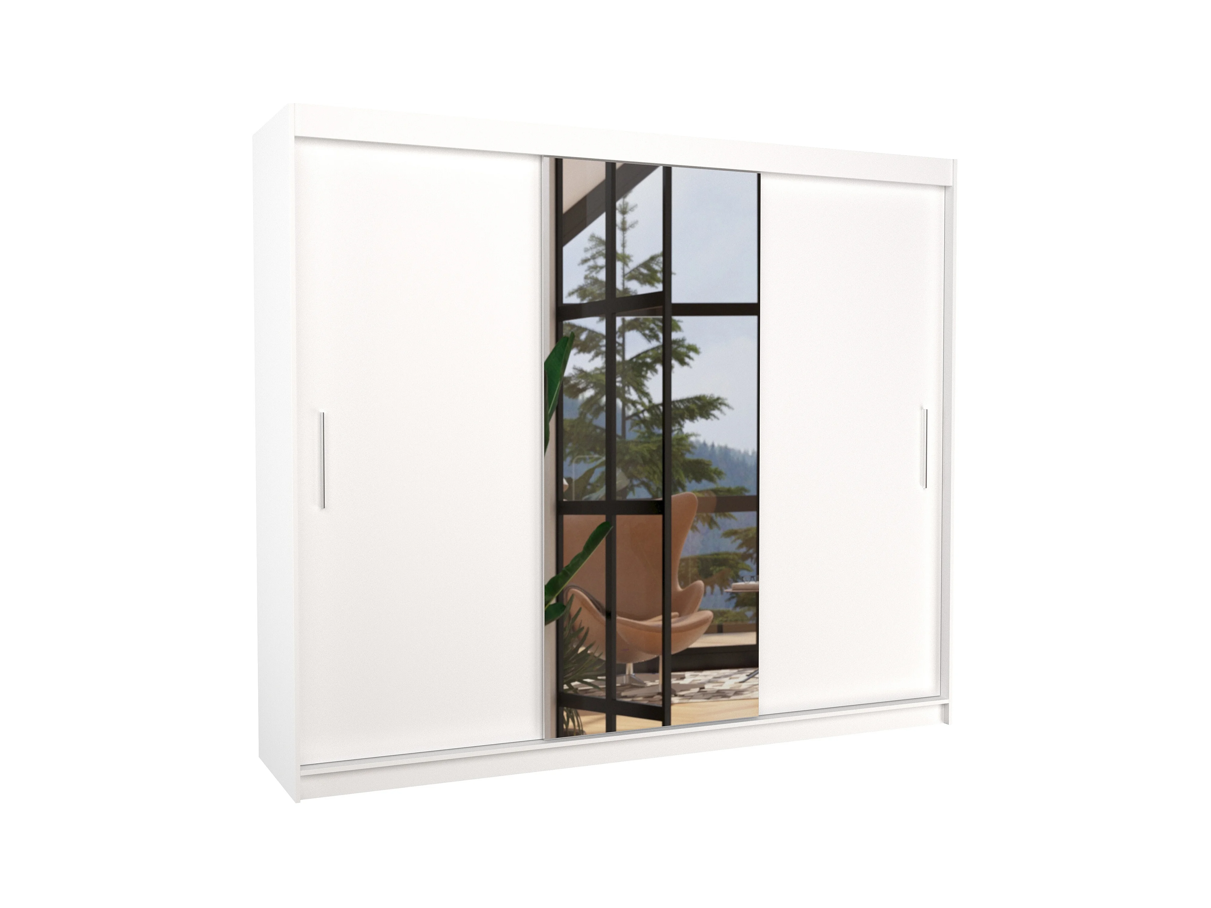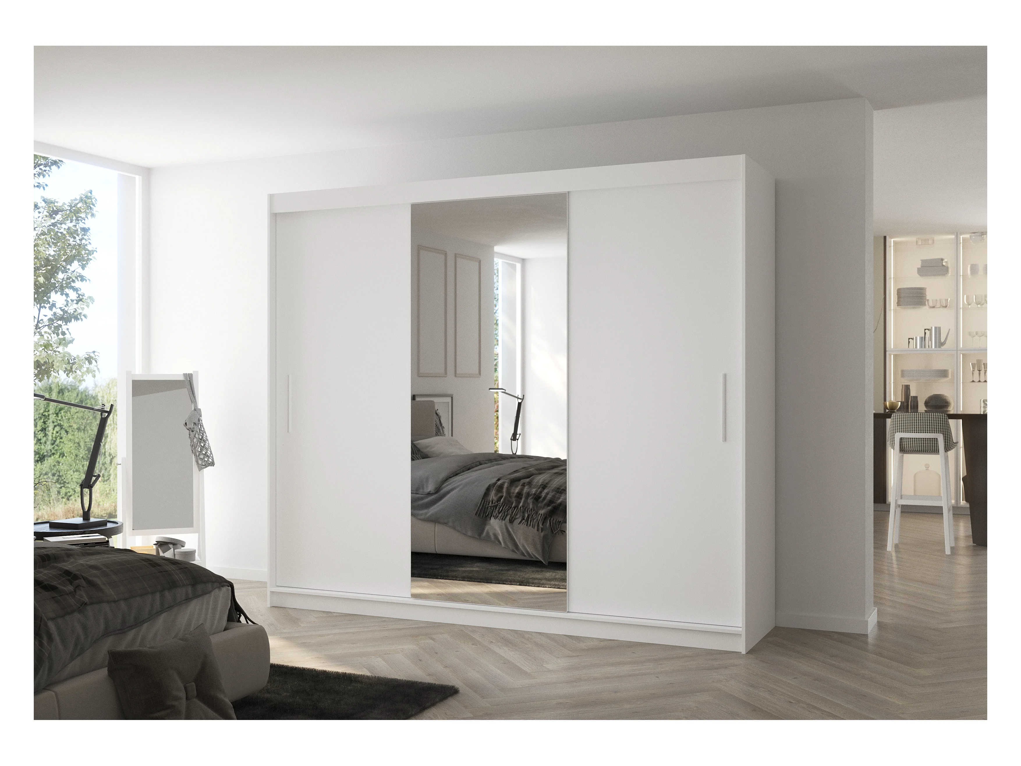 Grote slaapkamerkast met 3 witte schuifdeuren en Kola schuine spiegel 250 cm
