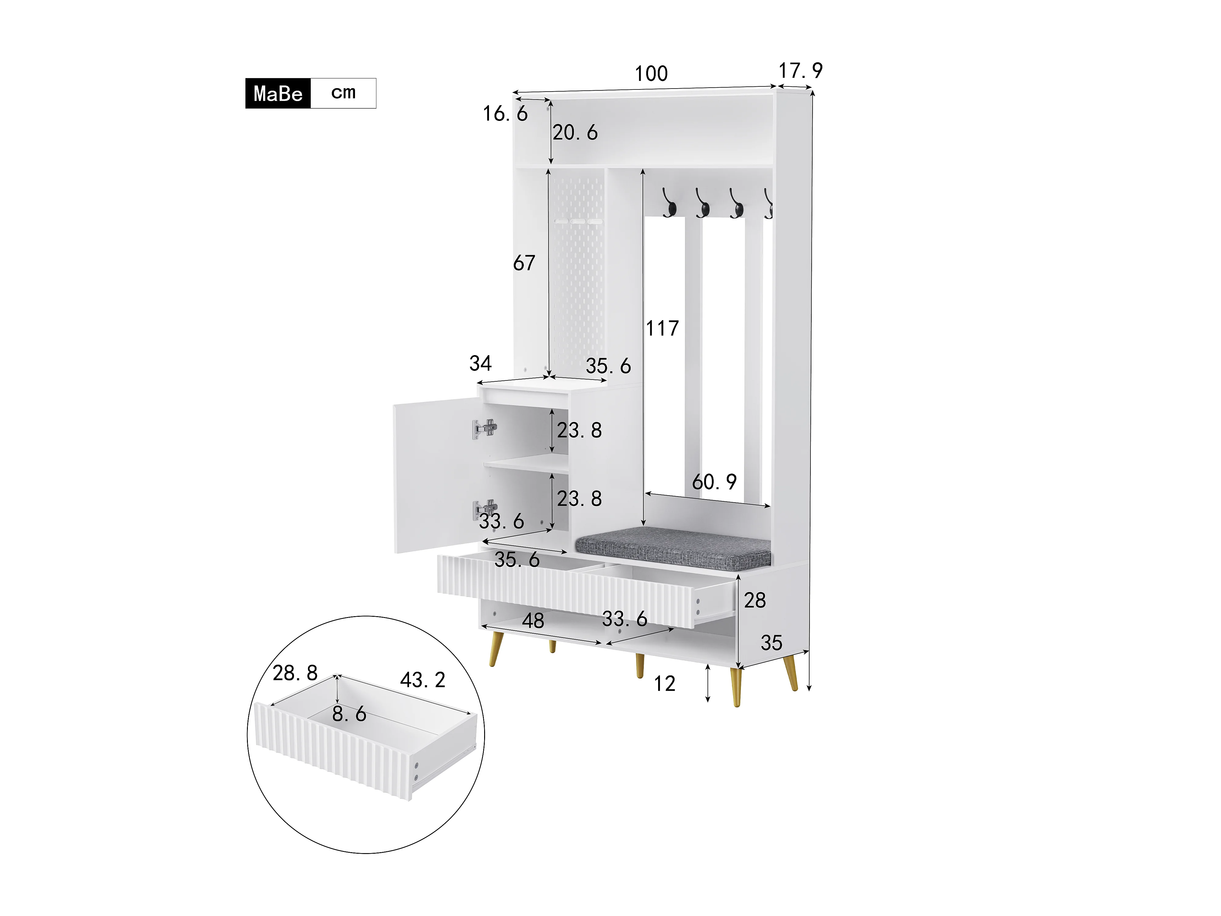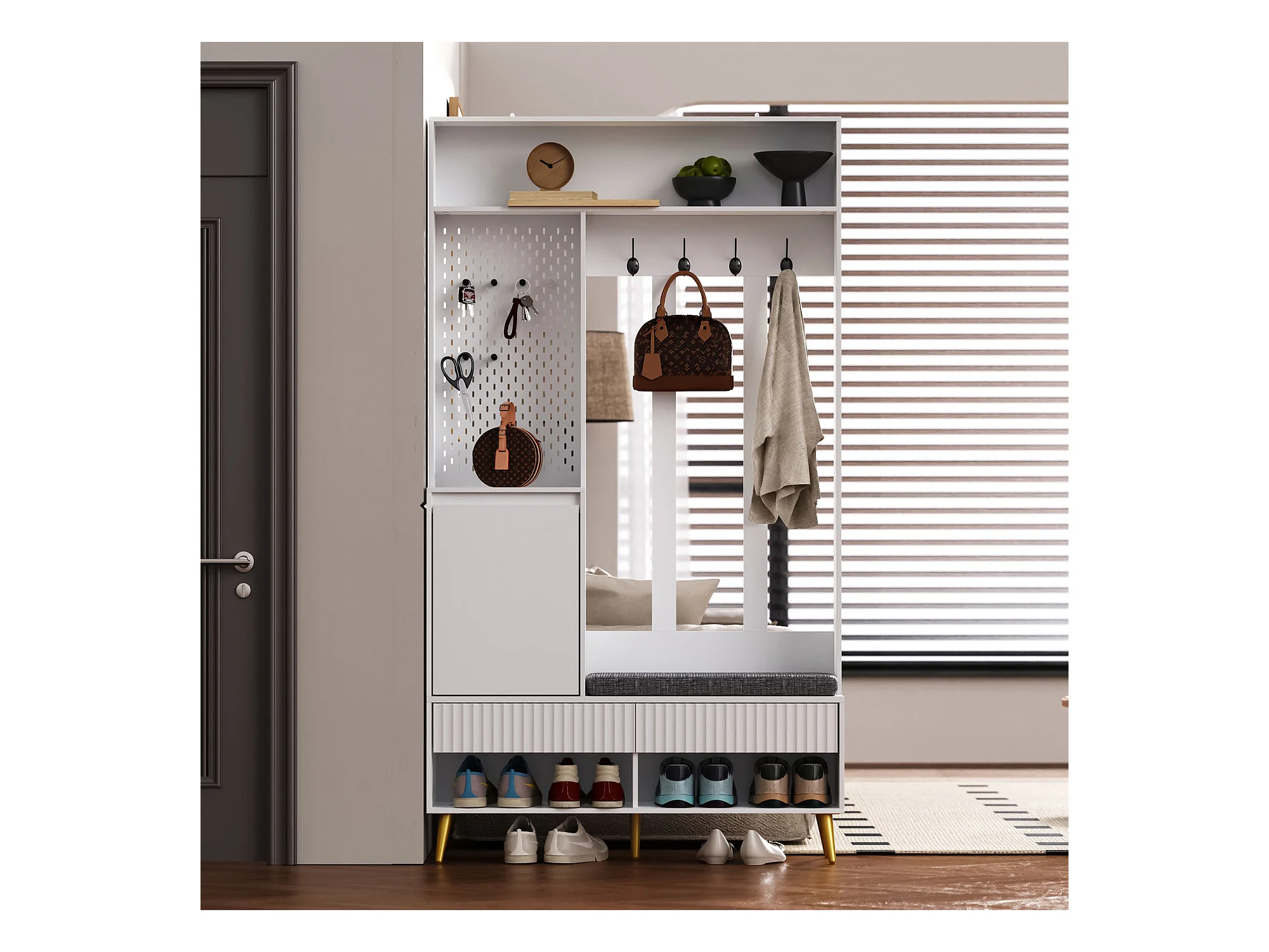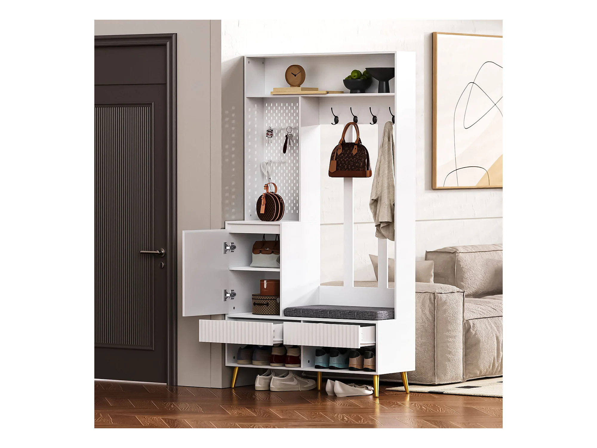 Halmeubel met bank, kapstok, planken en lades, 4 haken, 1 deur, wit, (100x35x180 cm)
