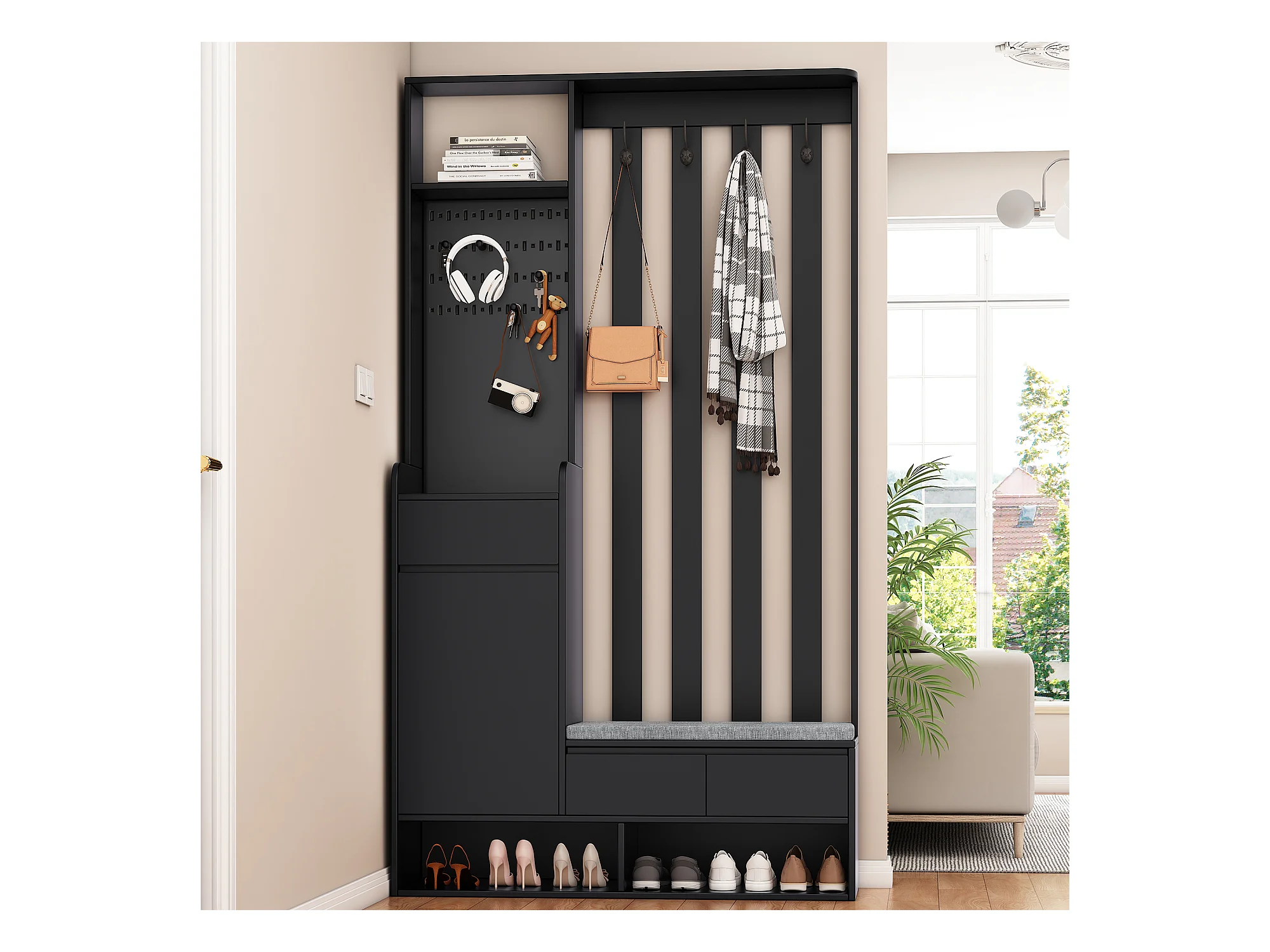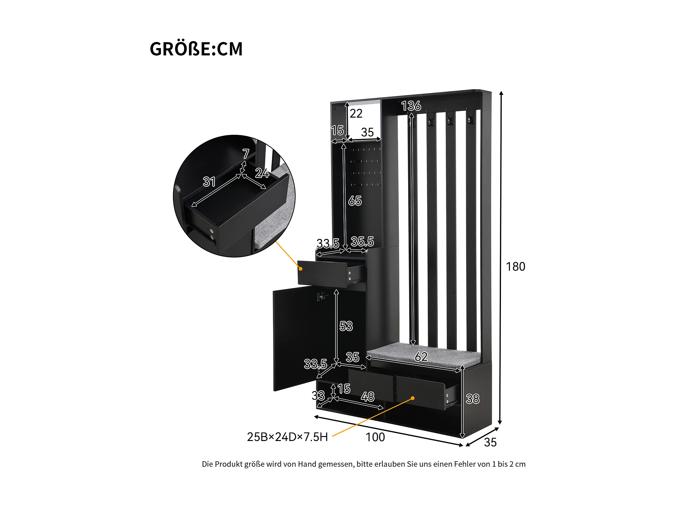 Halmeubelset 100x35x180 met lades en opbergkasten. Gemaakt van zwart MDF, geschikt voor woonkamer en hal.