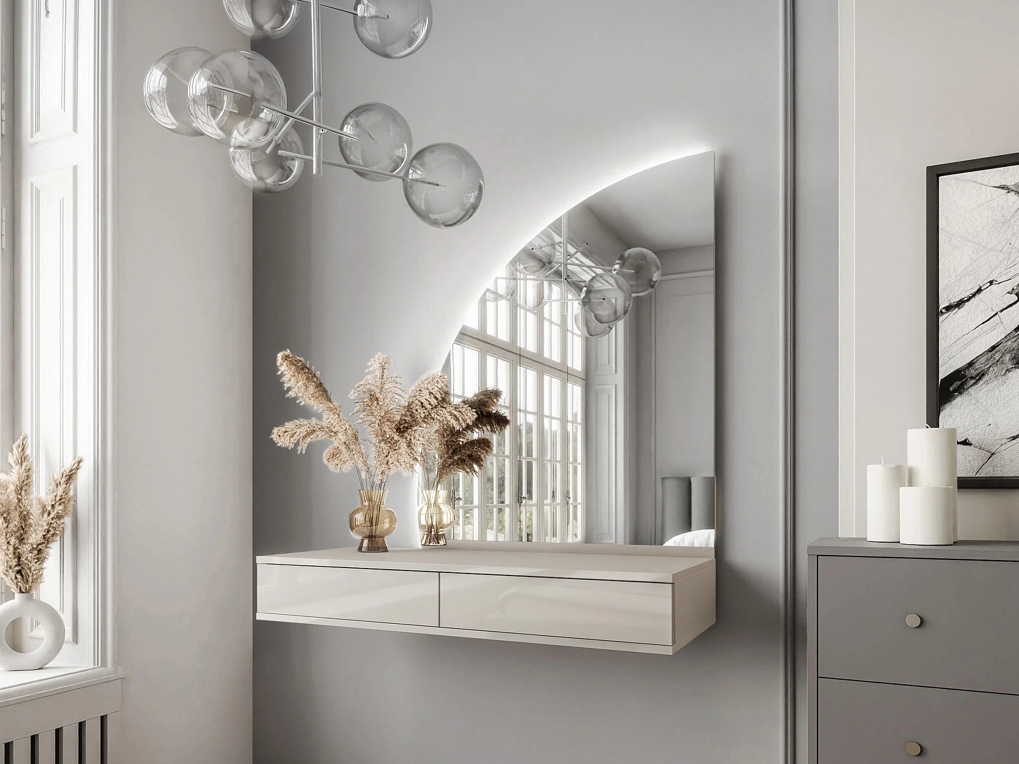 Zwevende kaptafel met spiegel en ledverlichting - 2 lades - Mat beige - JINEZA
