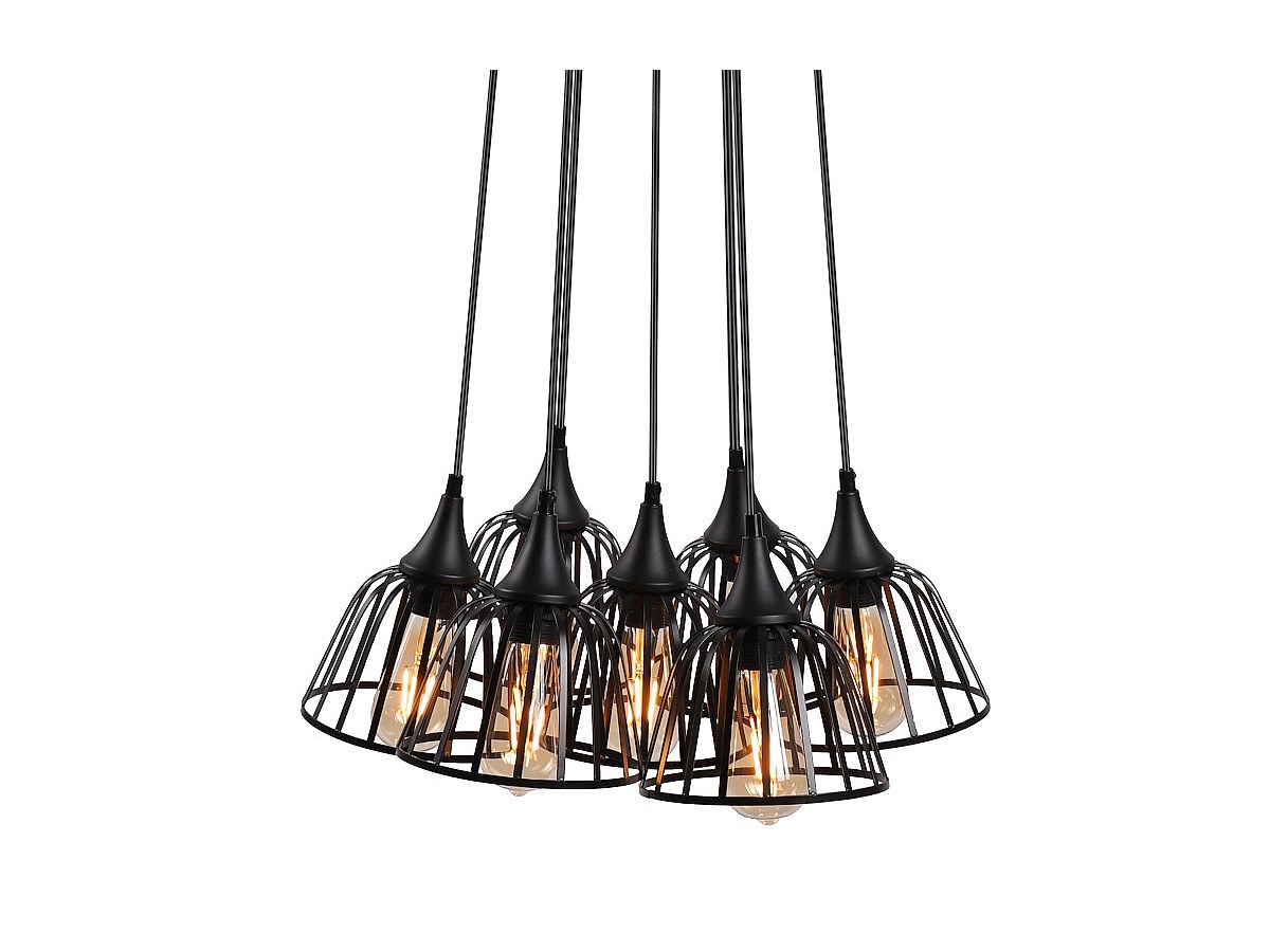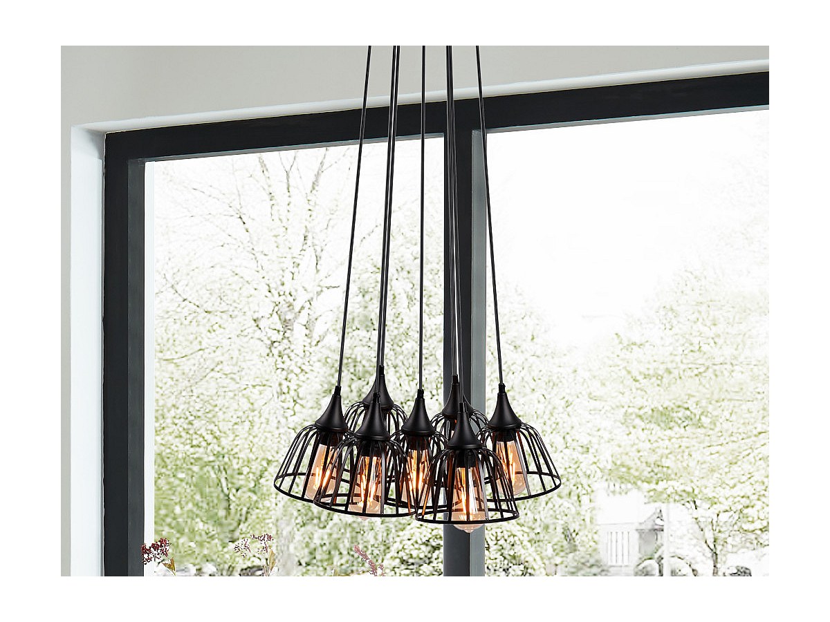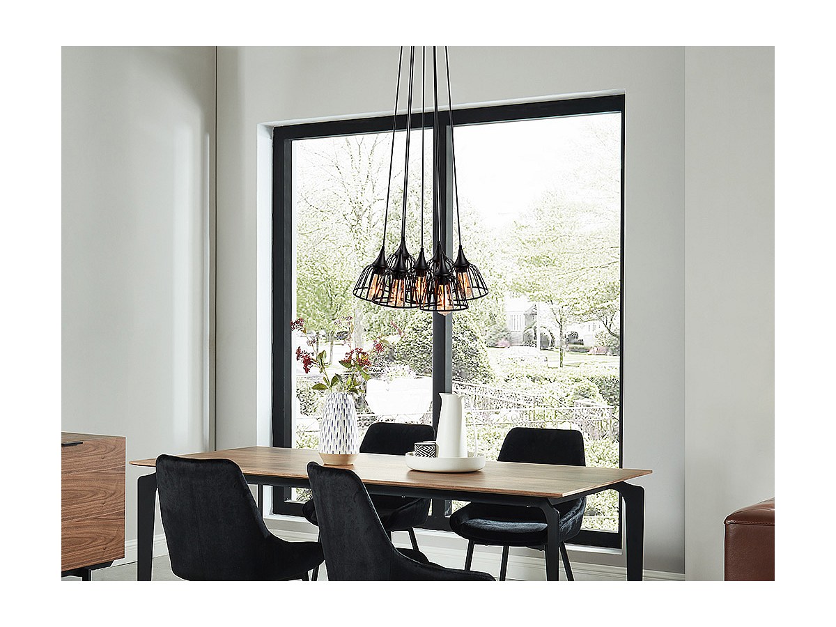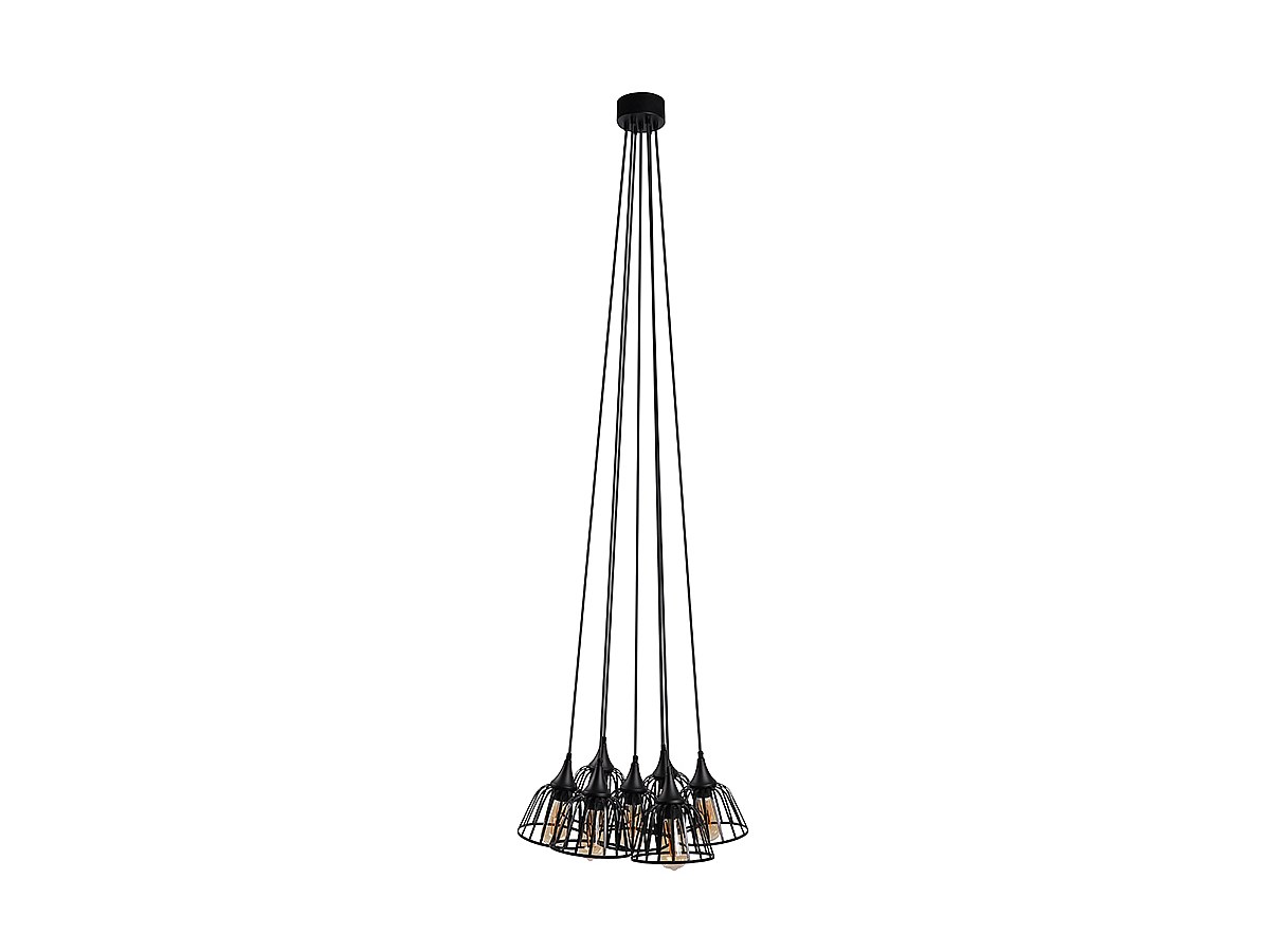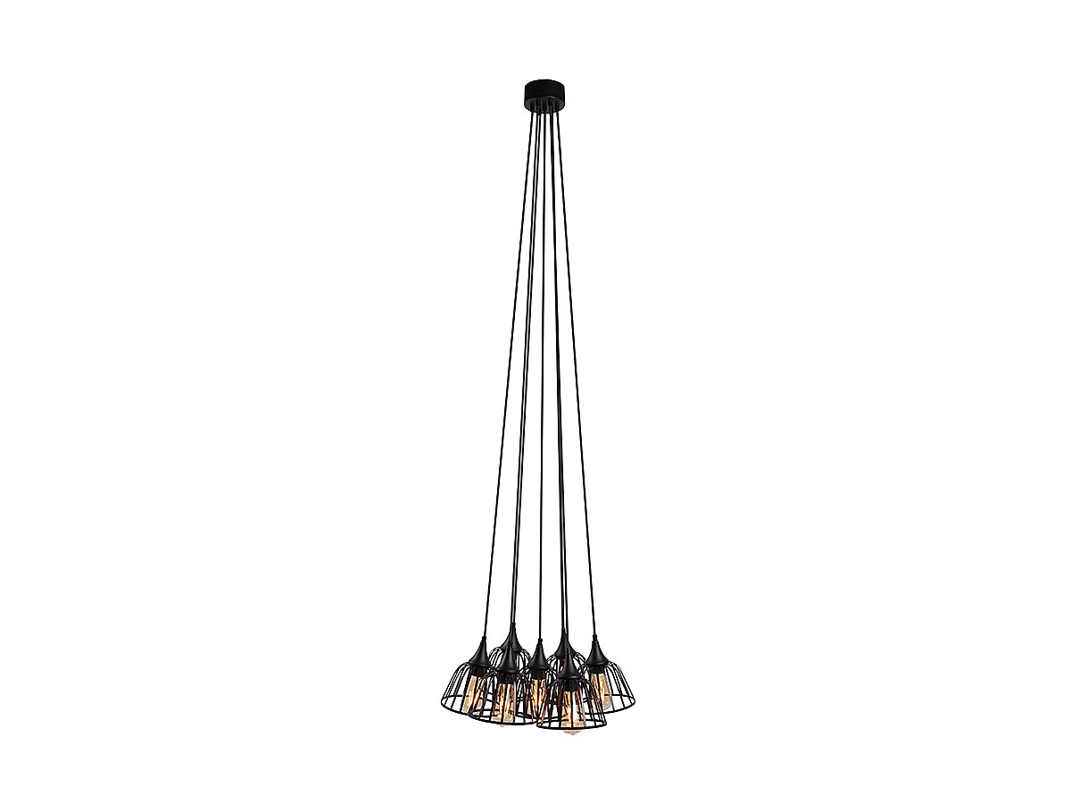 De hanglamp met meerdere lichtpeertjes STYLIAN vertegenwoordigt uitstekend de industriële stijl dankzij zijn lampenkappen met draadstructuur en zijn ruwe zwarte kleur!