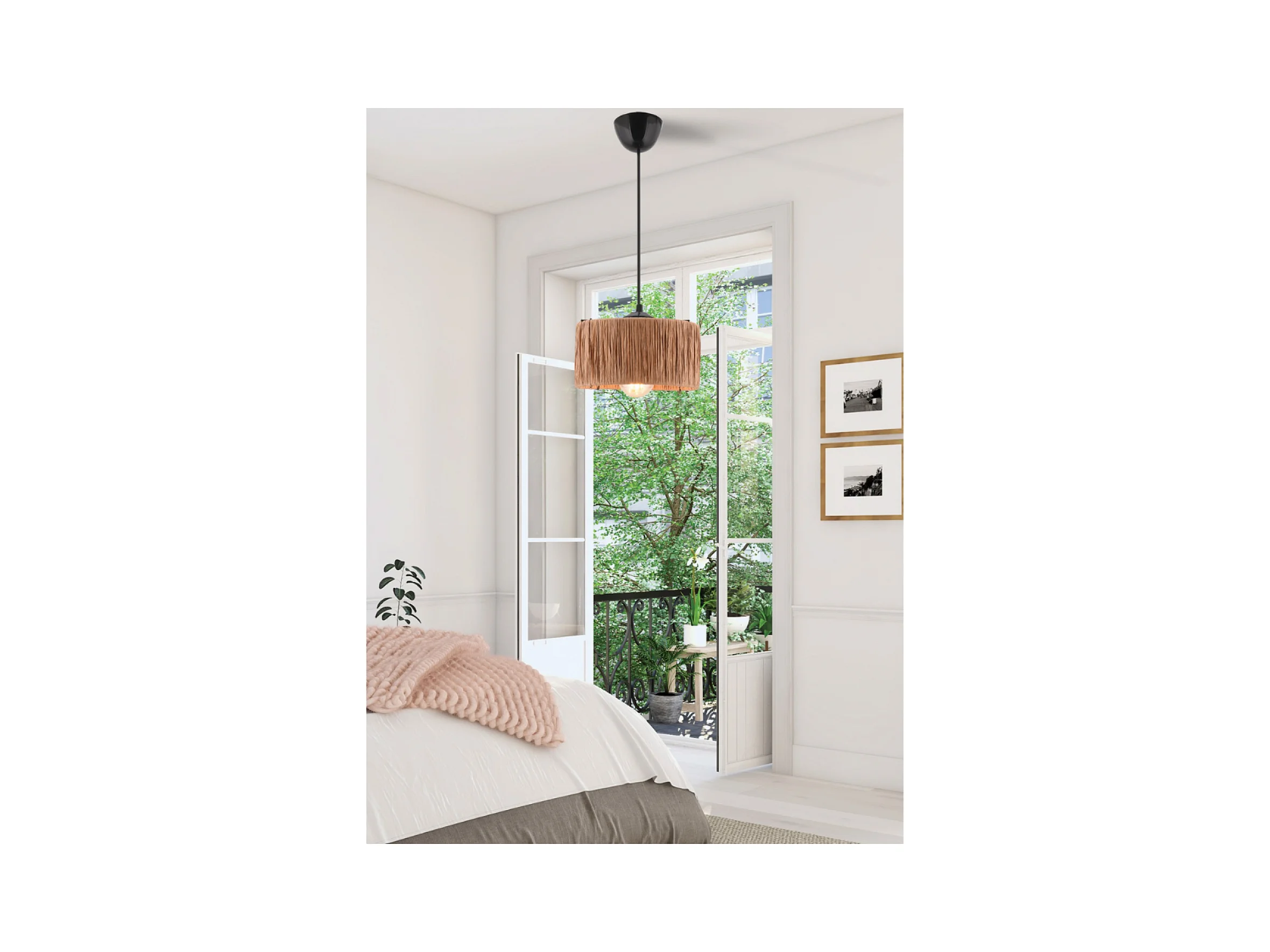 Hanglamp van beige raffia en zwart metaal - Bohemian chic design voor een gezellig interieur