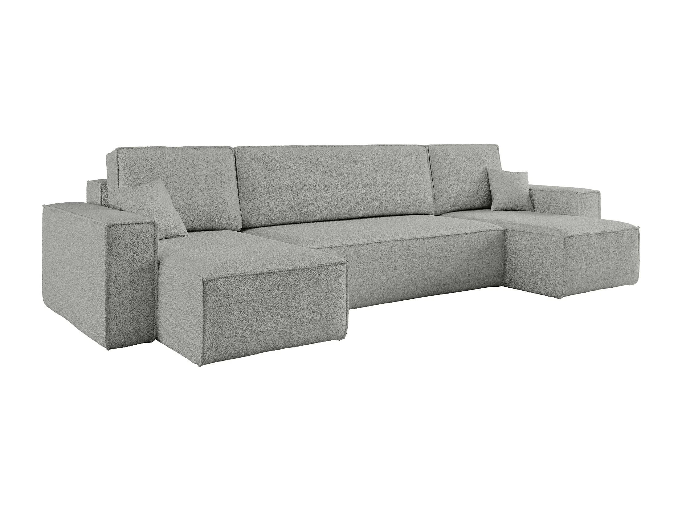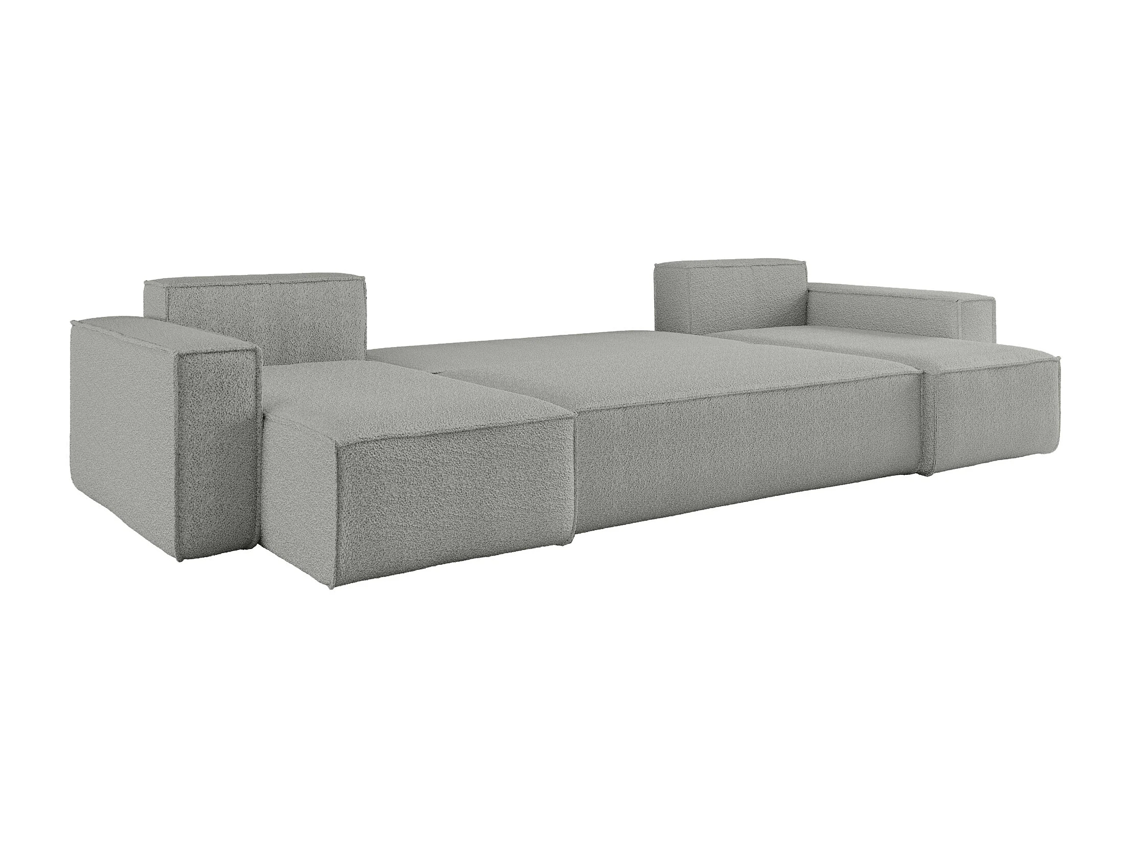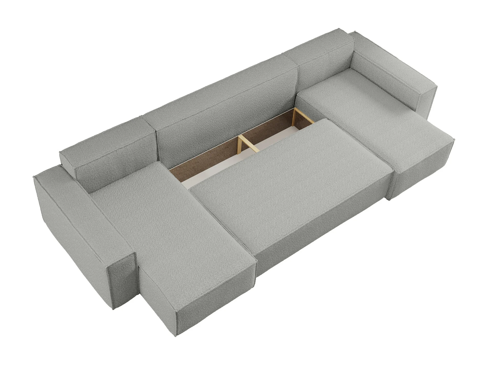 hoekbank Karl U uitschuifbaar met slaapfunctie, universele opbergruimte, van lichtgrijze bouclé stof van de fabrikant VINOTTI