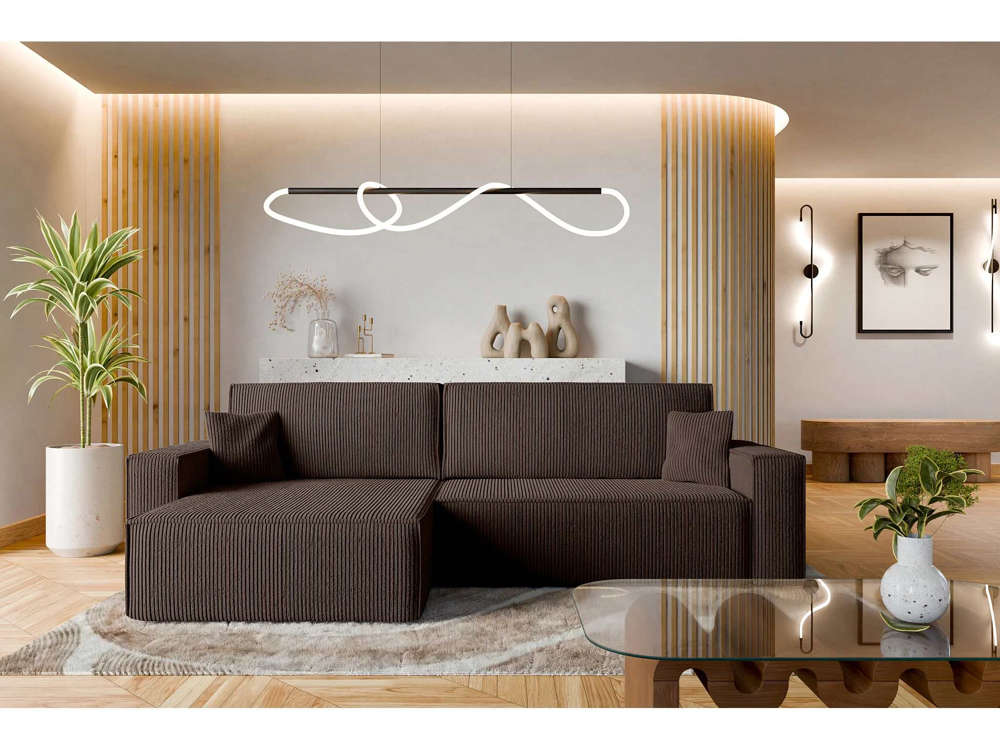 Hoekbank Karl XL met slaapfunctie en opbergruimte, ribfluweel chocoladebruin – VINOTTI