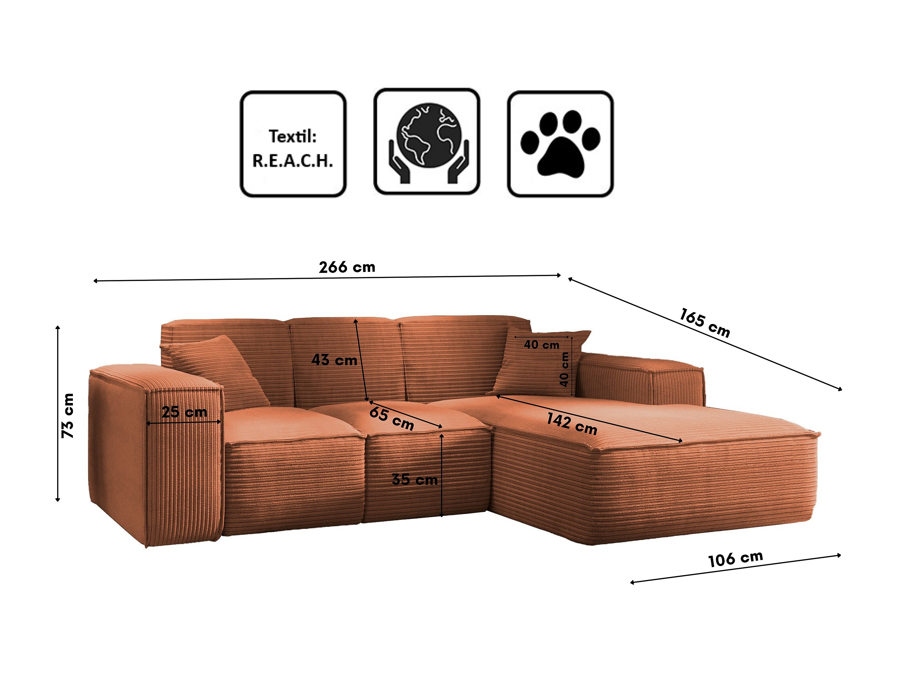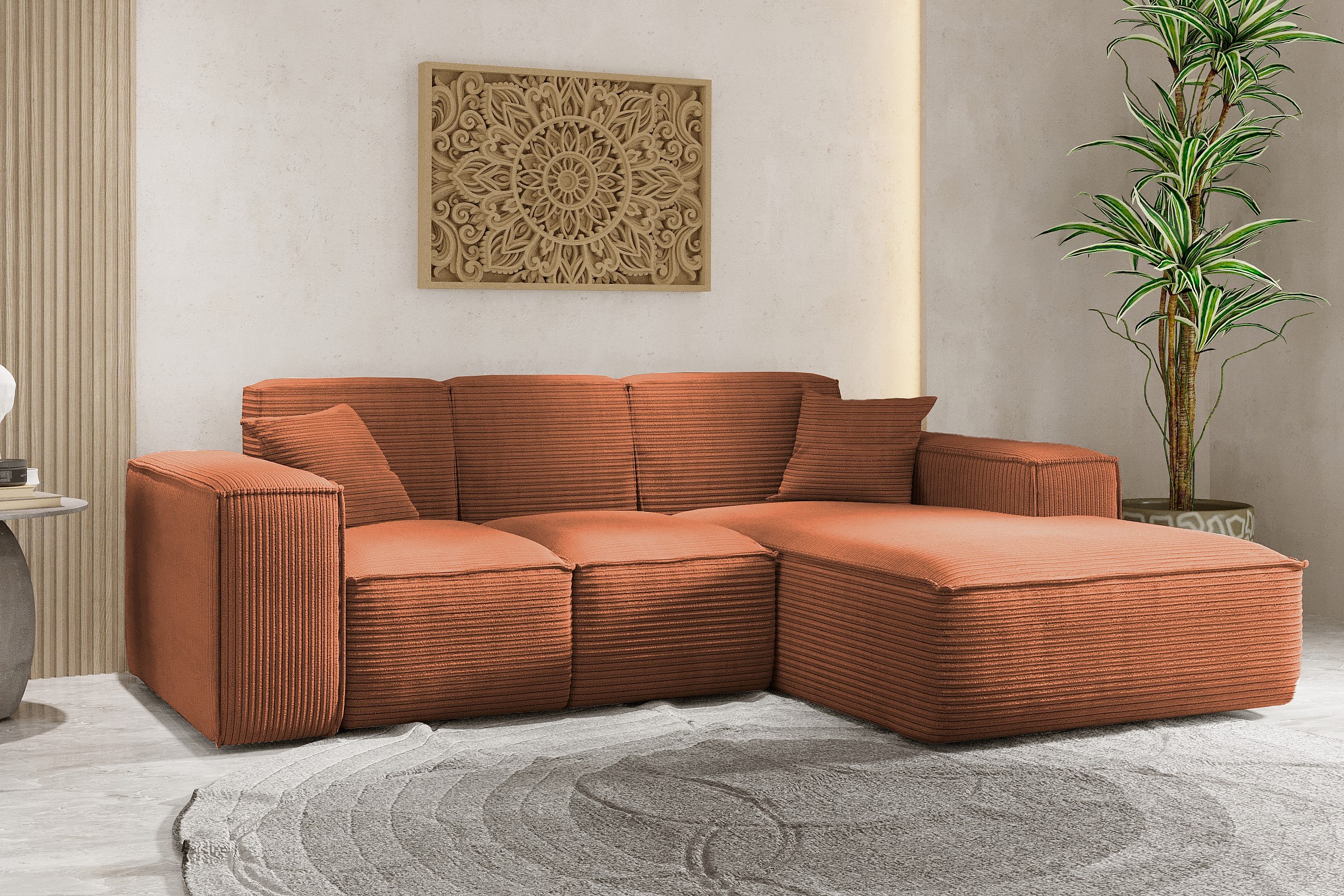 Hoekbank, L-vormige hoekbank, woonkamer, SIENA bank in Poso stof, koper, rechts