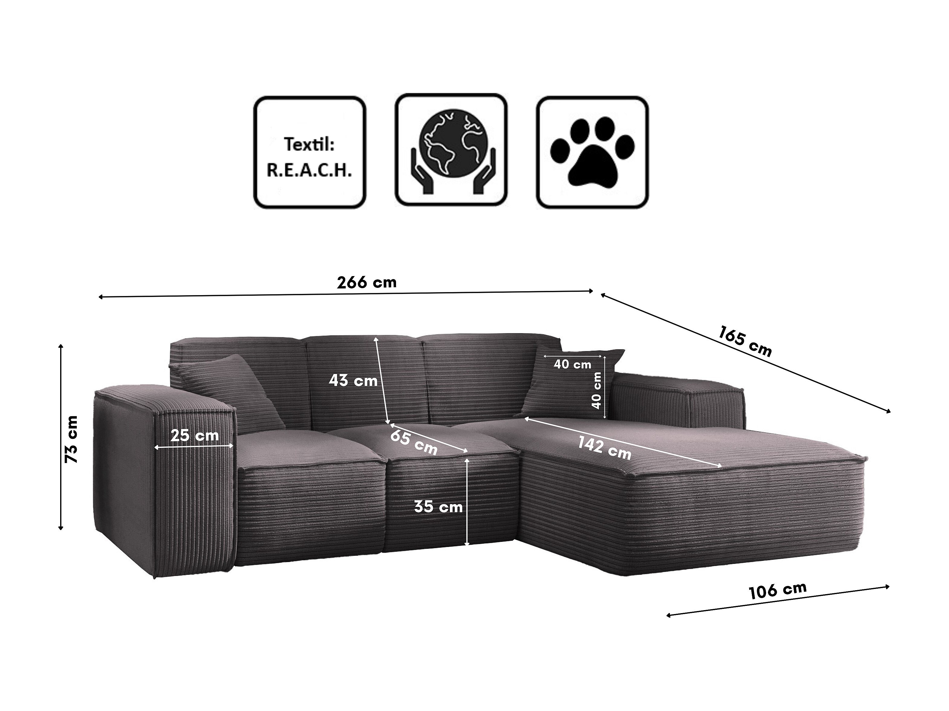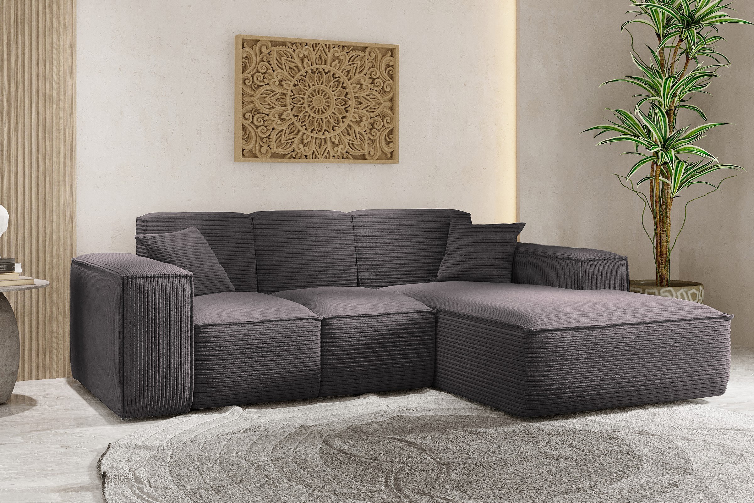 Hoekbank, L-vormige hoekbank, woonkamer, SIENA stof Poso bank, donkergrijs, rechts