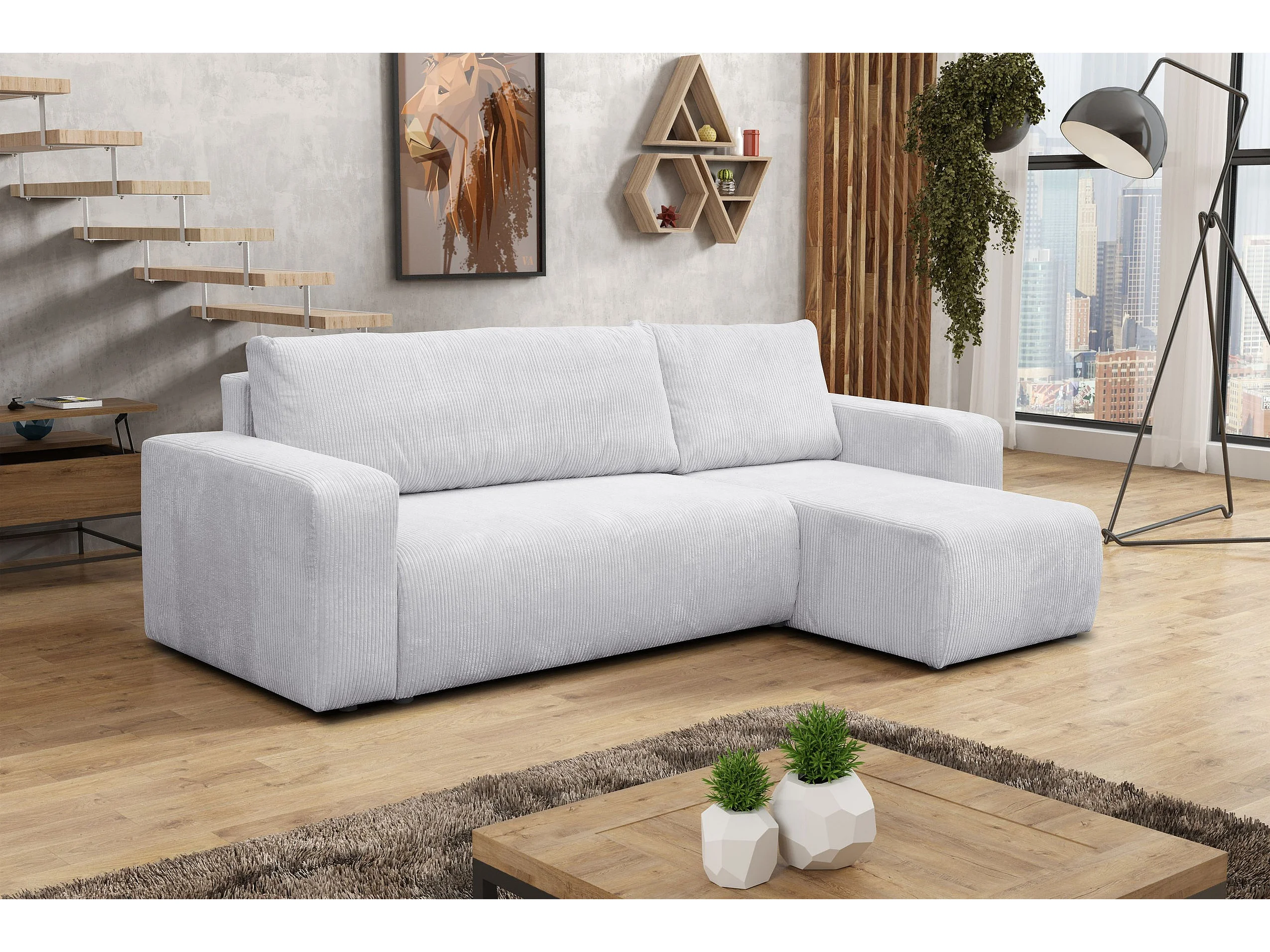 Hoekbank Luna L, hoekbank in L-vorm met slaapfunctie en bedbak, kleur: lichtgrijs, corduroy, universele ottomane