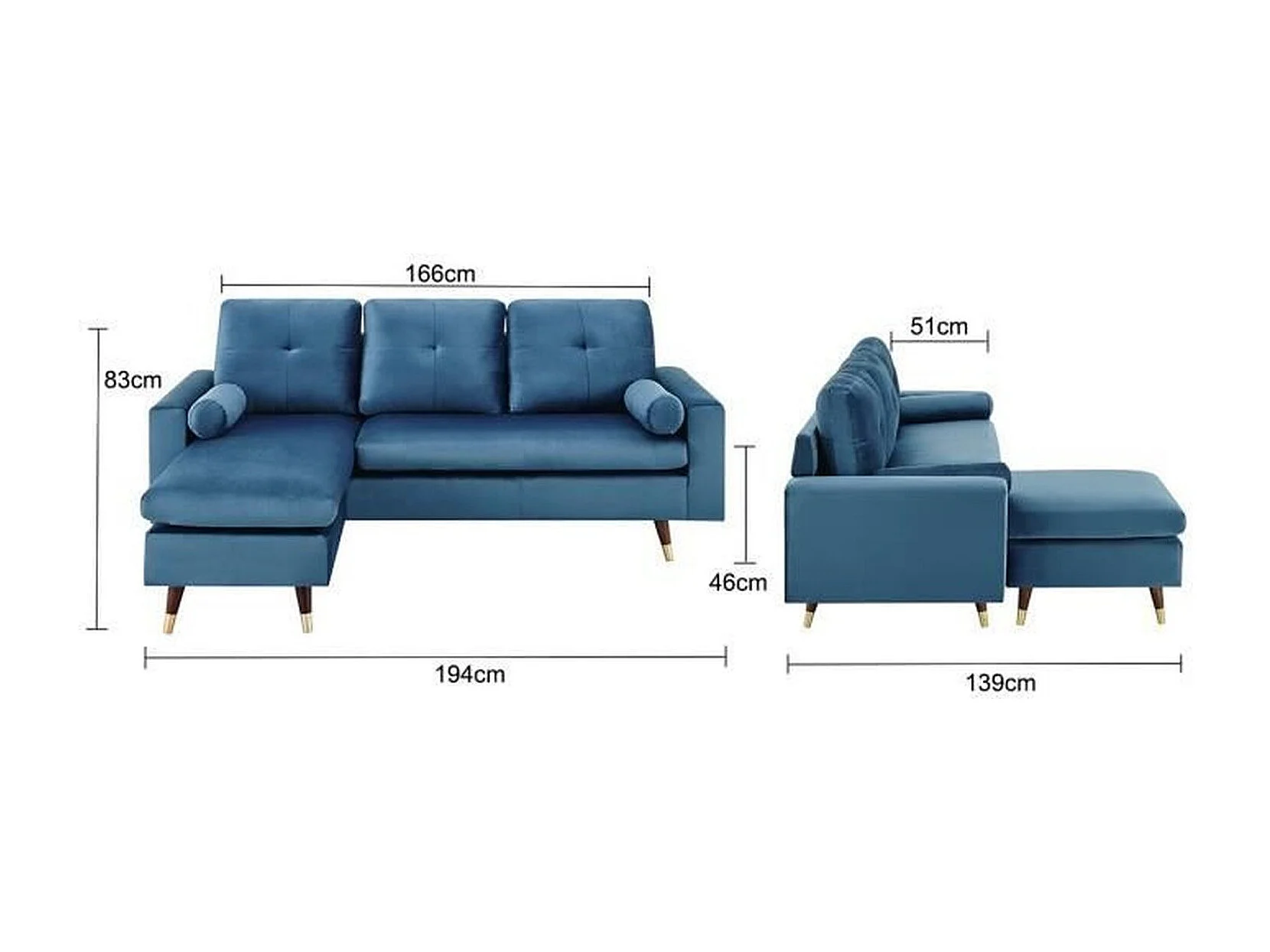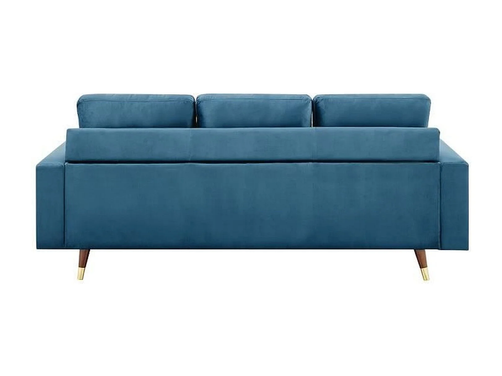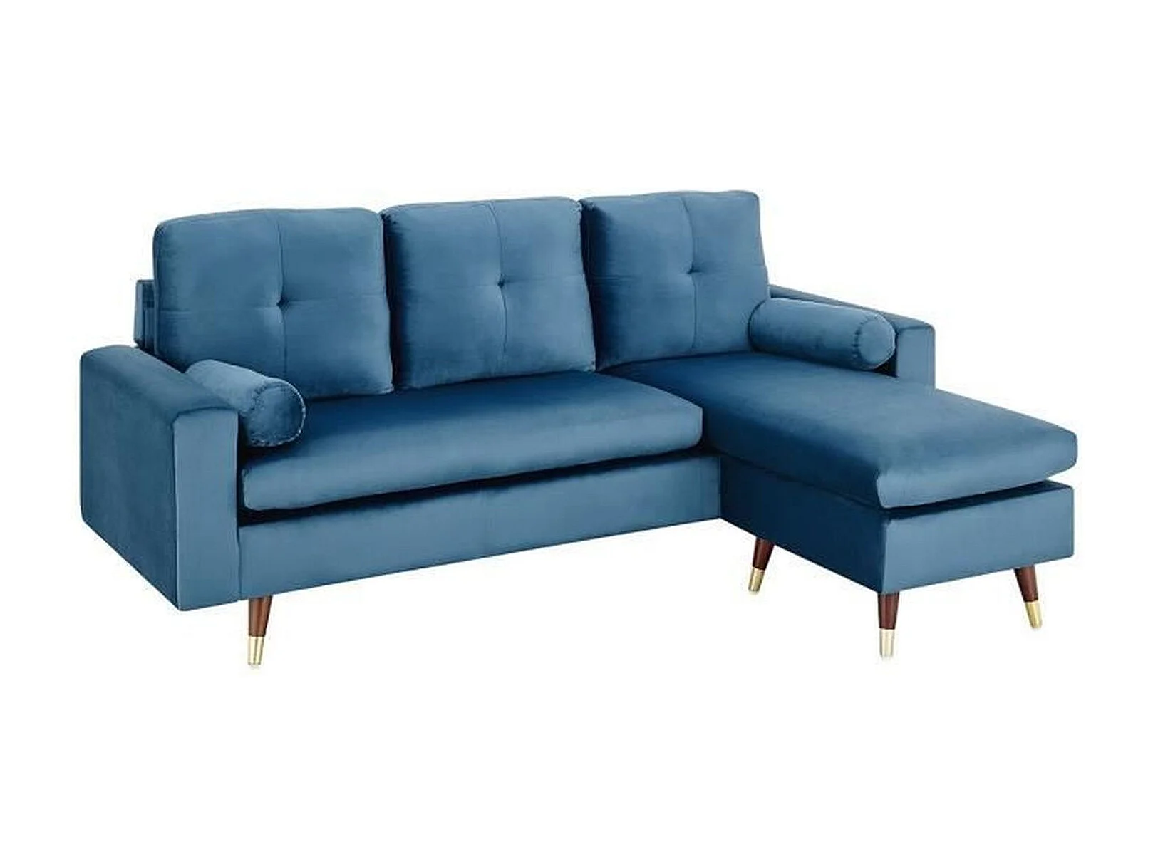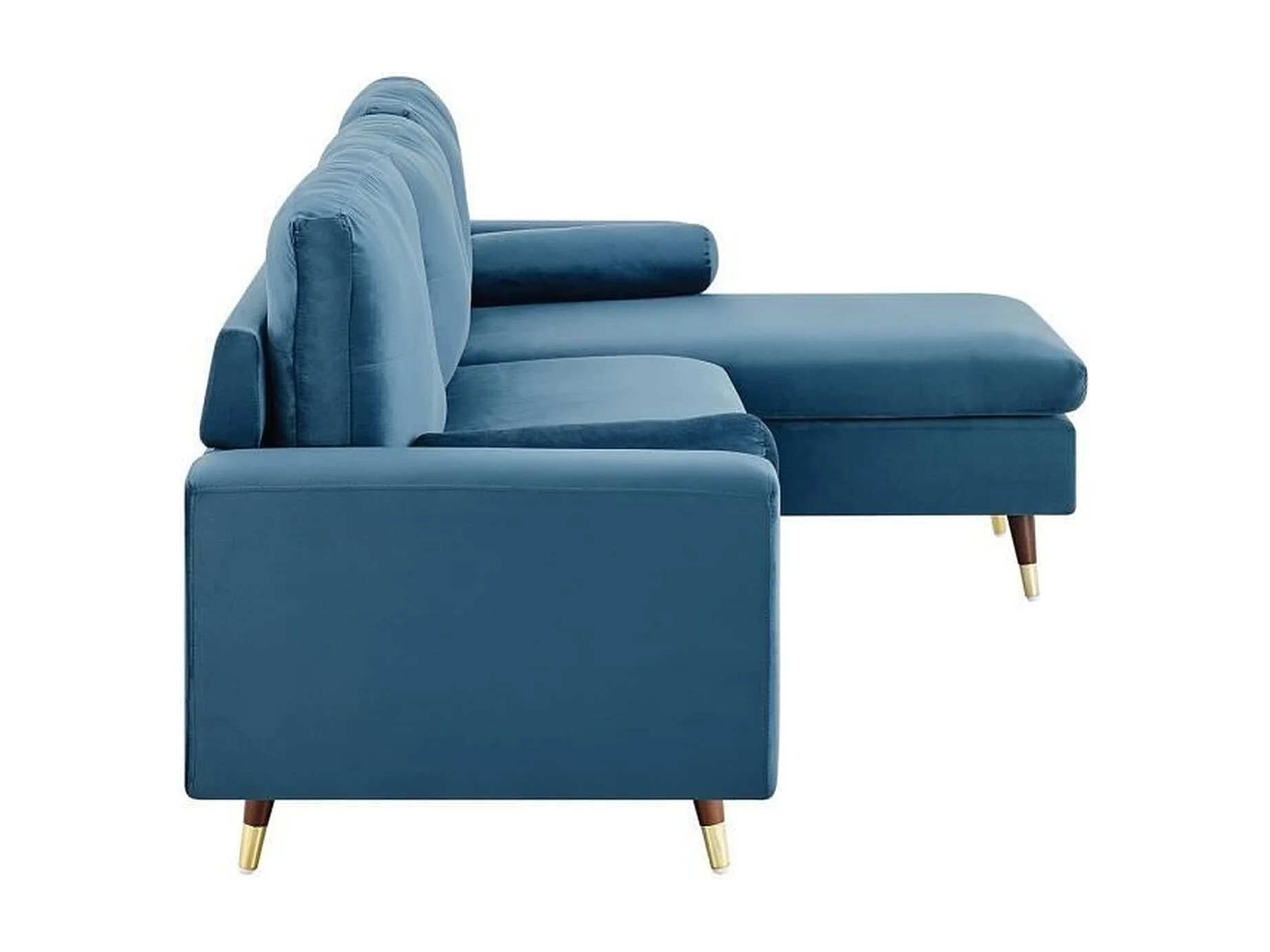 Hoekbank met 3 zitplaatsen van blauwe stof met houten en gouden poten - NEW YORK