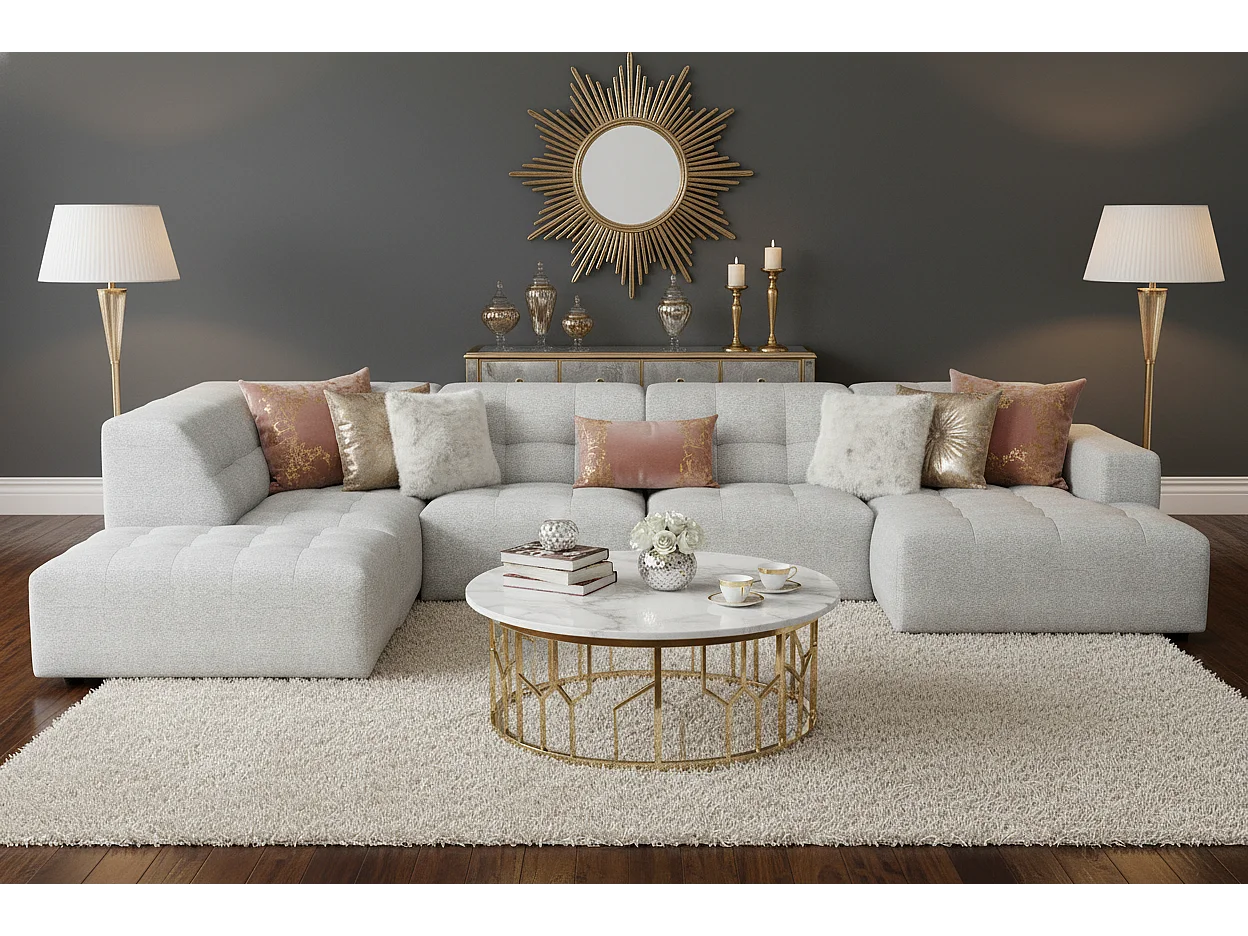 Hoekbank rechts met poef Bergamo C – stof Raven 6 lichtgrijs, 364x262x70 cm