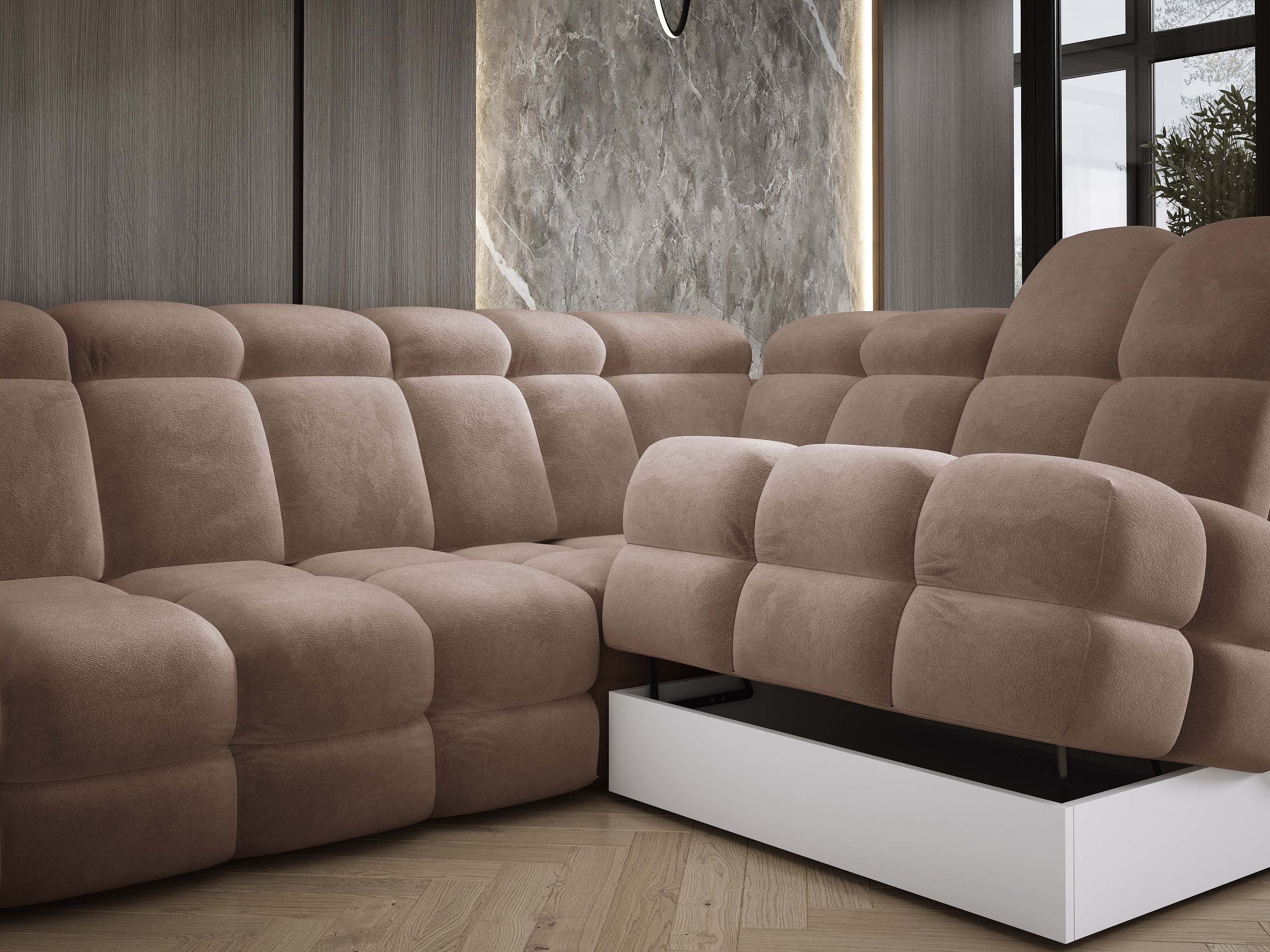 Gestoffeerde hoekbankRAVEN L met bedfunctie, bedruimte separaat, gestoffeerd met verstelbare hoofdsteunen 257x198x96 cm Rechts Bruin