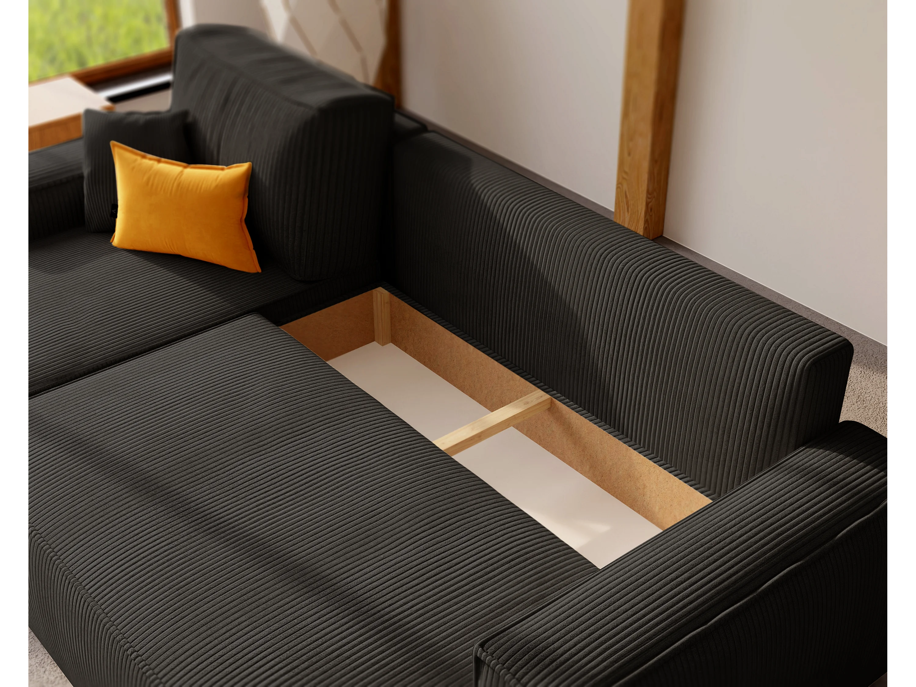 Hoekslaapbank Parijs omkeerbaar om te bouwen tot zwart stoffen.