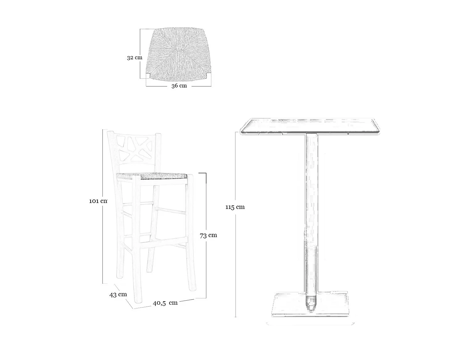 Hoge, elegante barkruk van onbewerkt hout, te schilderen, hoogte 73 cm, met zitting van stro.