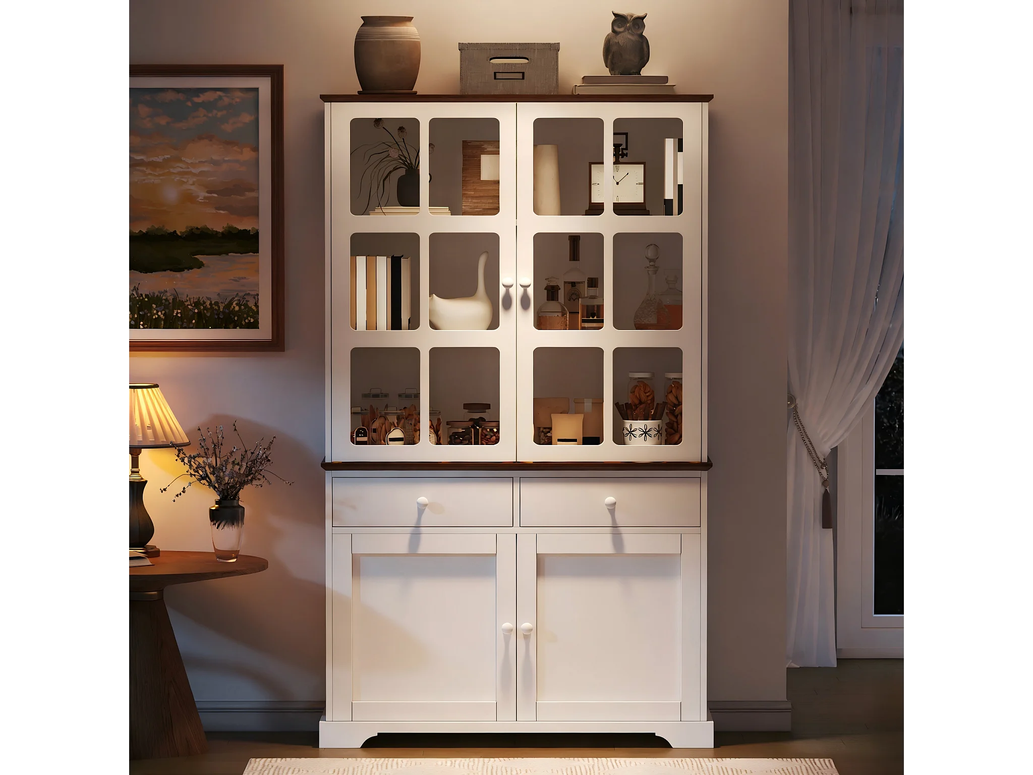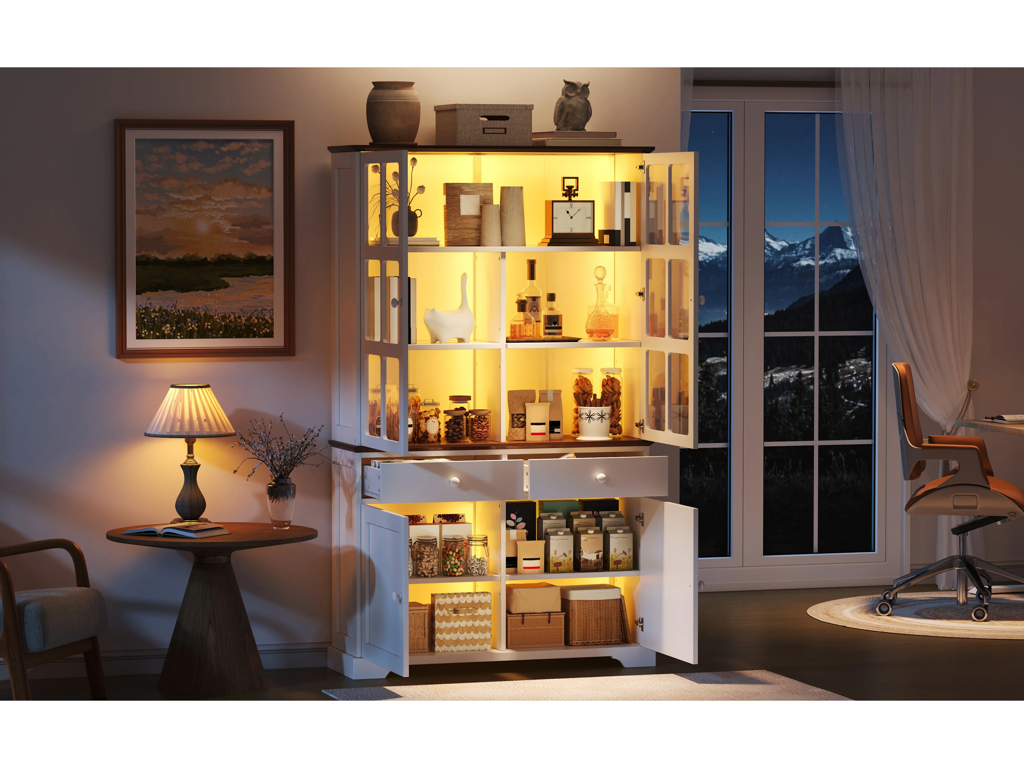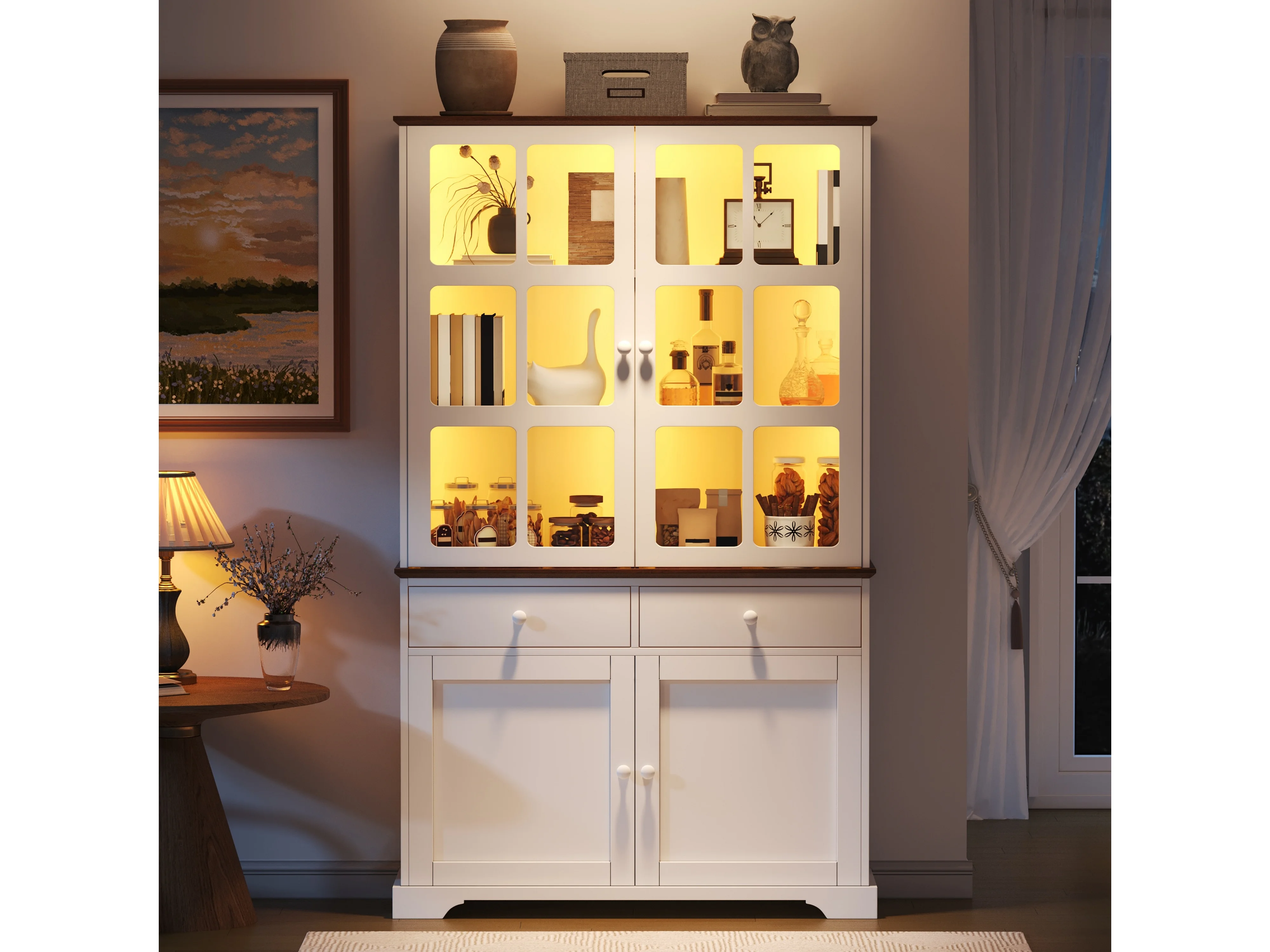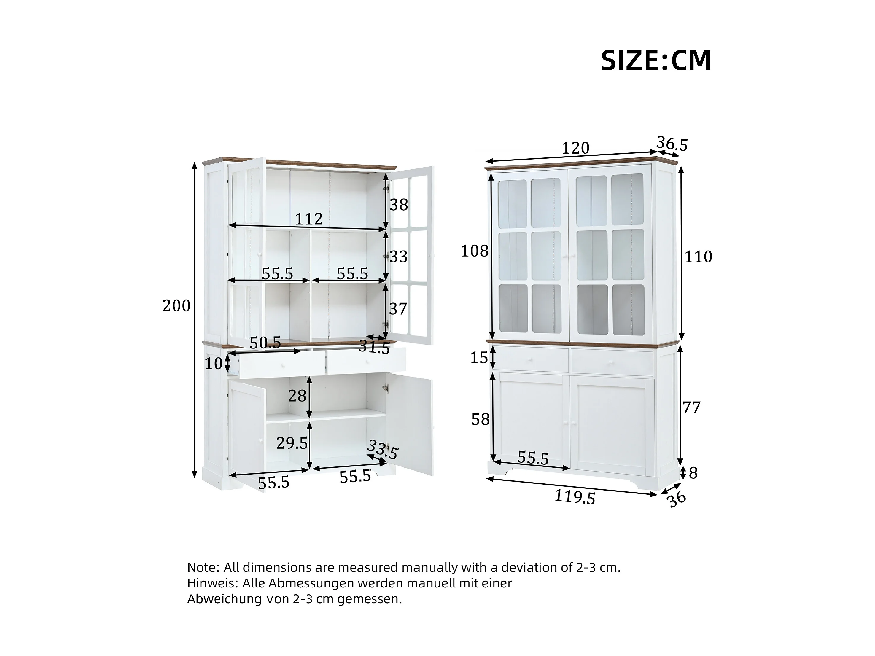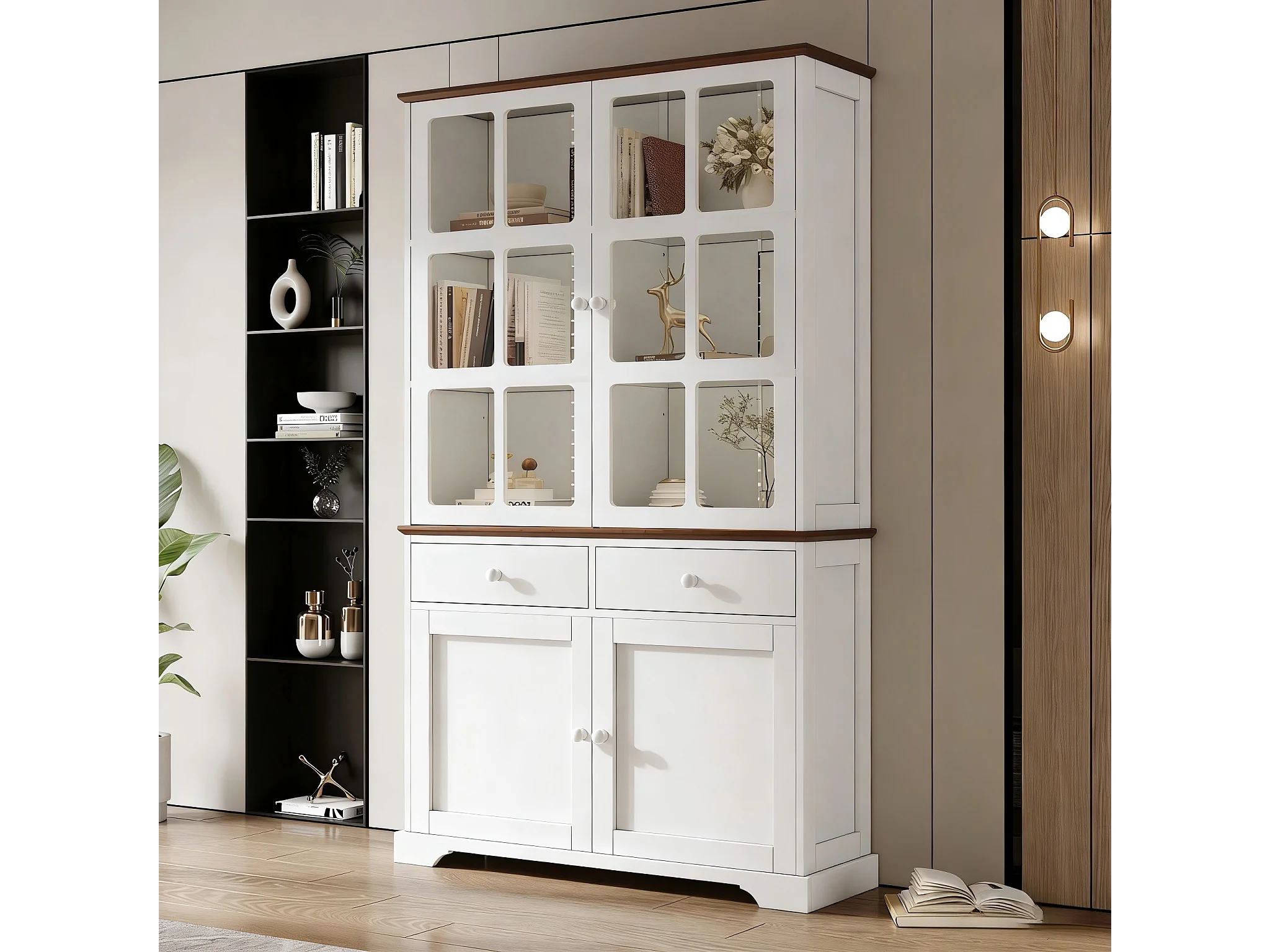 Hoge glazen vitrinekast - 120 x 36,5 x 200 cm - met 2 lades + 4 deuren + LED-verlichting - woonkamermeubel - MDF - wit