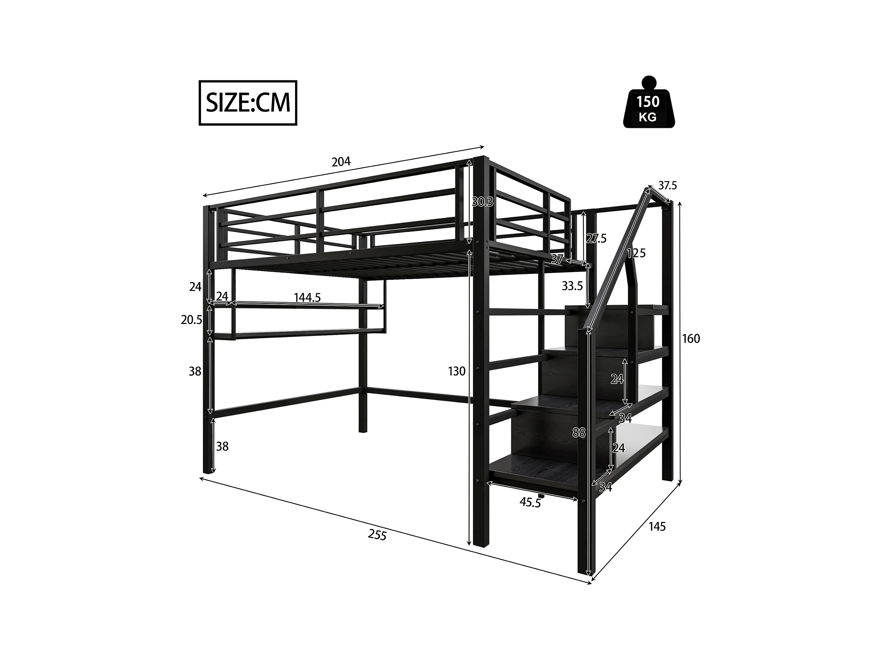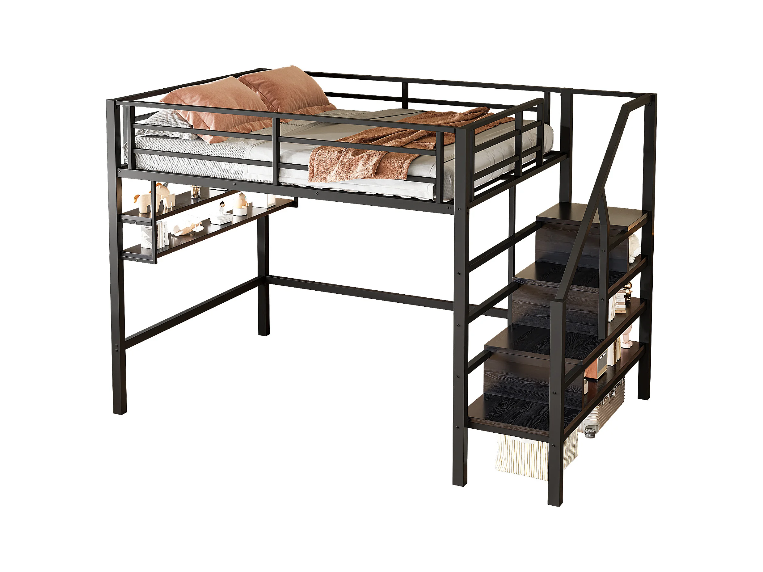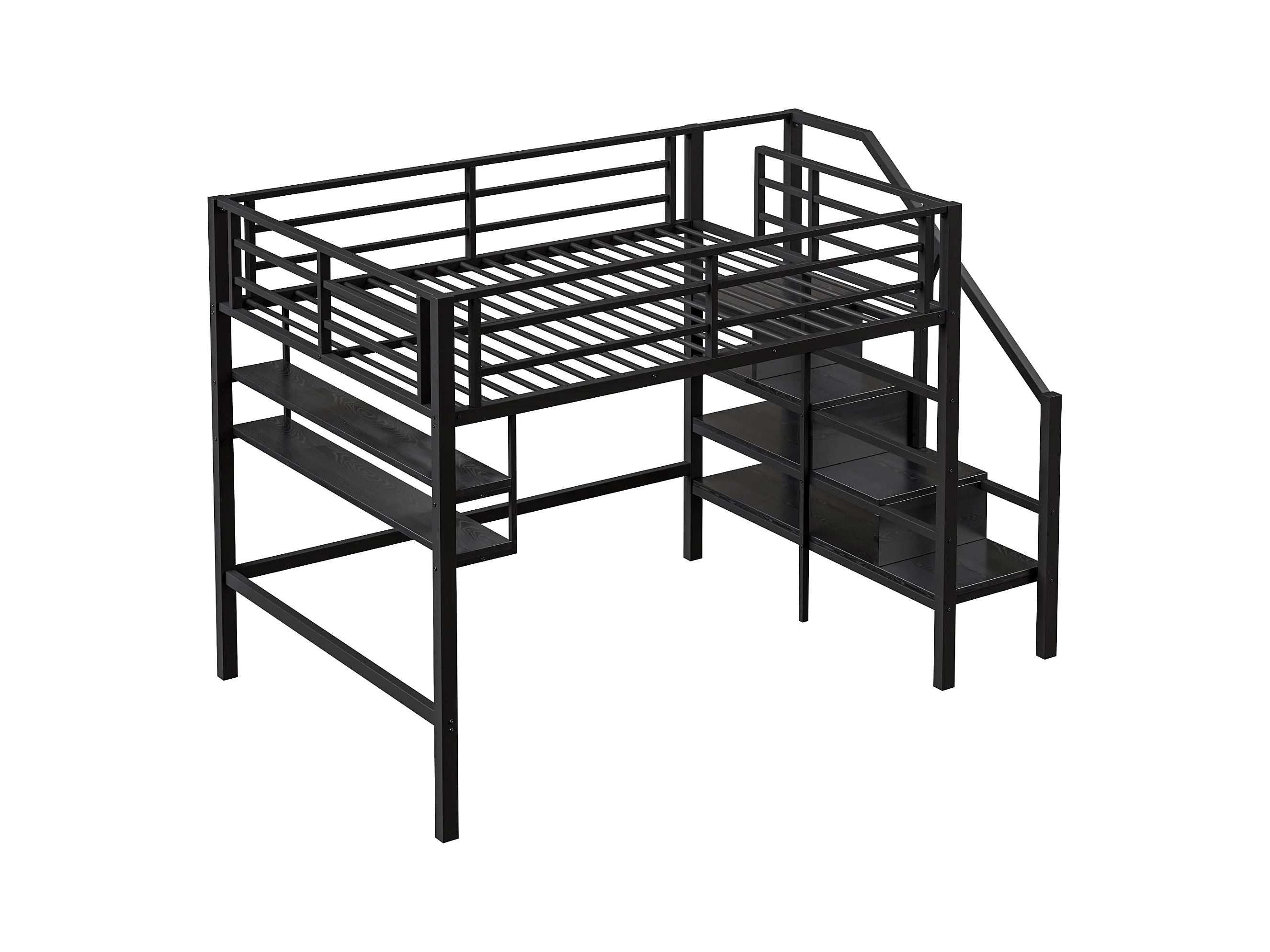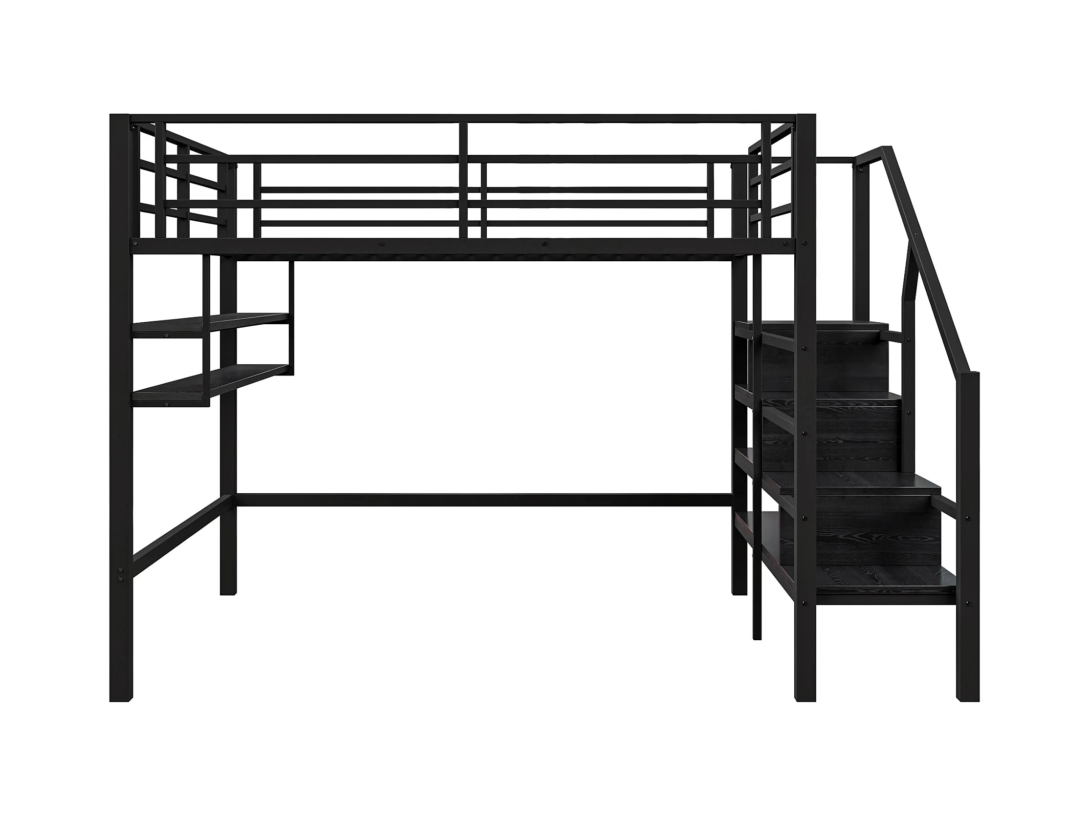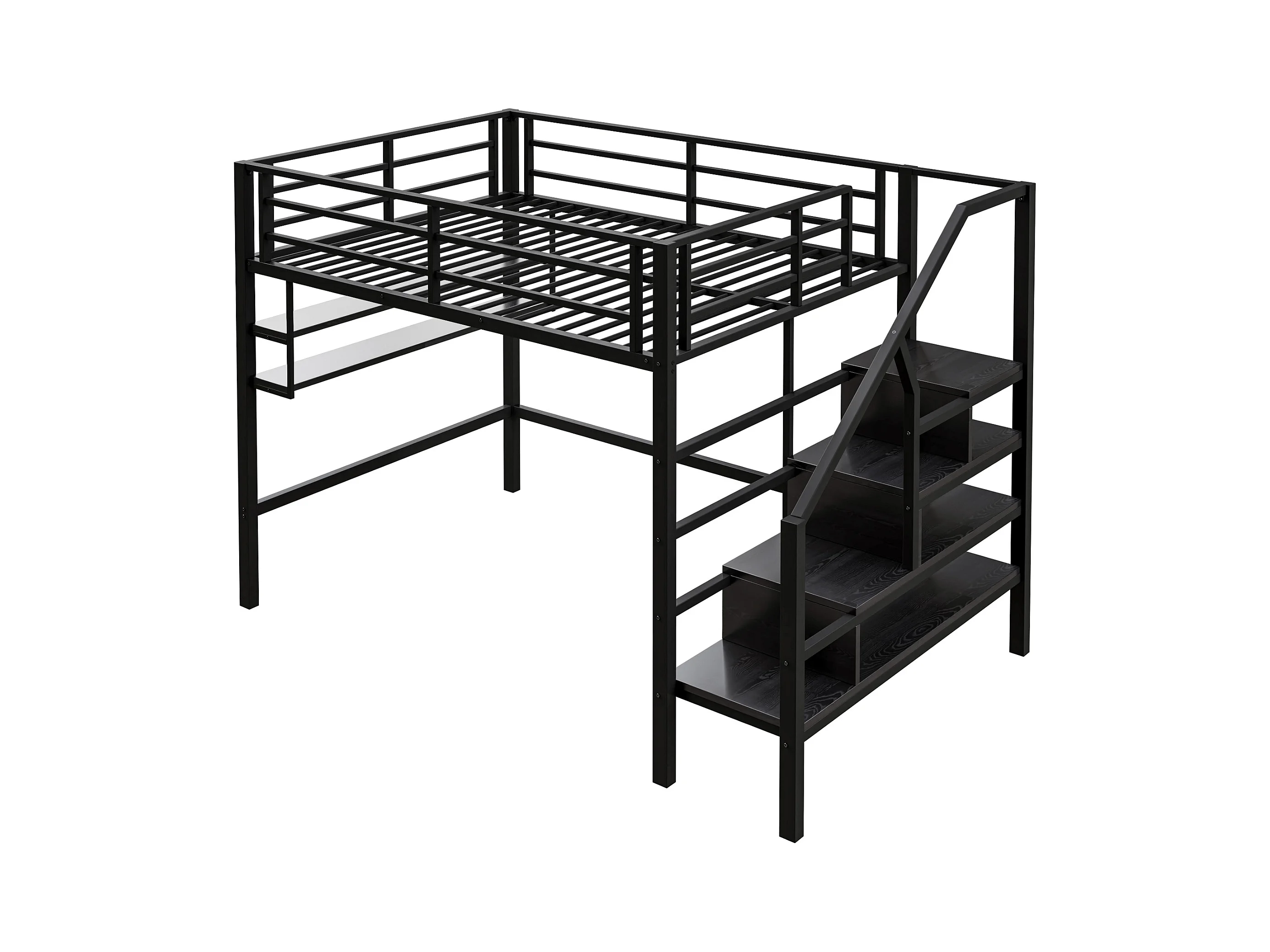 Hoogslaper 140 x 200 cm met LED, opbergladder, planken, bureau, zonder matras, zwart (225 x 145 x 160 cm)