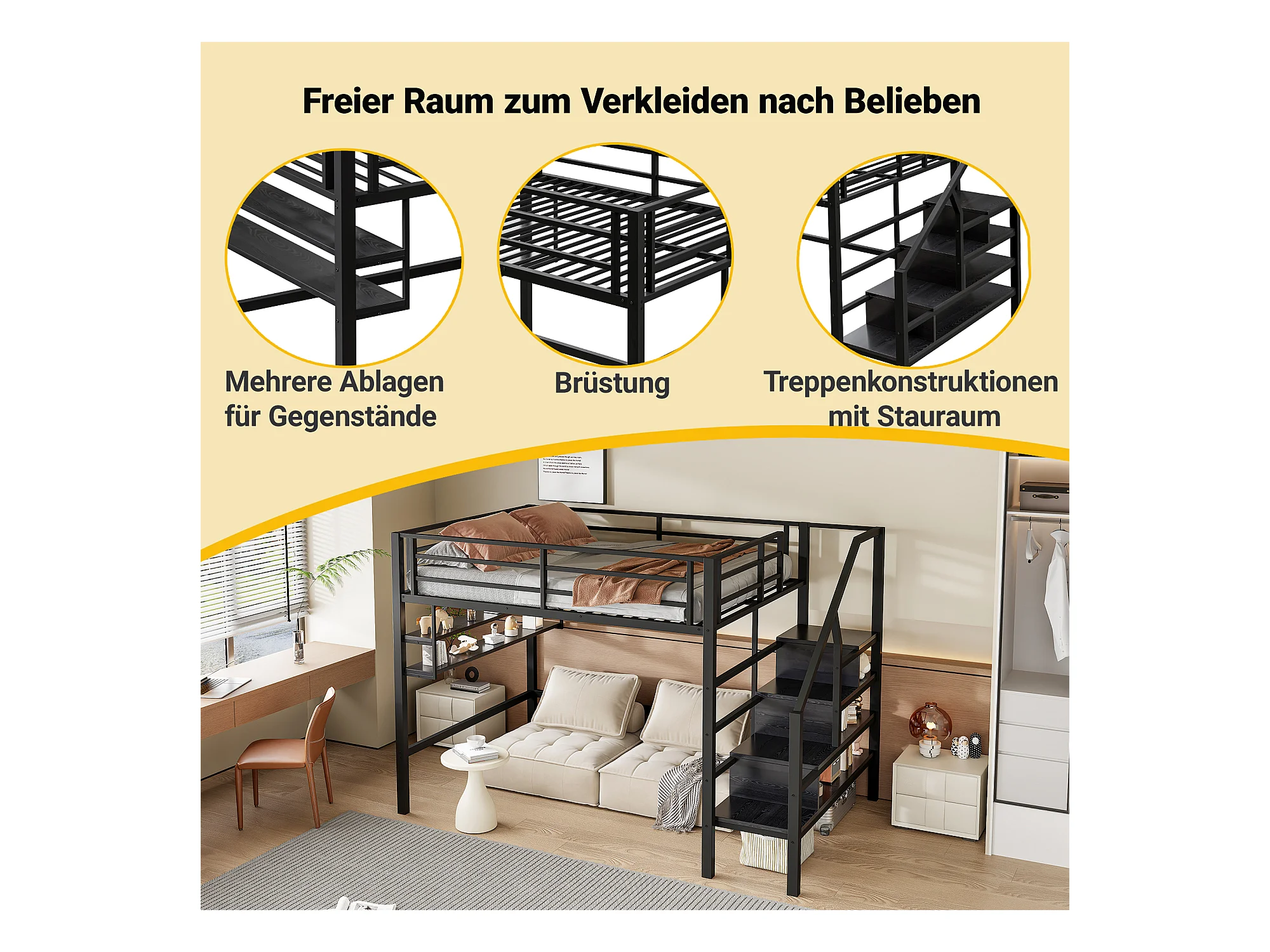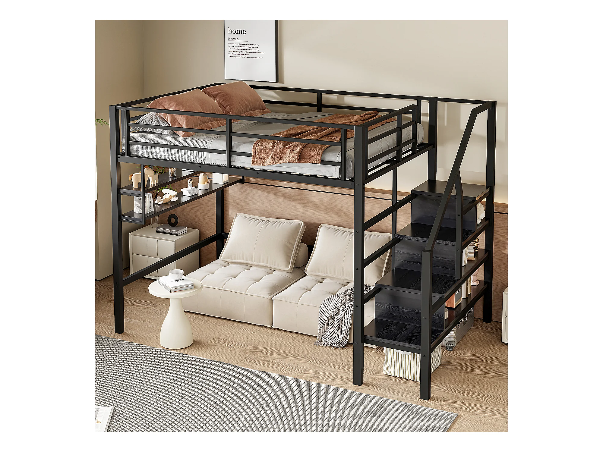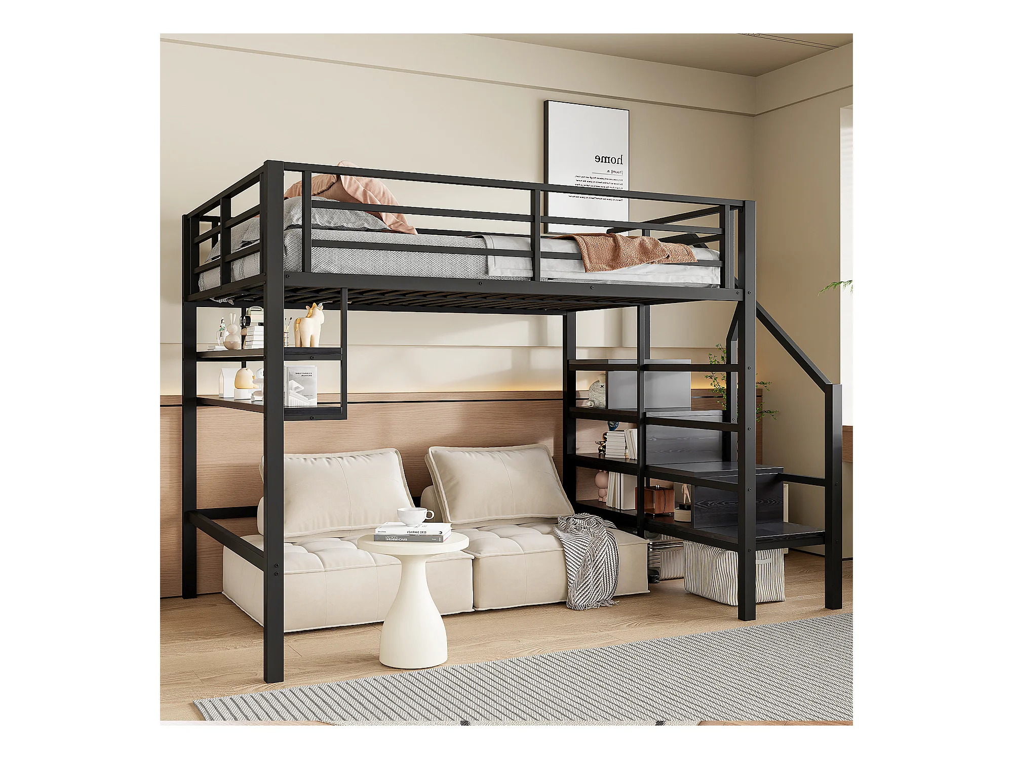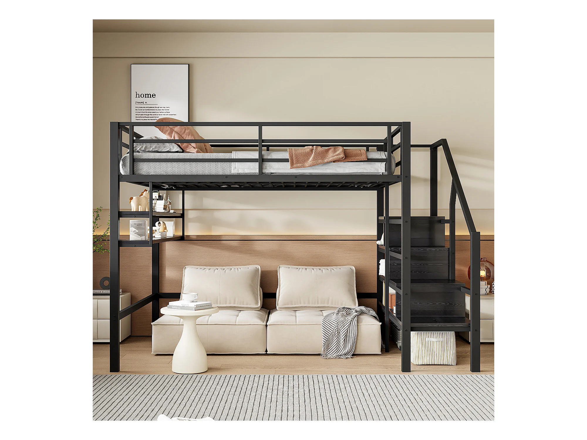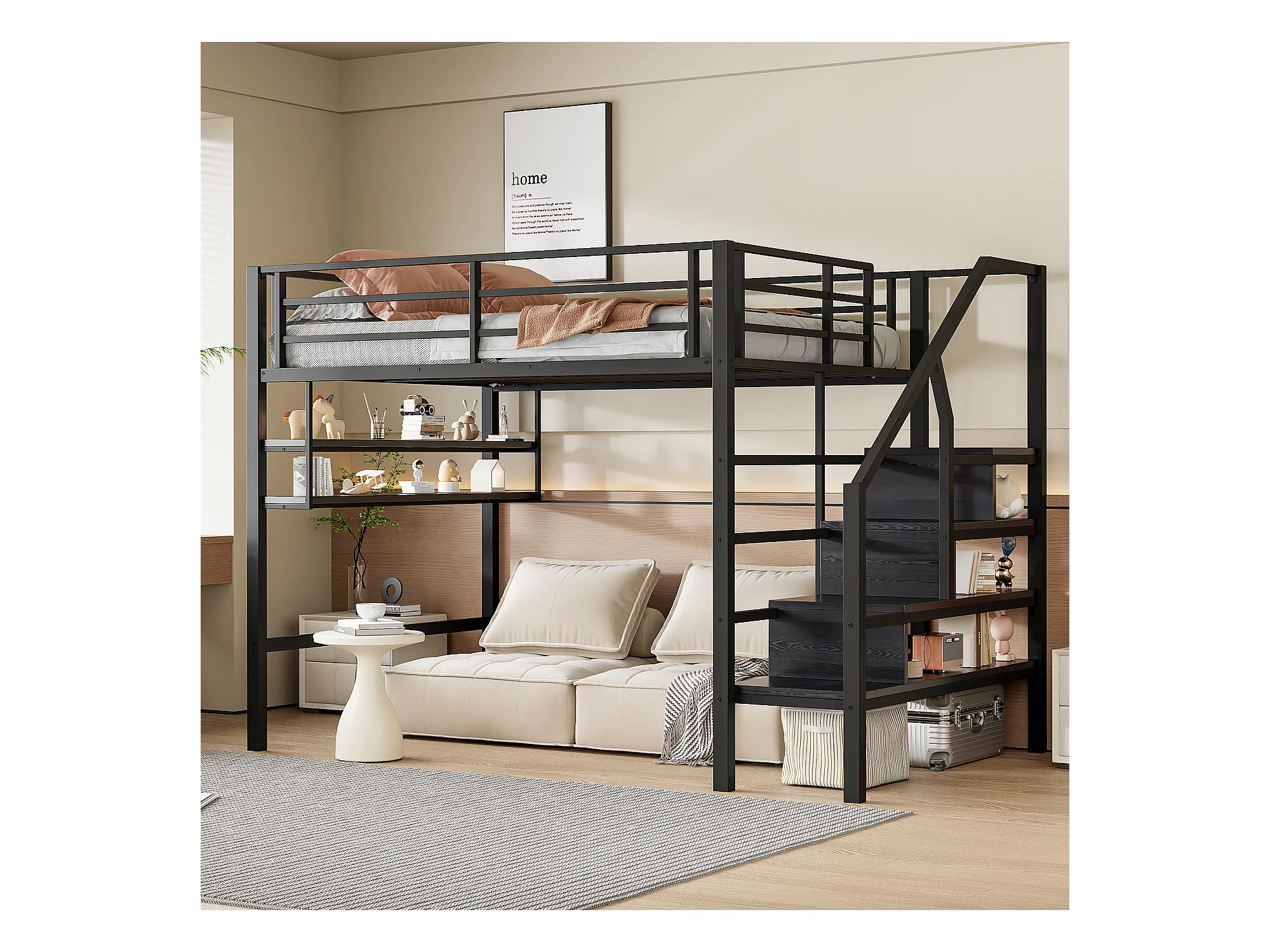 Hoogslaper 140 x 200 cm met LED, opbergladder, planken, bureau, zonder matras, zwart (225 x 145 x 160 cm)