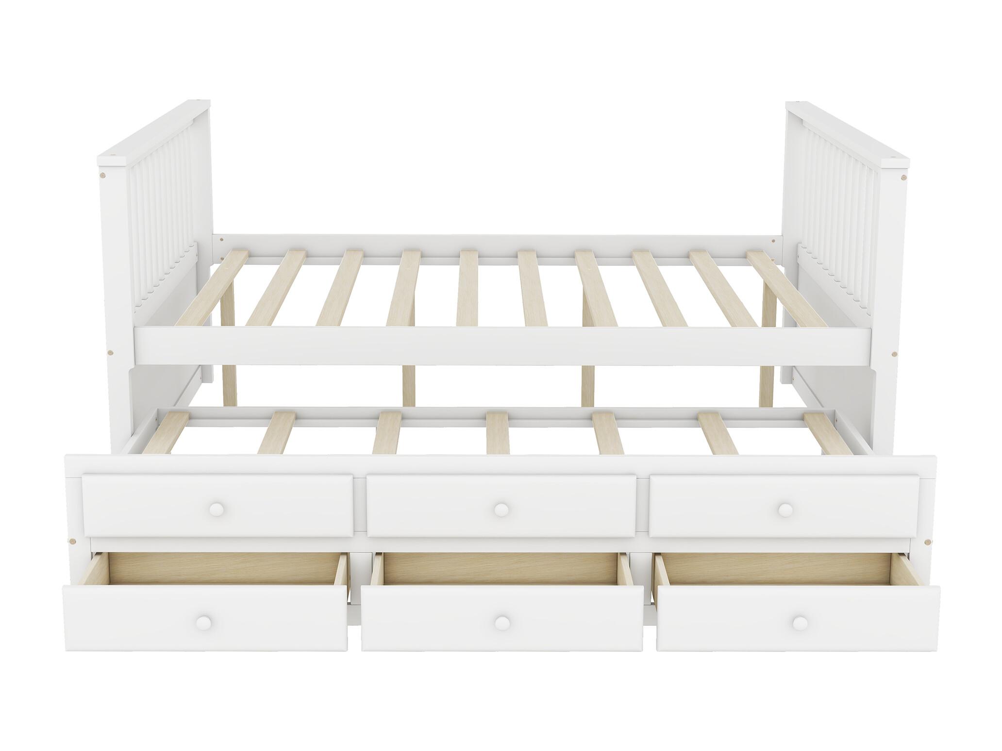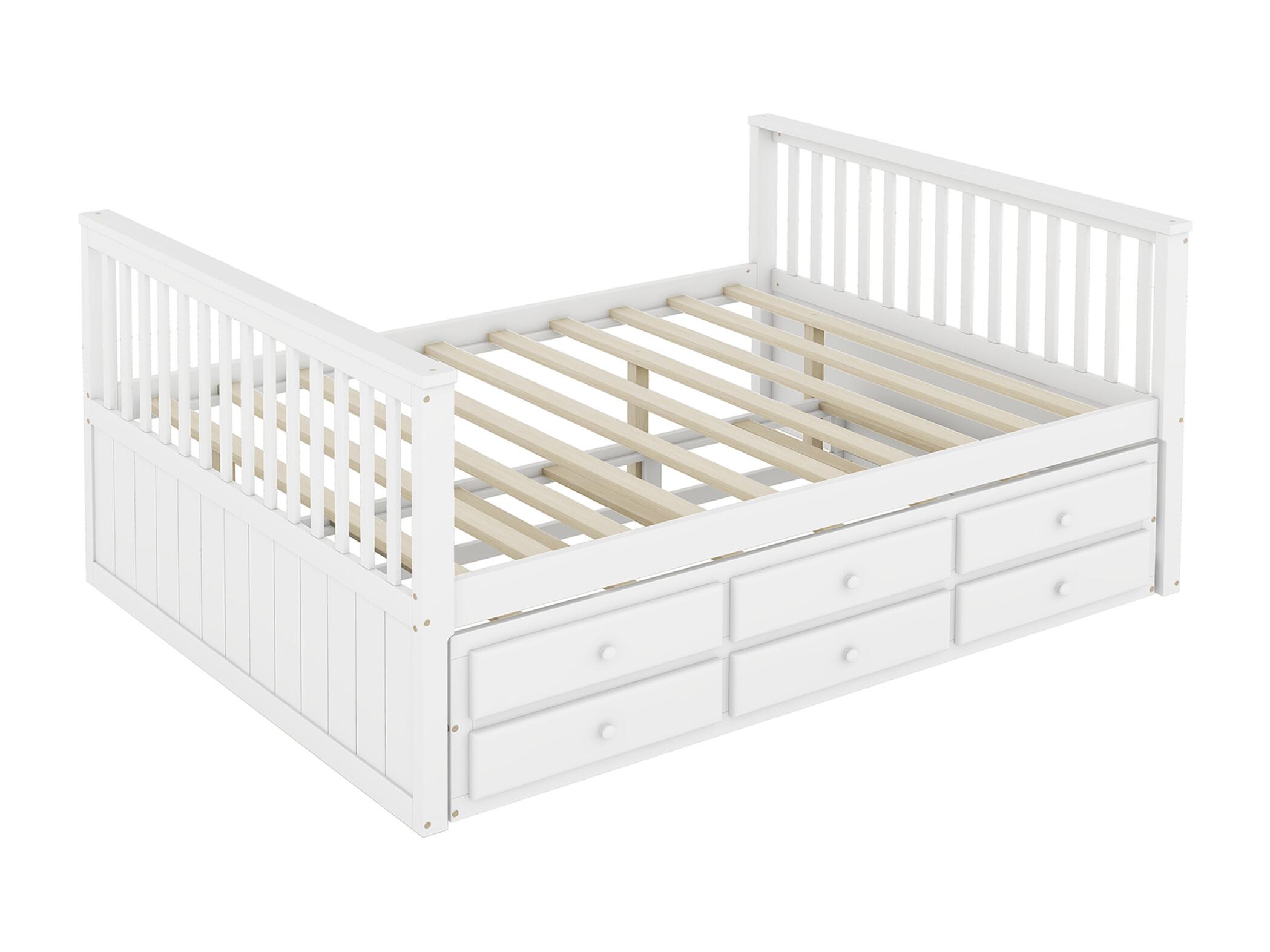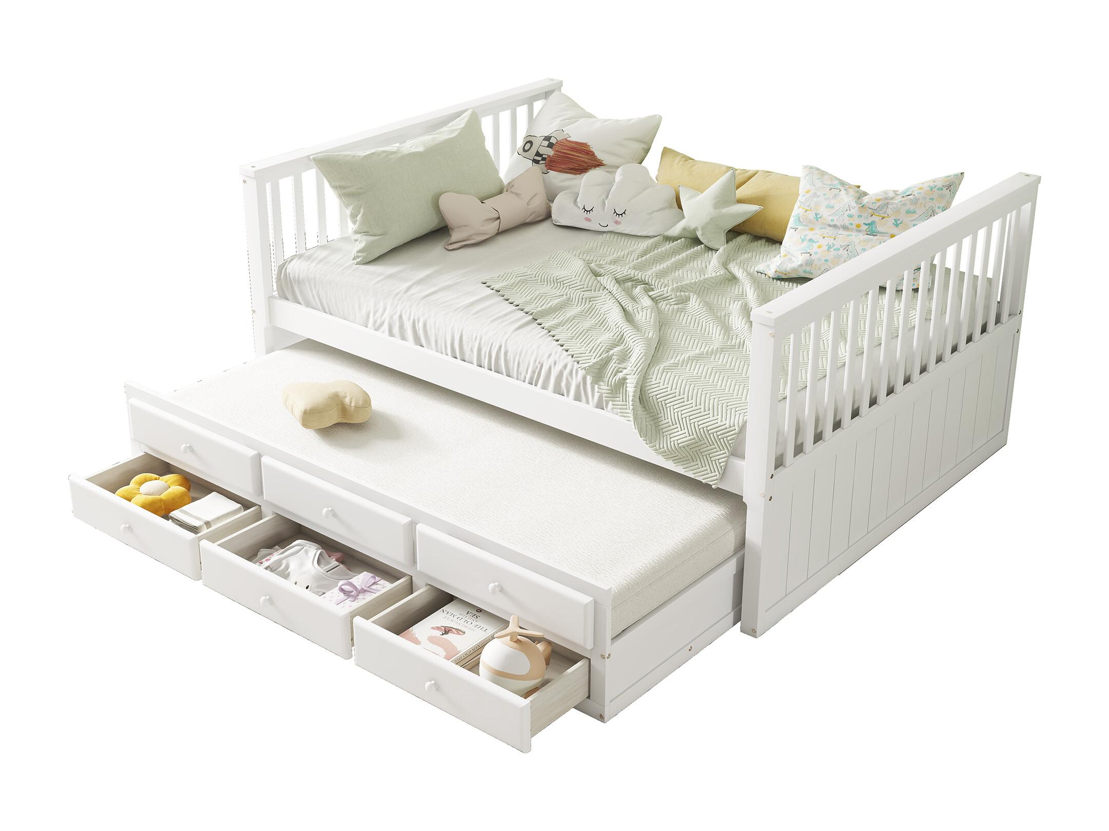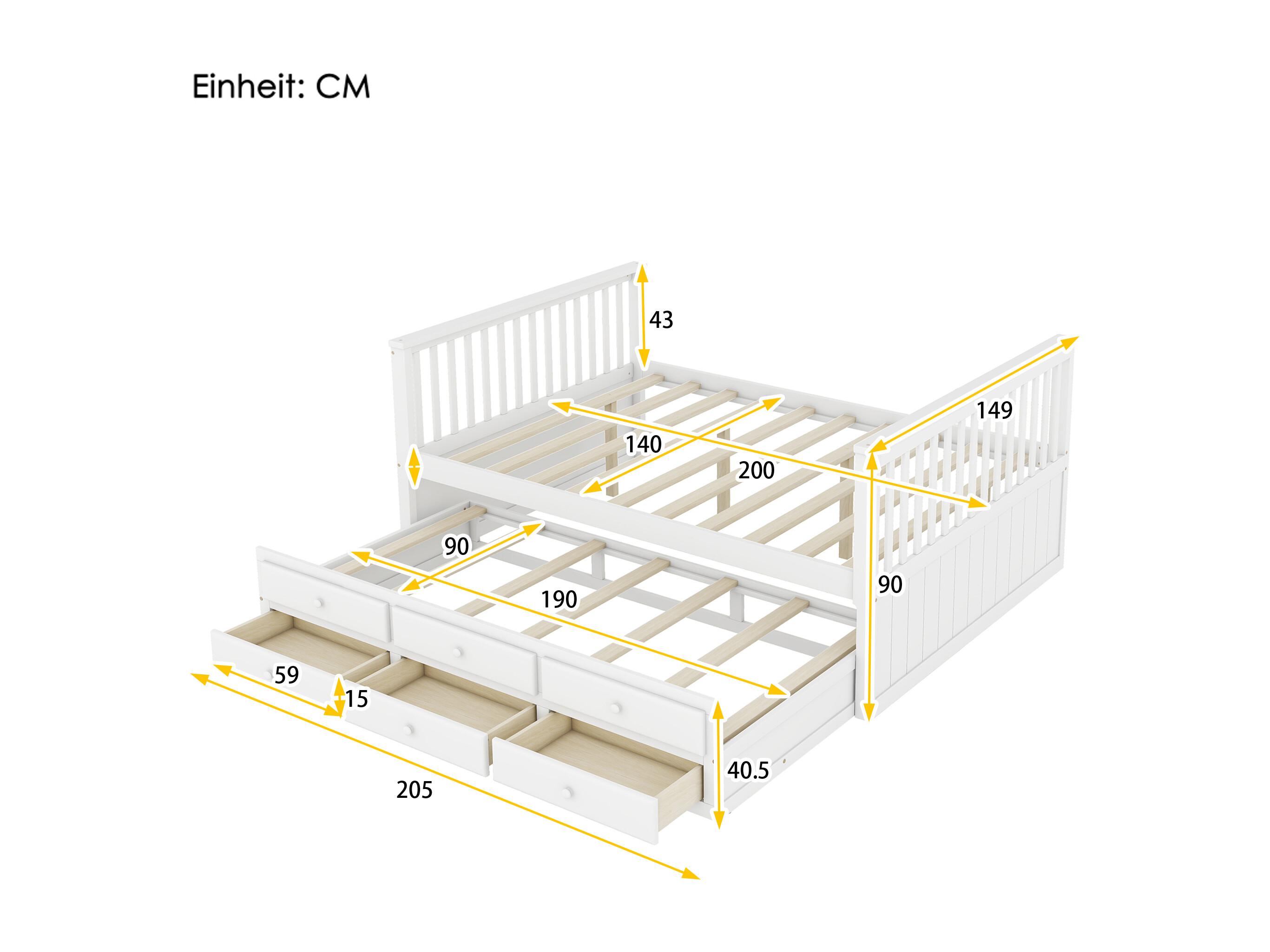 Opbergbed 140x200cm, massief houten combinatiebed, tweepersoons opbergbed, wit