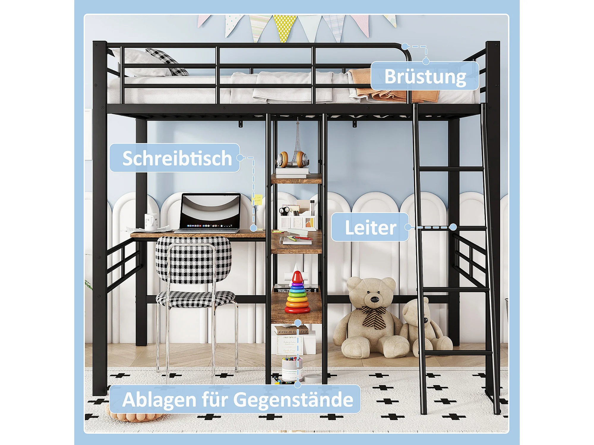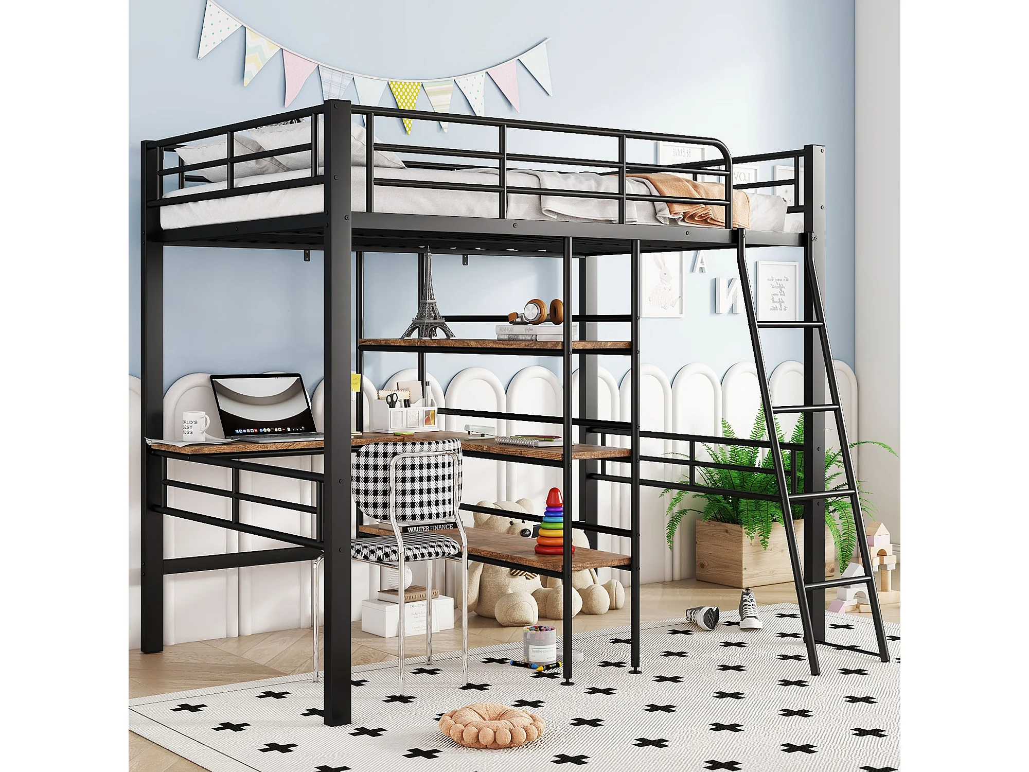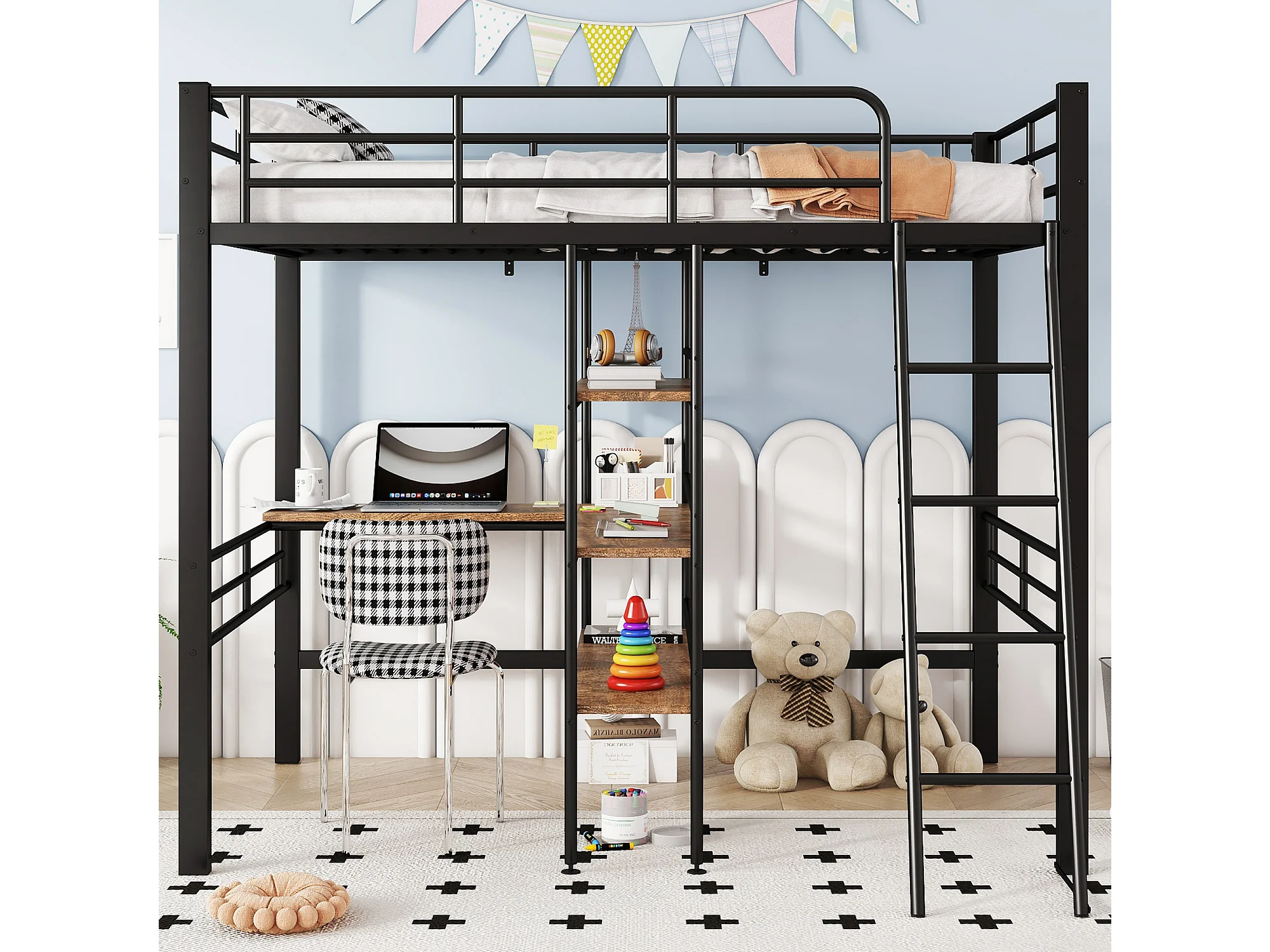 Hoogslaper 90 x 200 cm, zonder matras, met bureau, opbergladder, uitvalbeveiliging, metalen frame, zwart (204x134x174 cm)