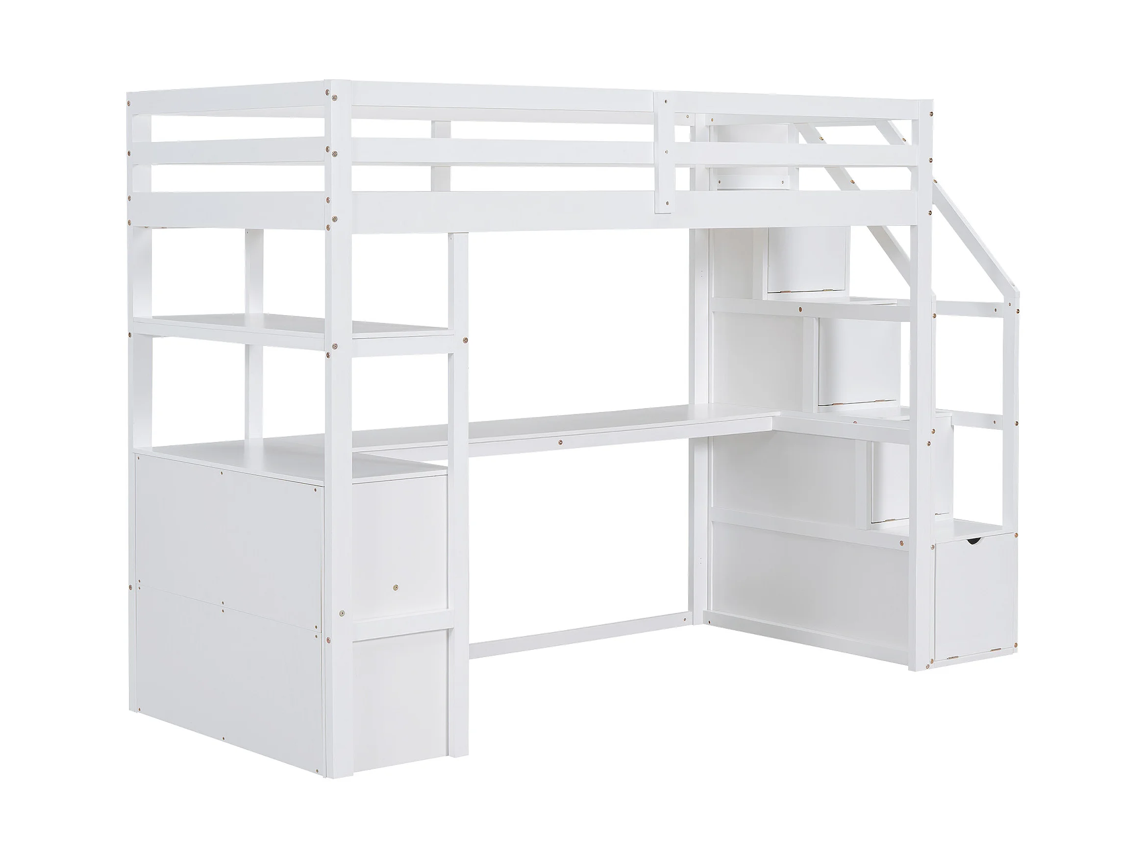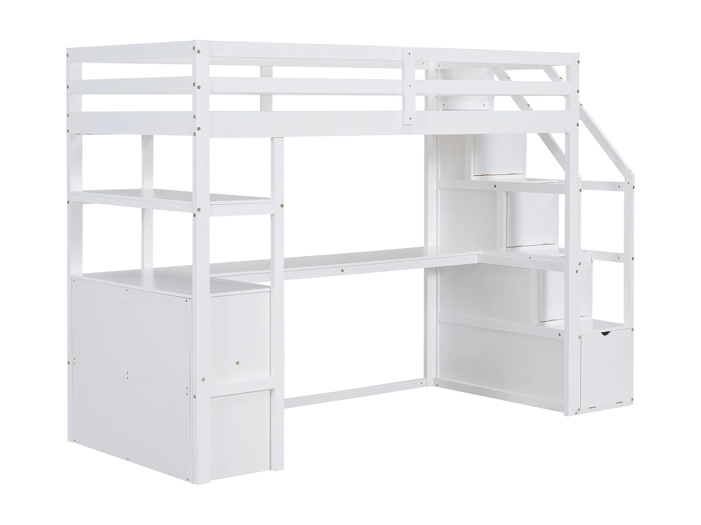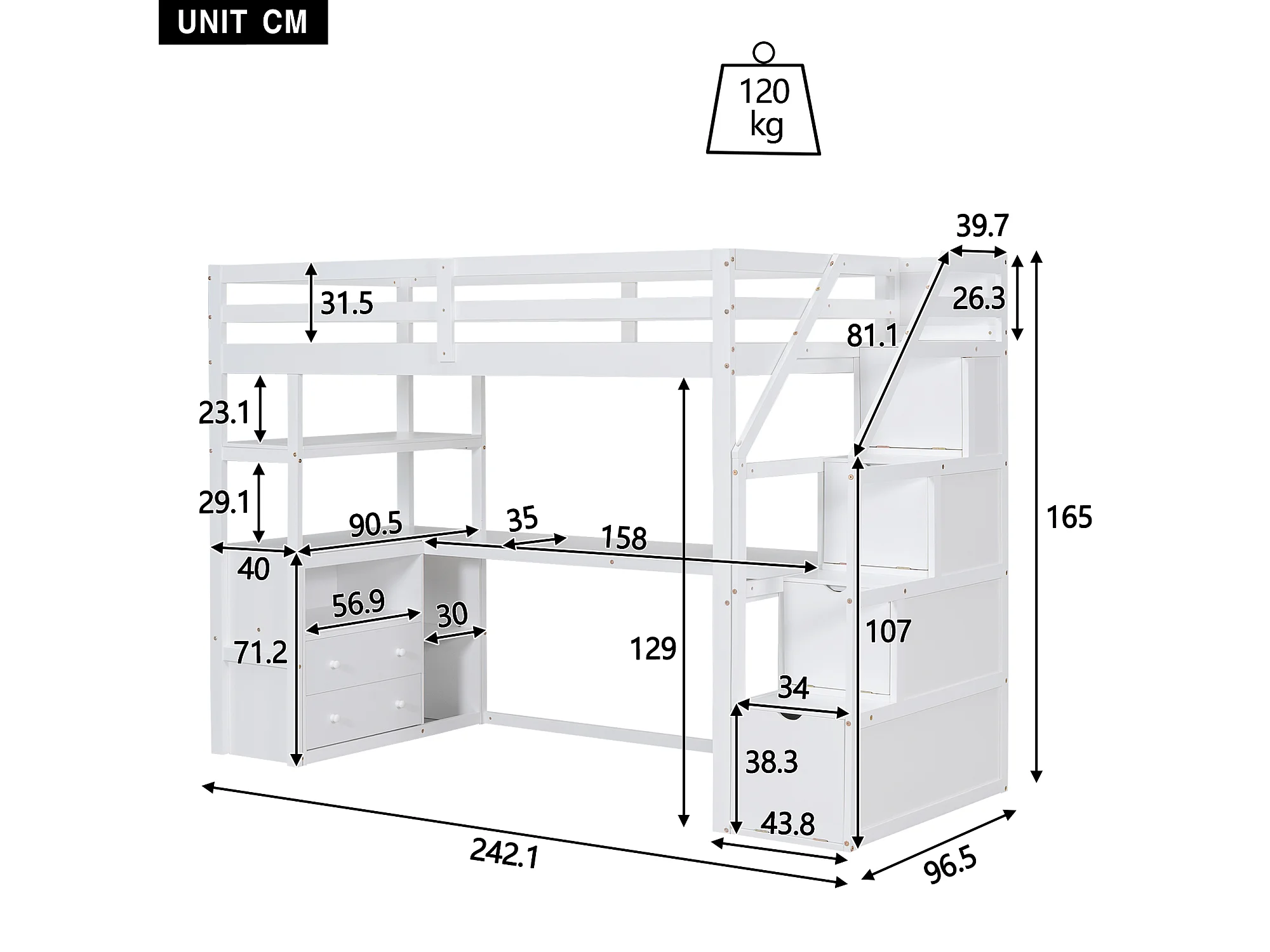 Hoogslaper 90x200 cm, bed met bureau en opbergladder, wit, grenen en MDF (242,1x96,5x165 cm)