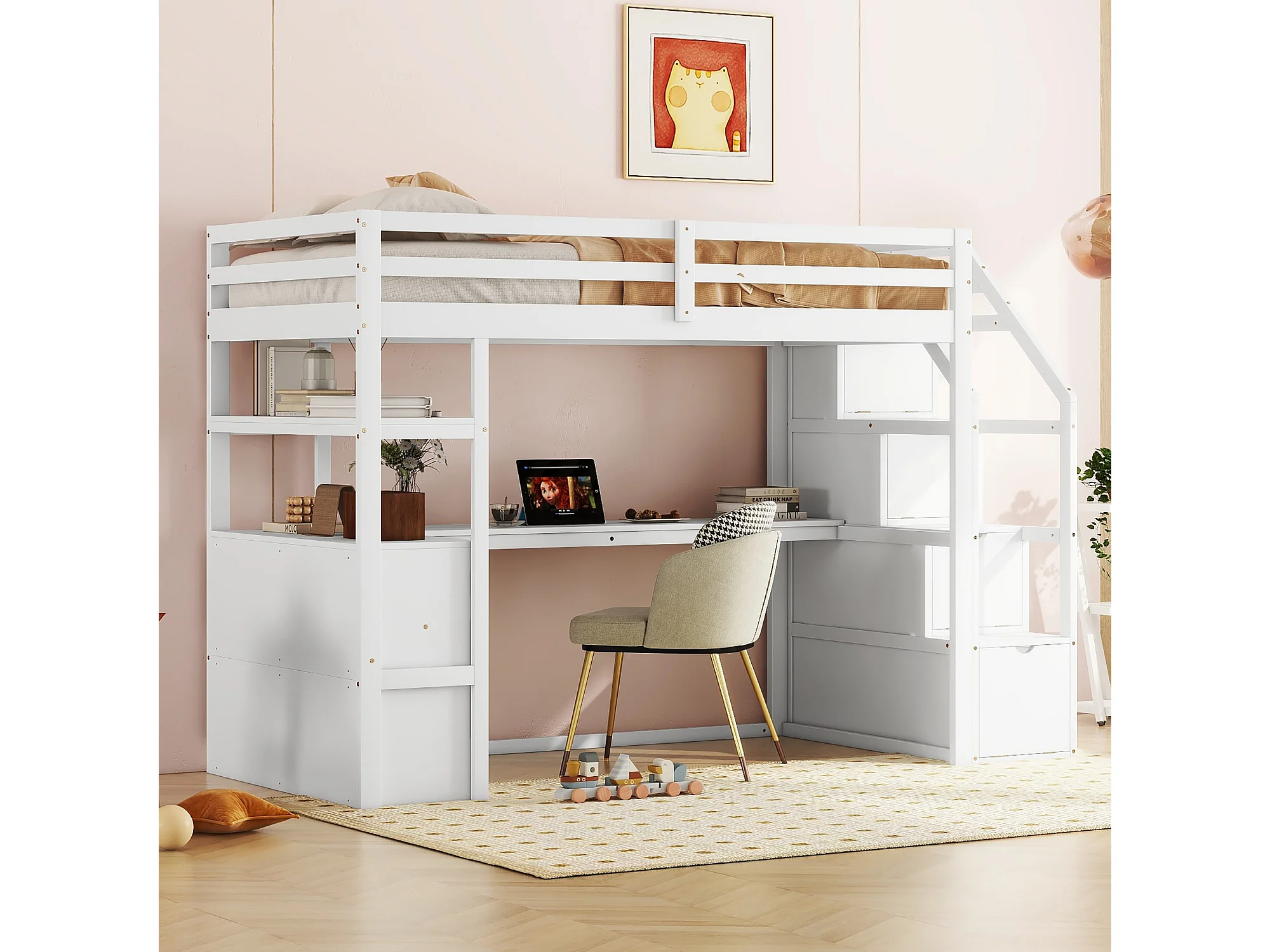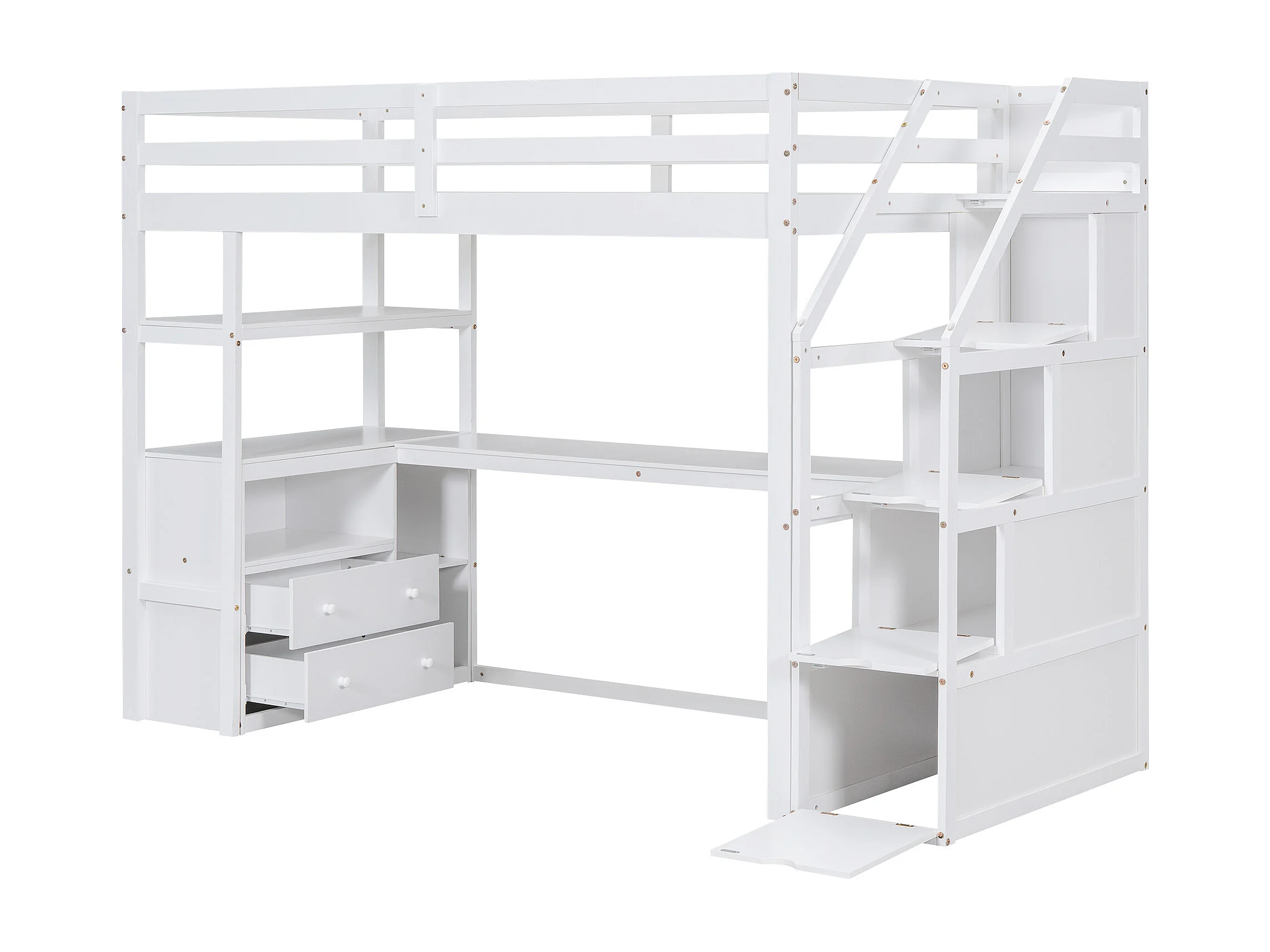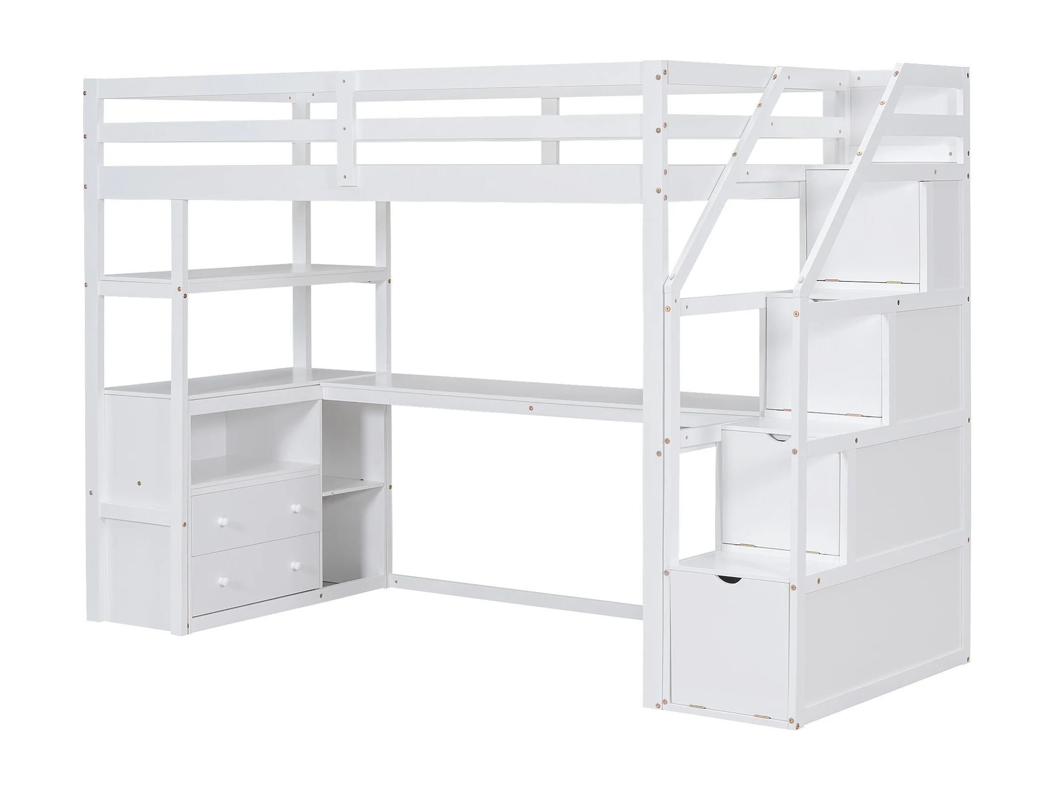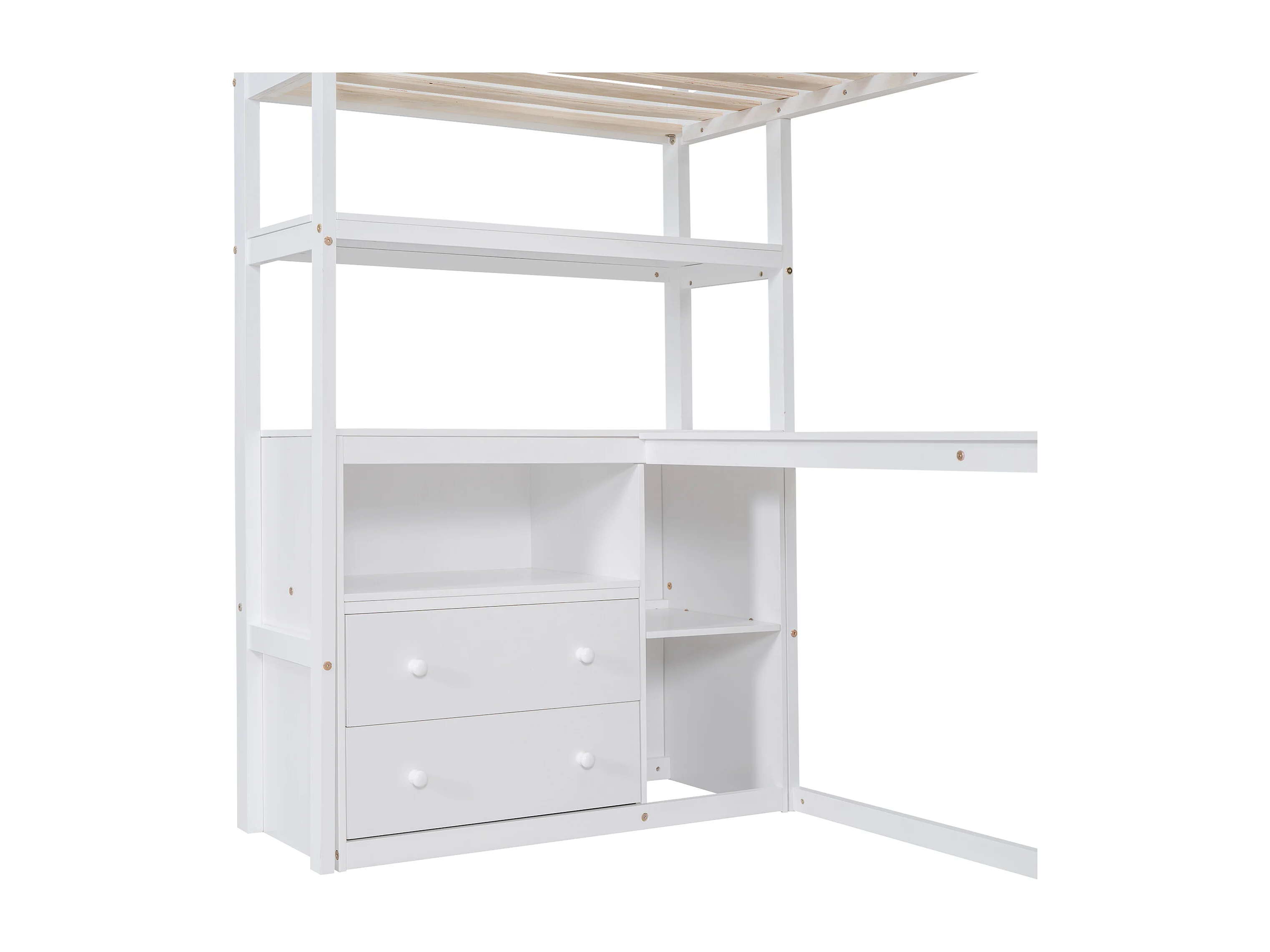 Hoogslaper 90x200 cm, bed met bureau en opbergladder, wit, grenen en MDF (242,1x96,5x165 cm)