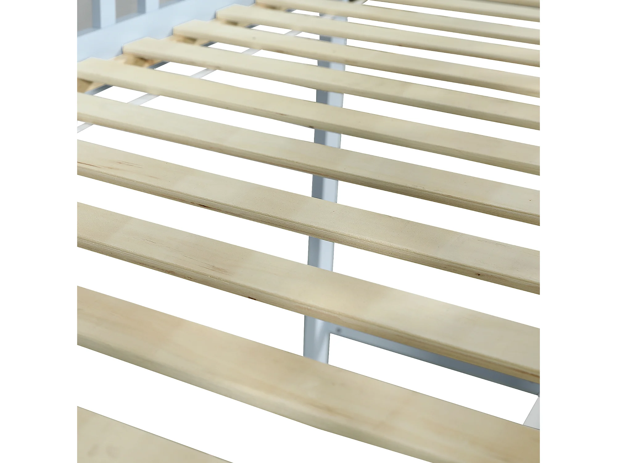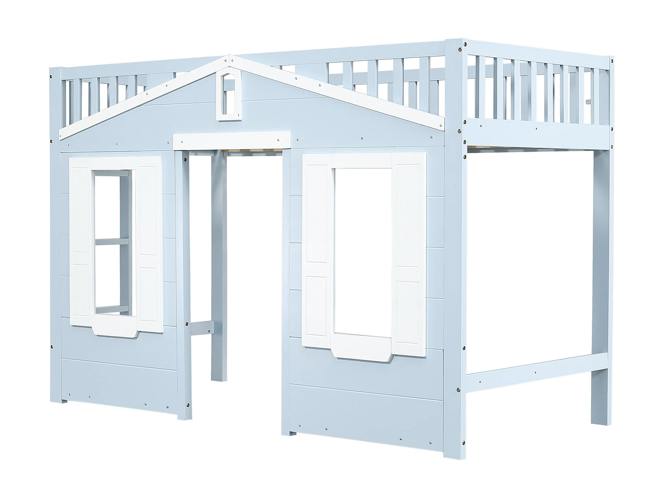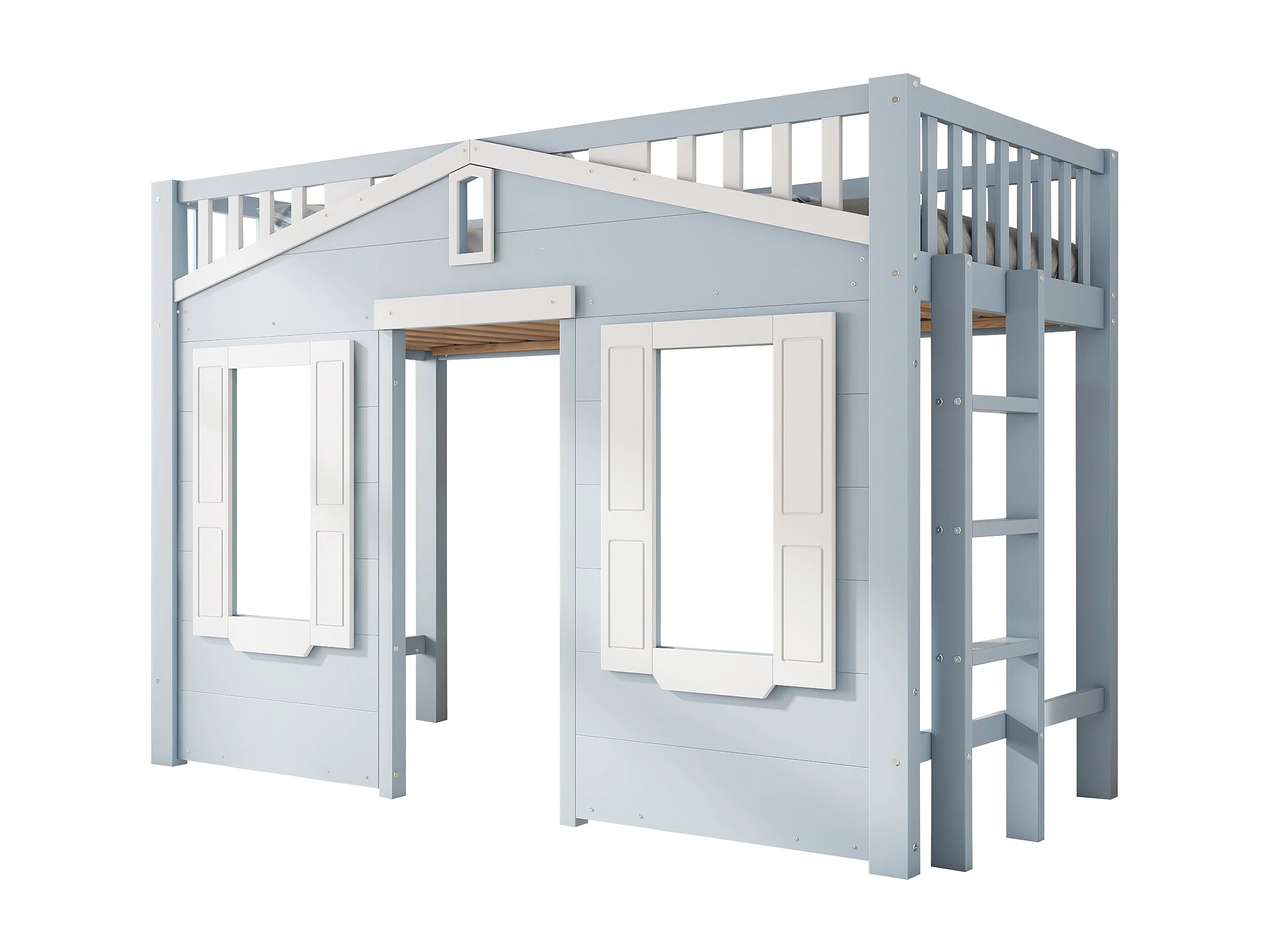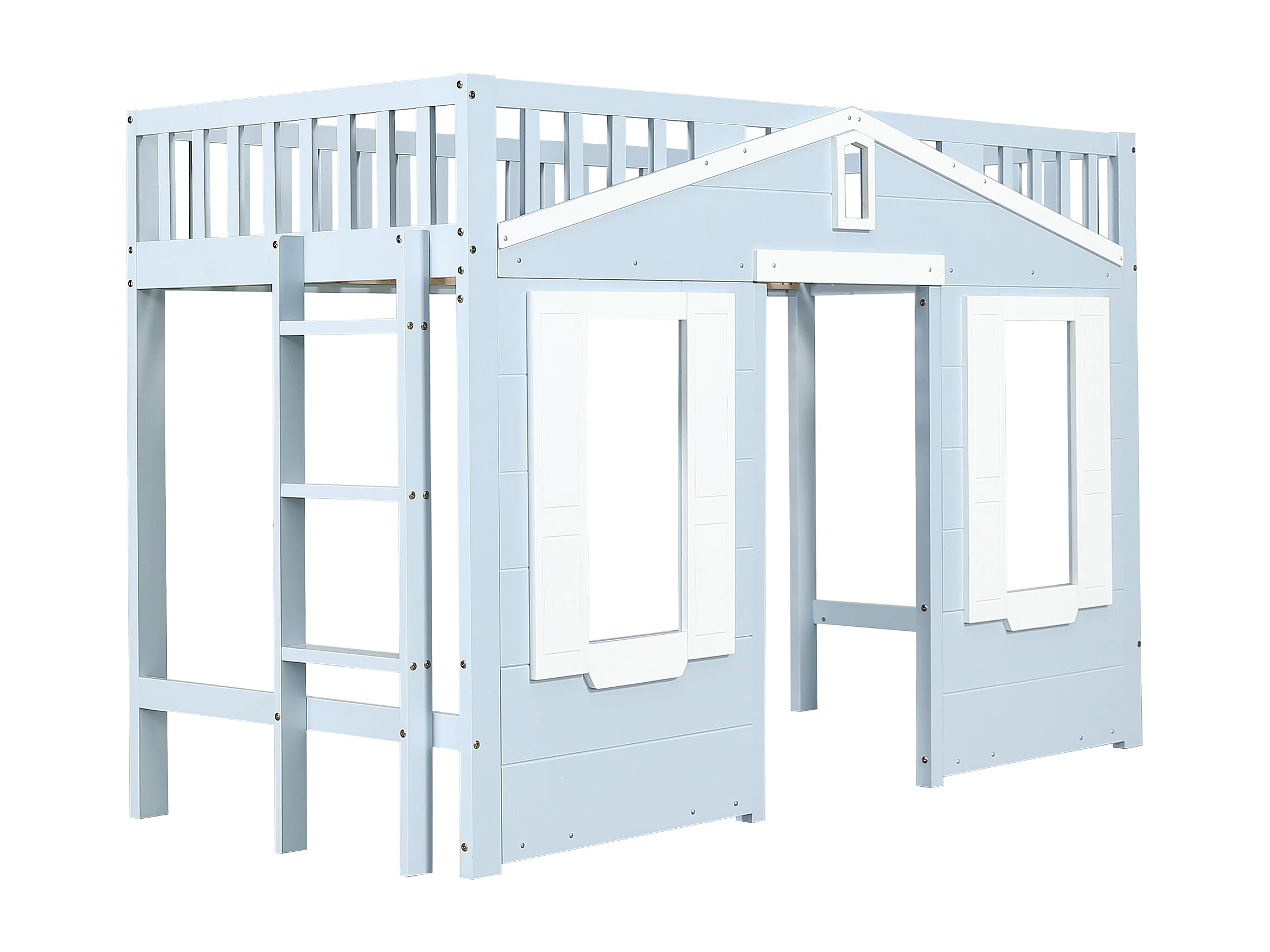 Hoogslaper 90x200cm - Kinderbed met ladder en veiligheidshekjes - wit en blauw - matras niet inbegrepen