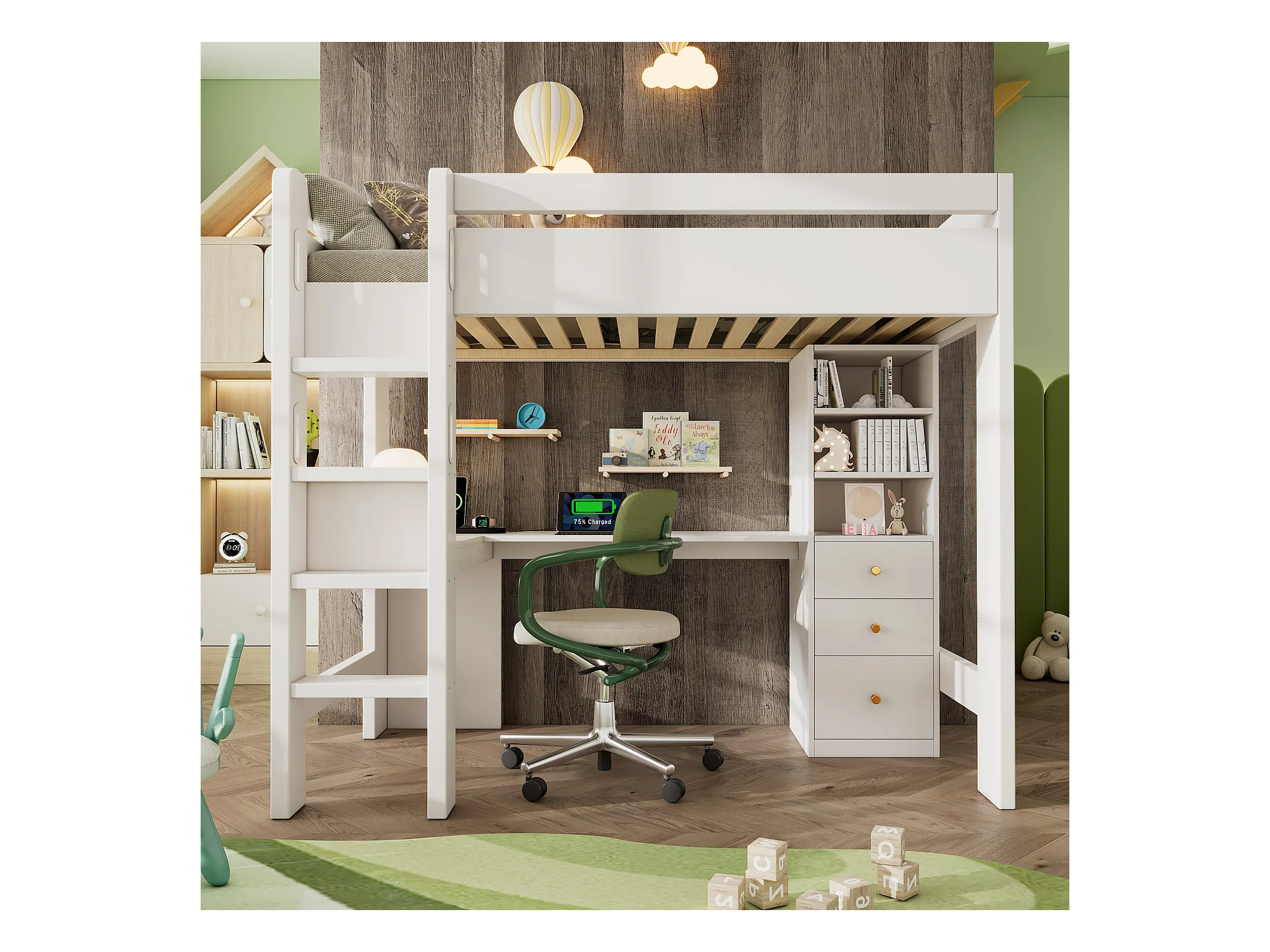 Hoogslaper voor kinderen 90 × 200 cm, met L-vormig bureau, plank en lades, USB/Type-C-oplaadzone, met ladder en houten latten, wit