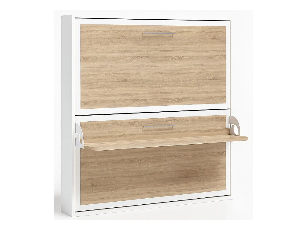 Horizontaal opklapbaar stapelbed 90x190 met gesynchroniseerde plank Studio High-end-2 matrassen-Bekisting Wit-Facade Cementgrijs