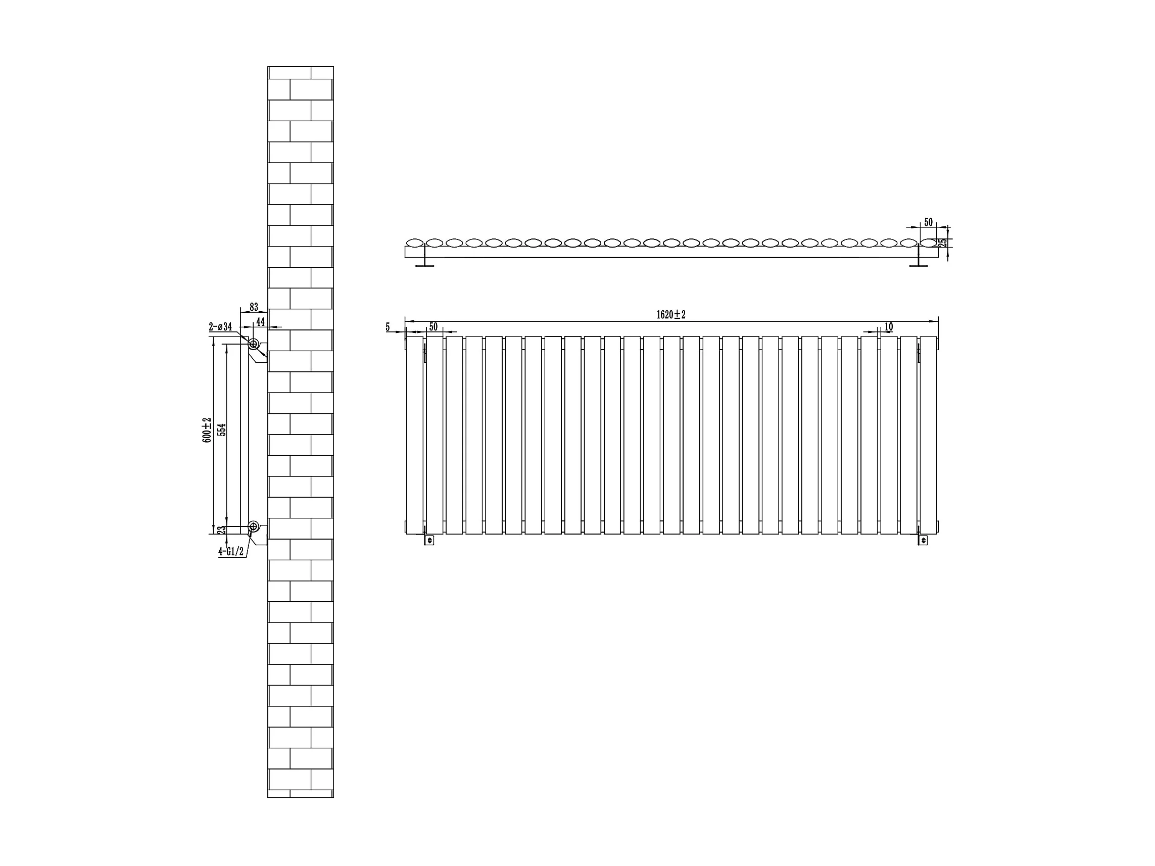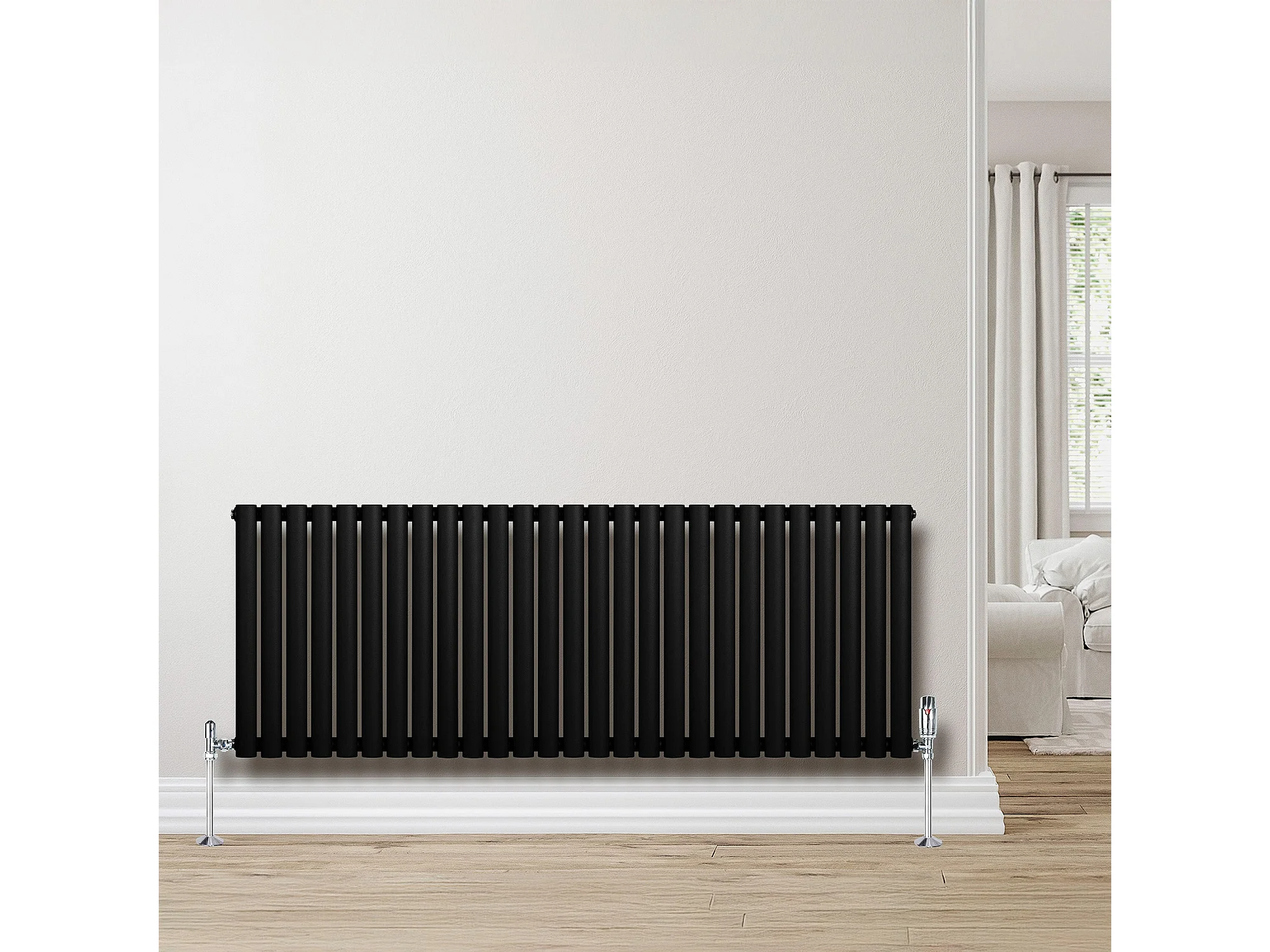 Horizontale design radiator ovaal 1 kolom - zwart 600x1620 mm thermostaatkraan