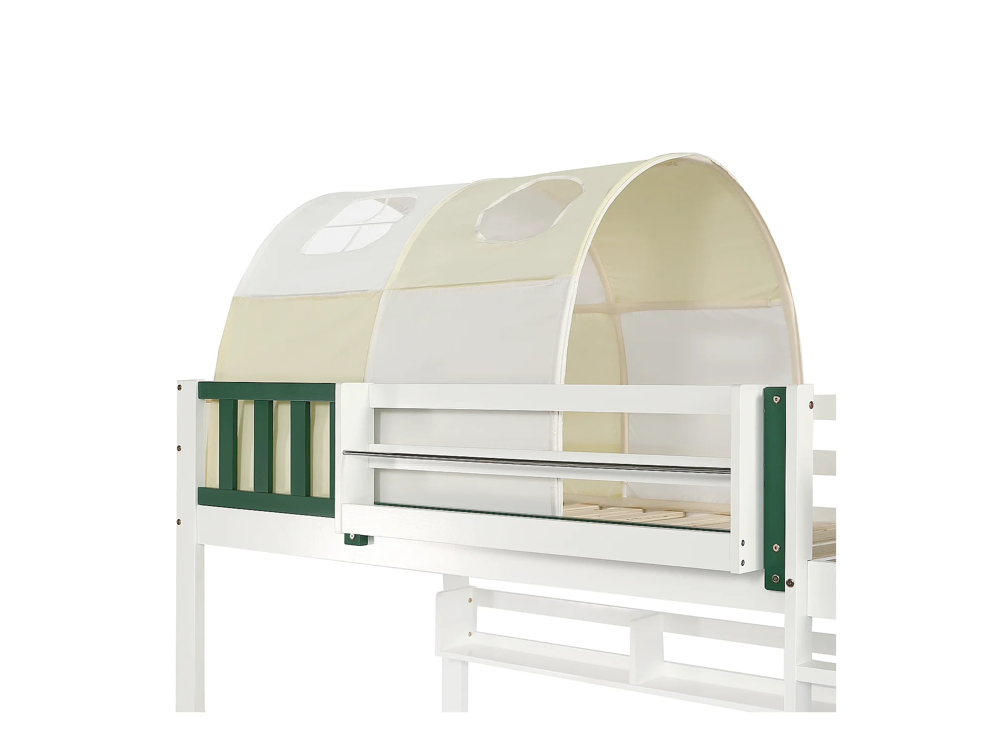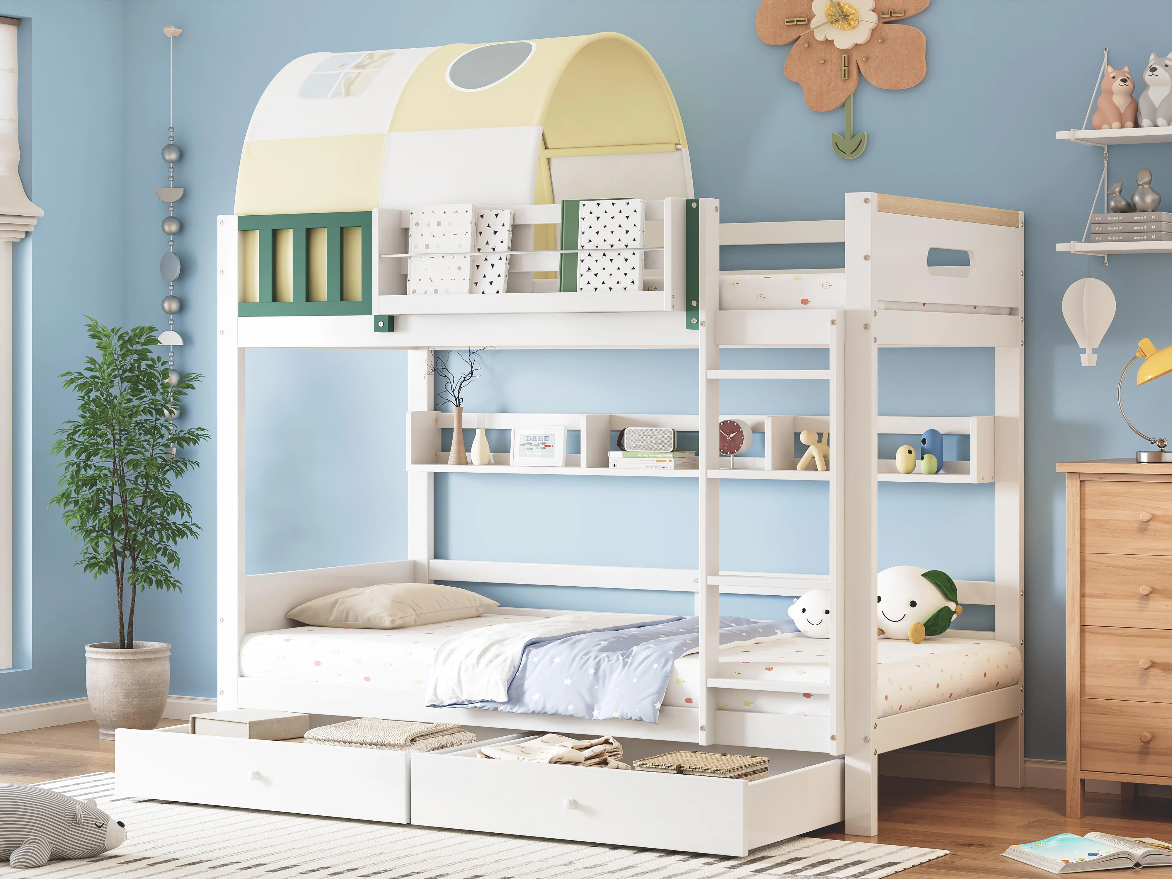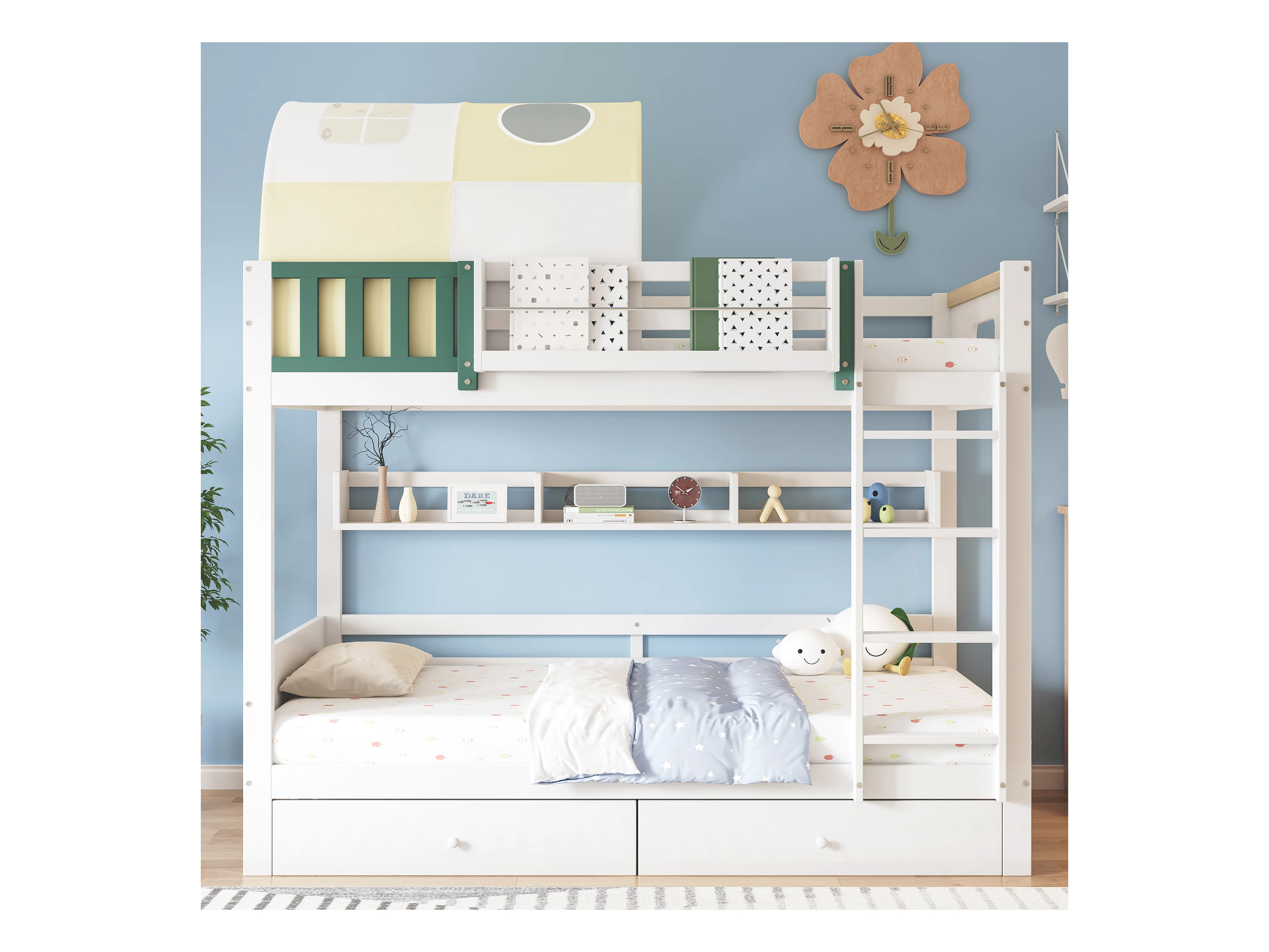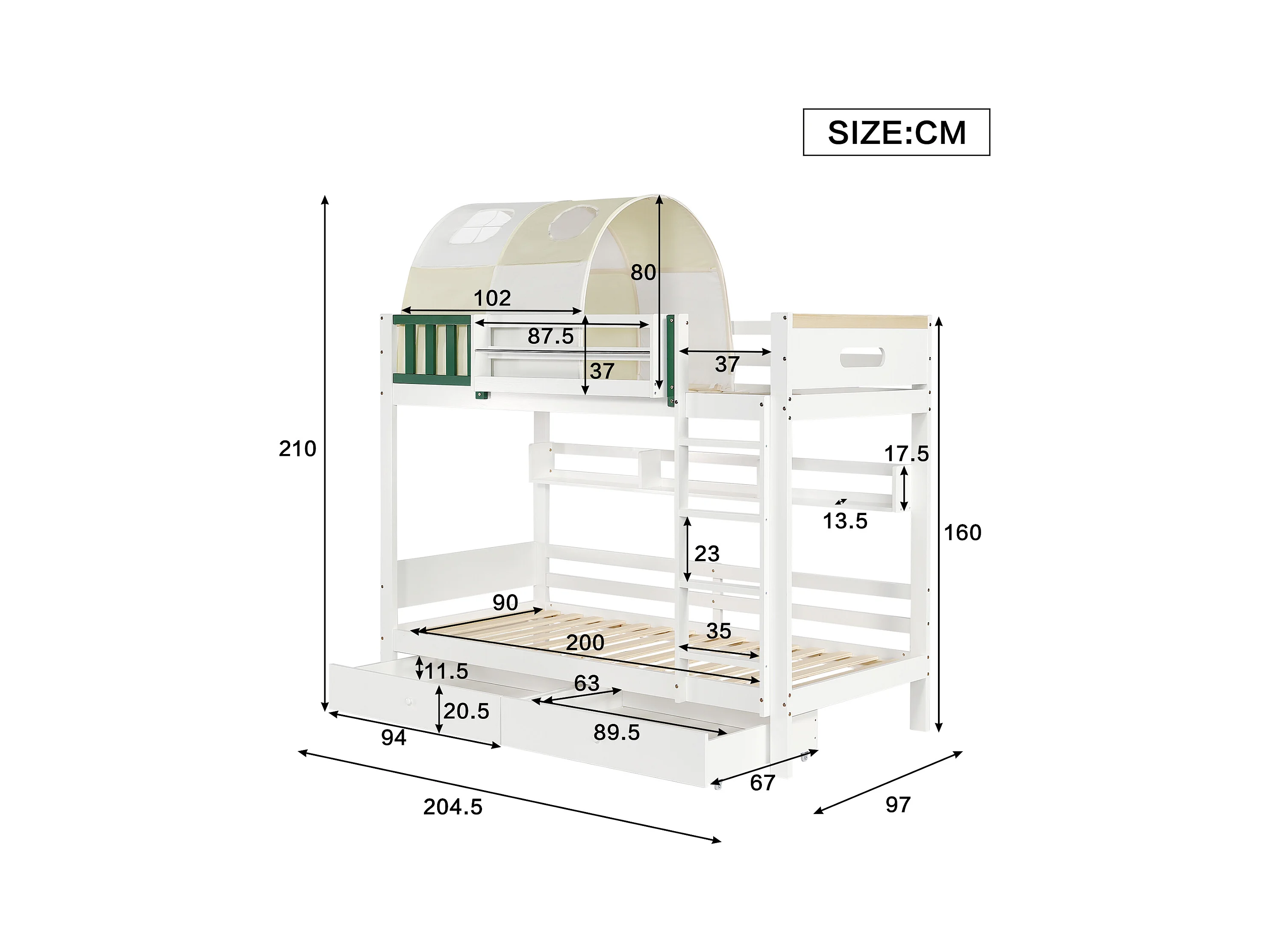 Houten stapelbed 90x200cm - met ladder en 2 laden op wielen - Wit