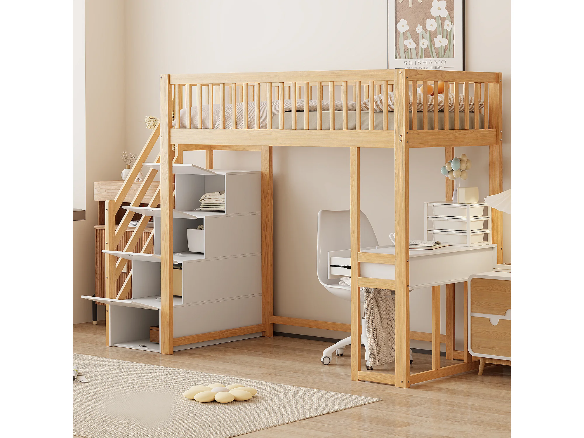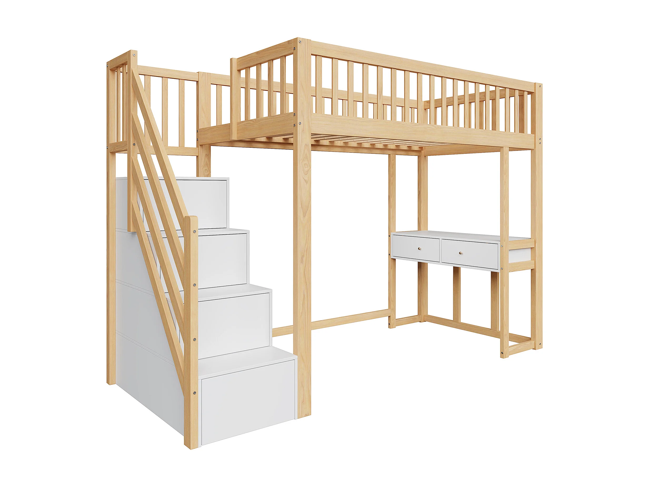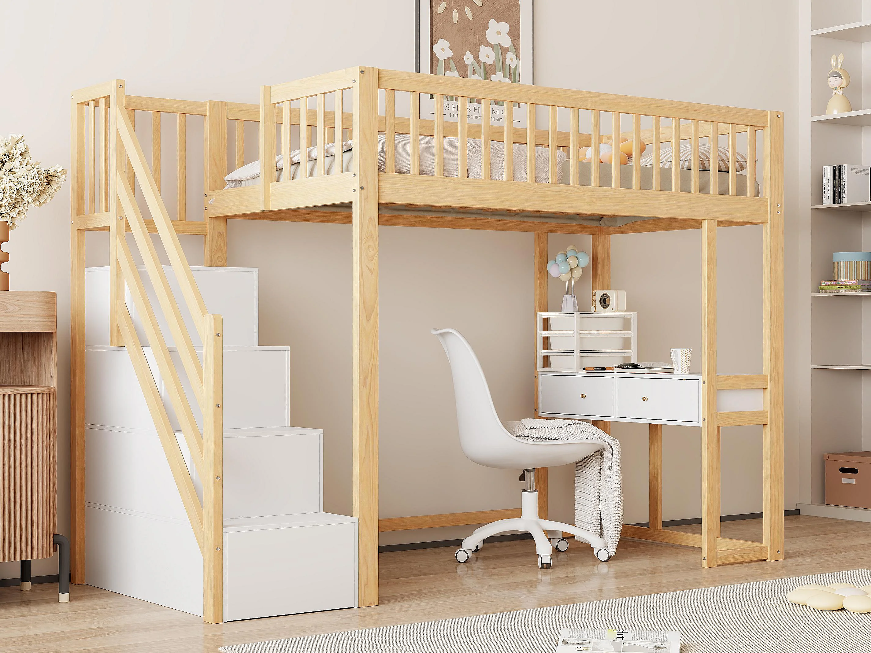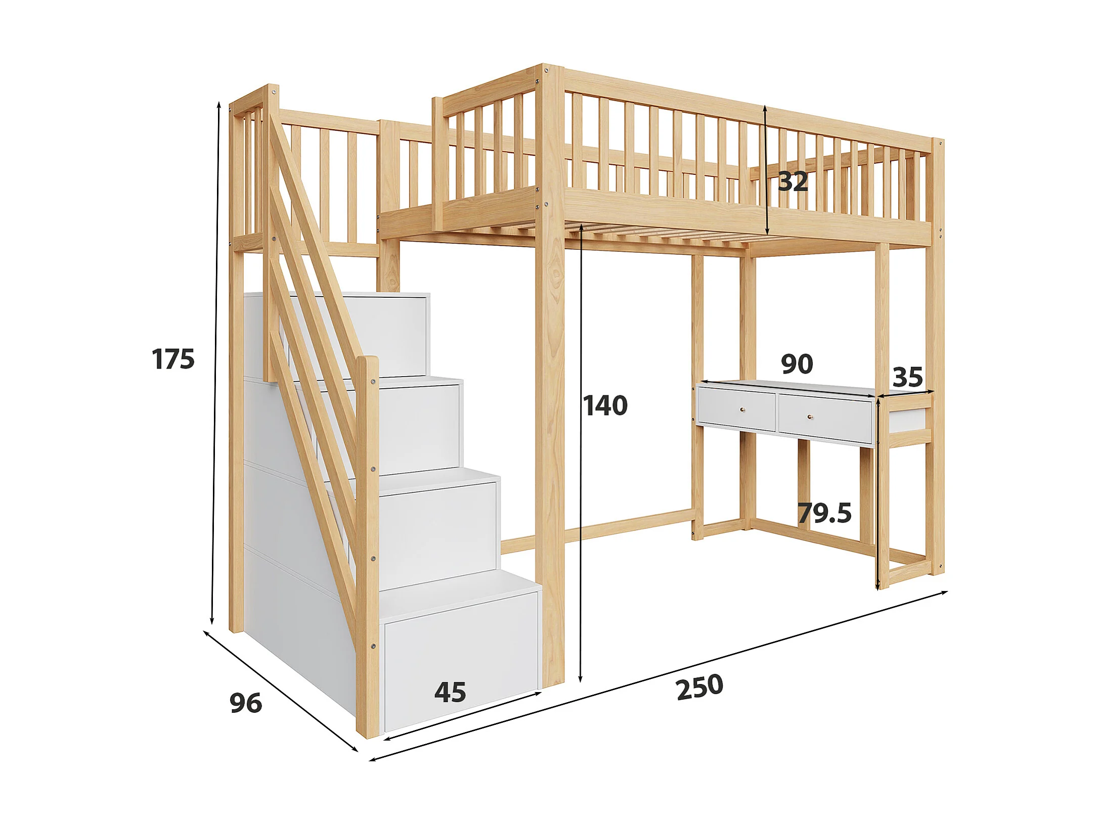 Houten tussenbed 90x200cm - met tafel en opbergtrap - Naturel & Wit