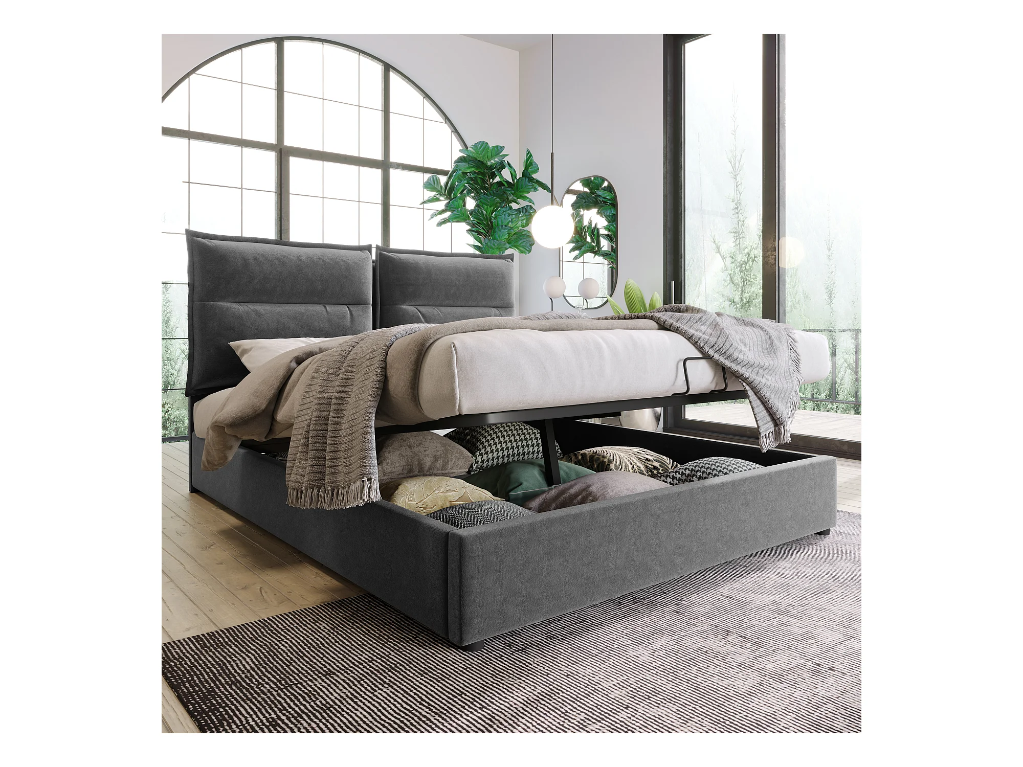 Tweepersoonsbed met leeslampje en USB-oplaadfunctie, frame met opbergruimte in grijs fluweel (165x206x103cm)