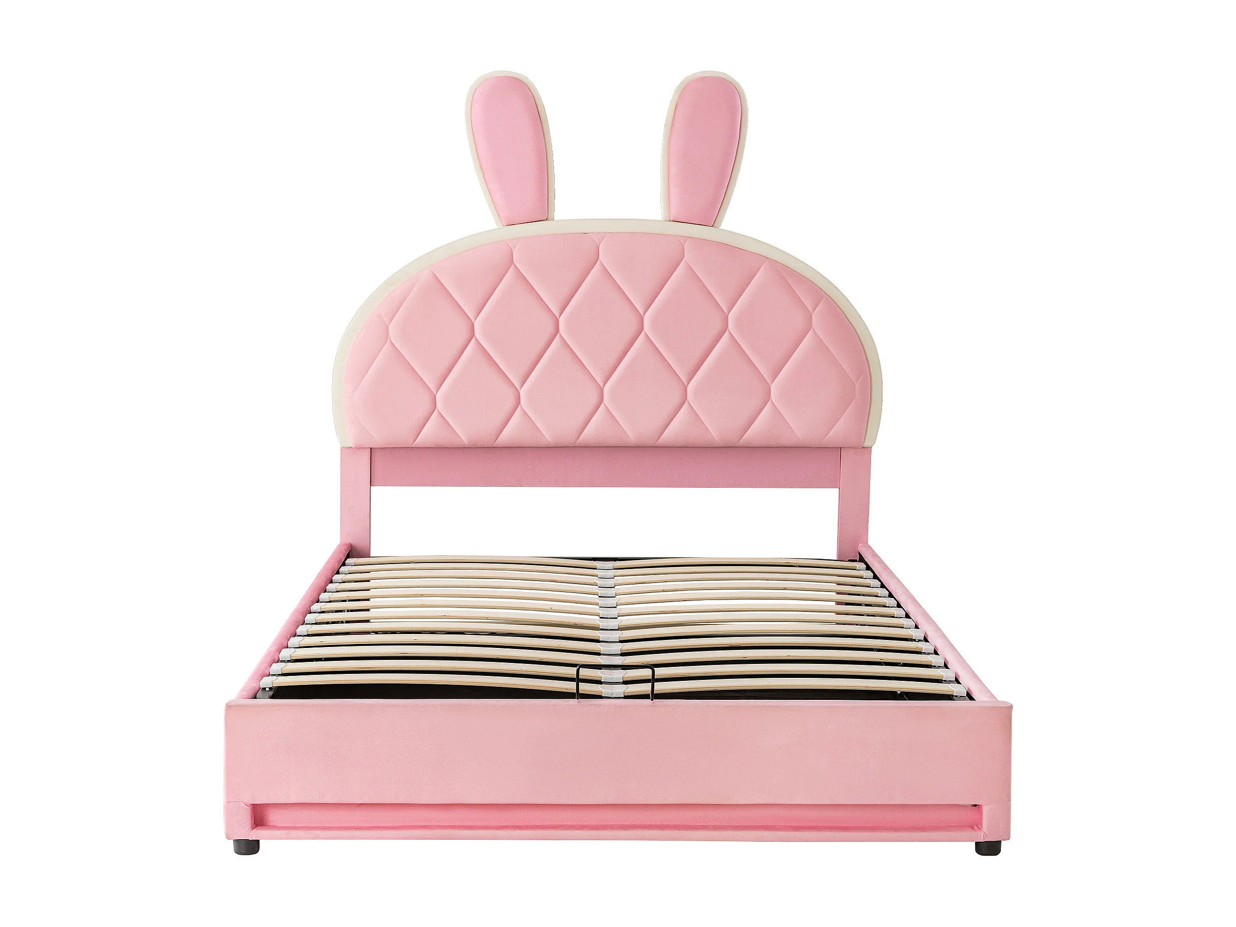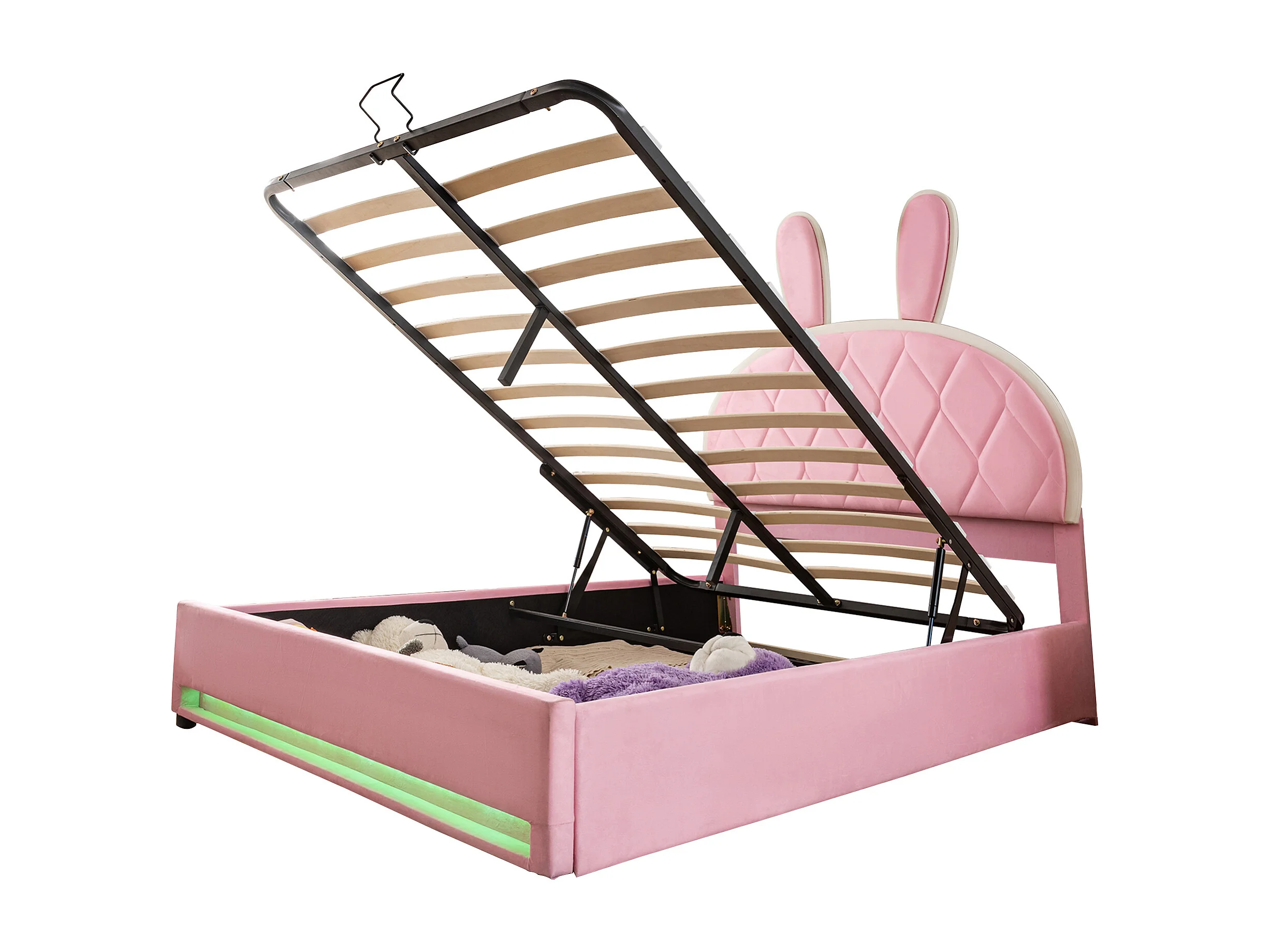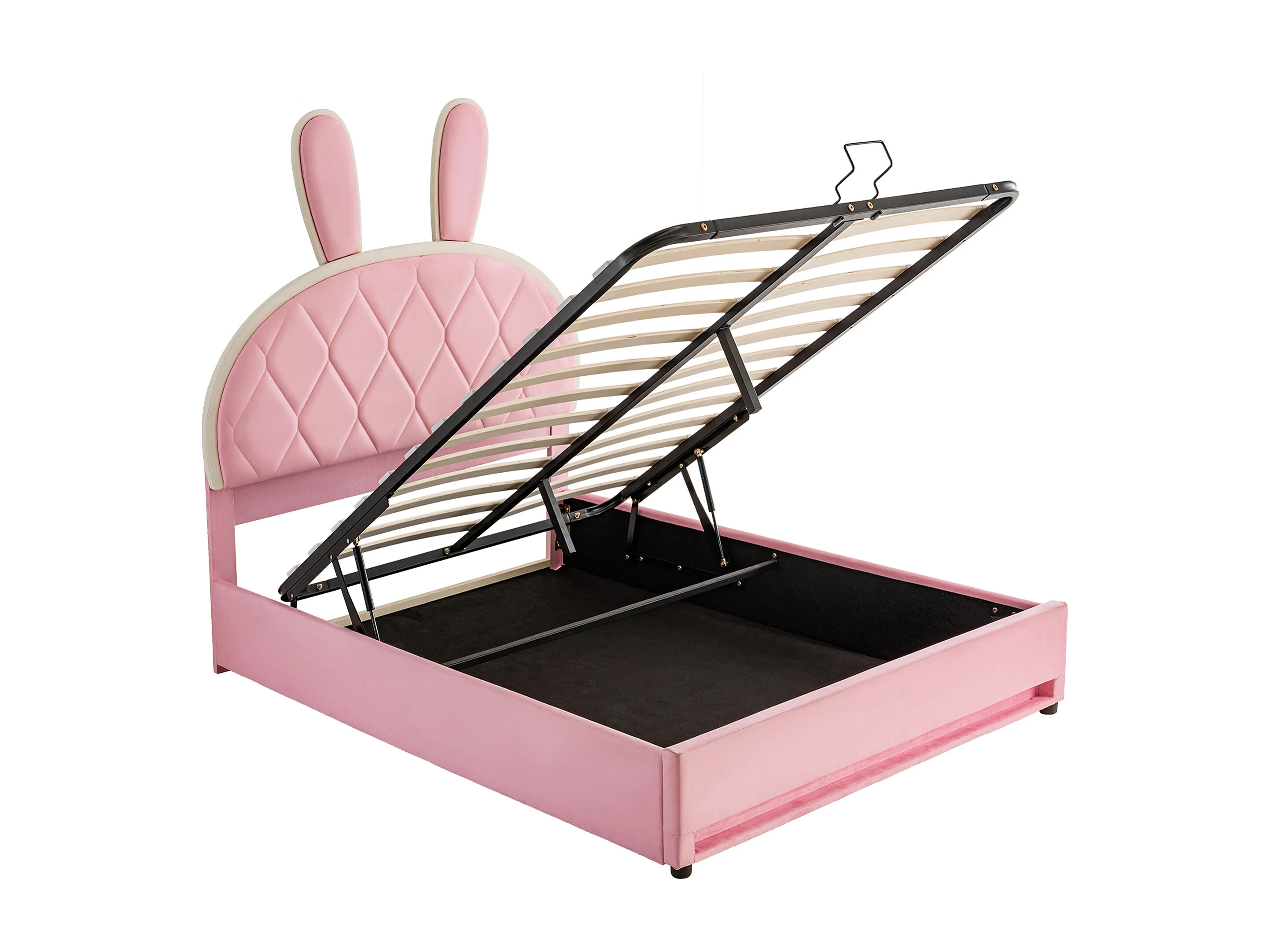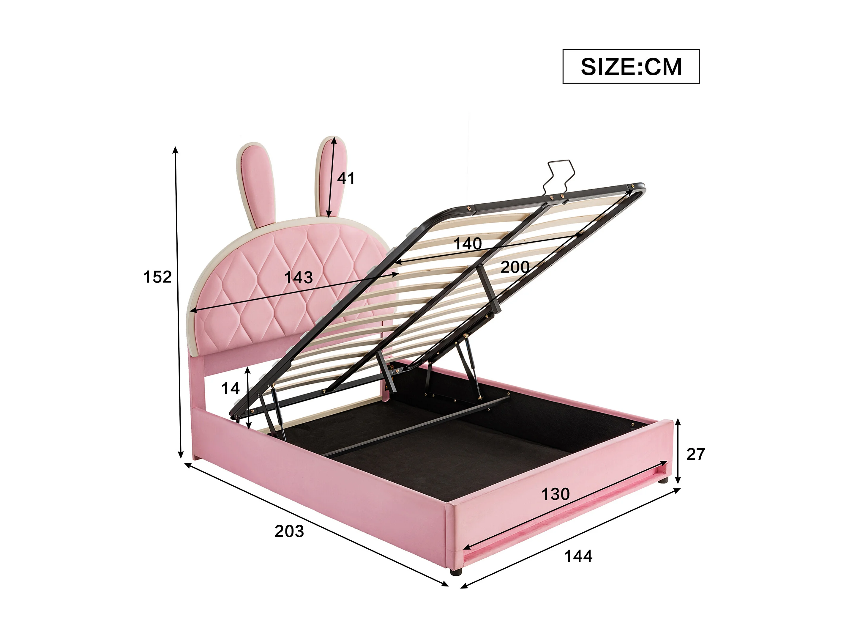 Hydraulisch gestoffeerd tweepersoonsbed, verstelbaar hoofdeinde (konijnenbont), metalen lattenbodem (opbergruimte), fluweel, roze, 140x200cm