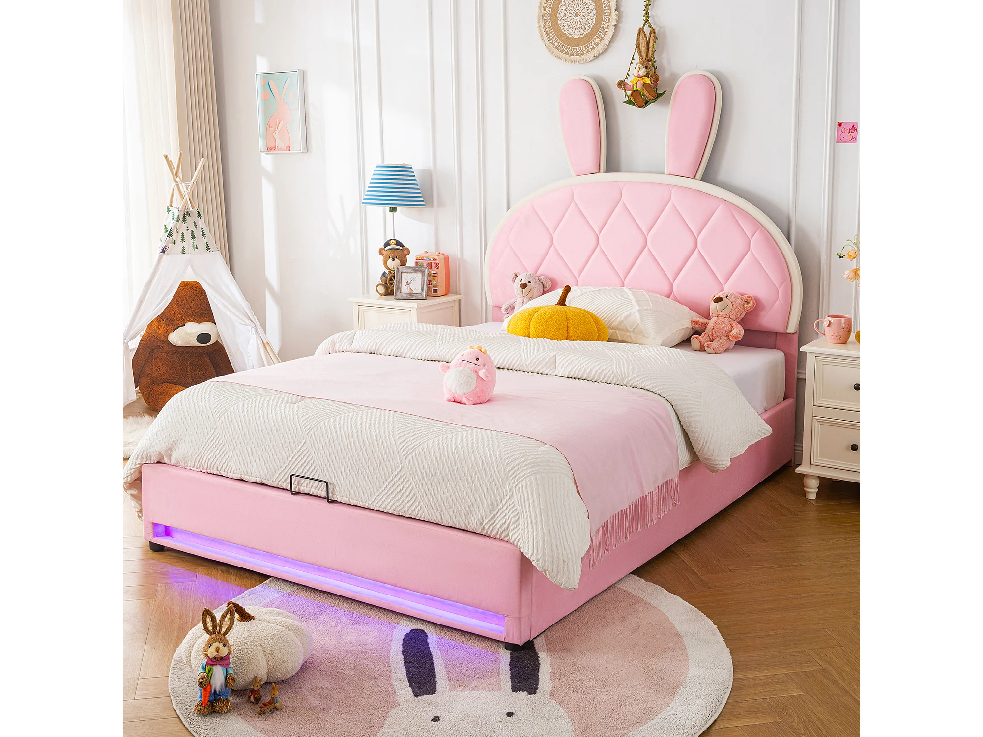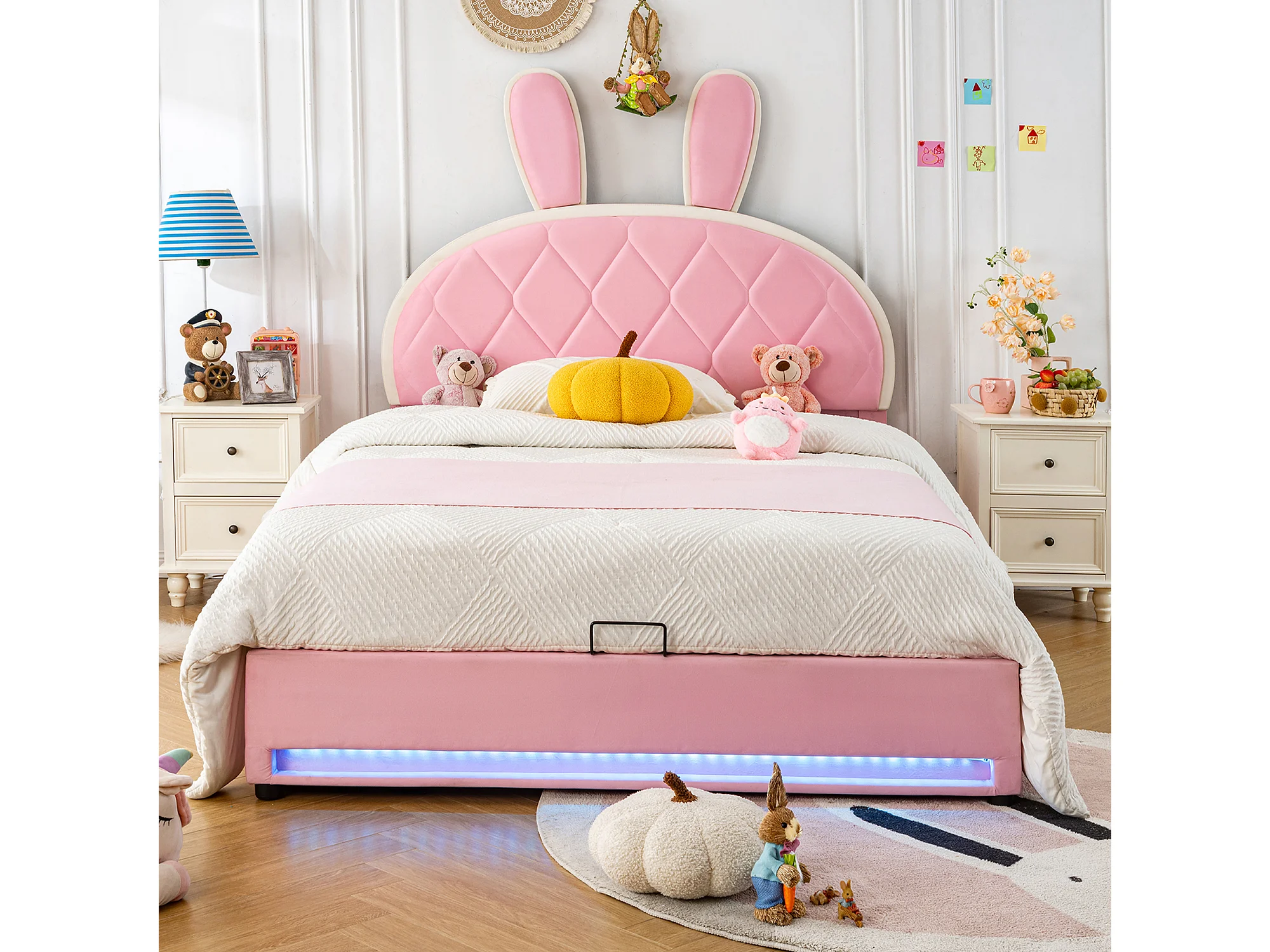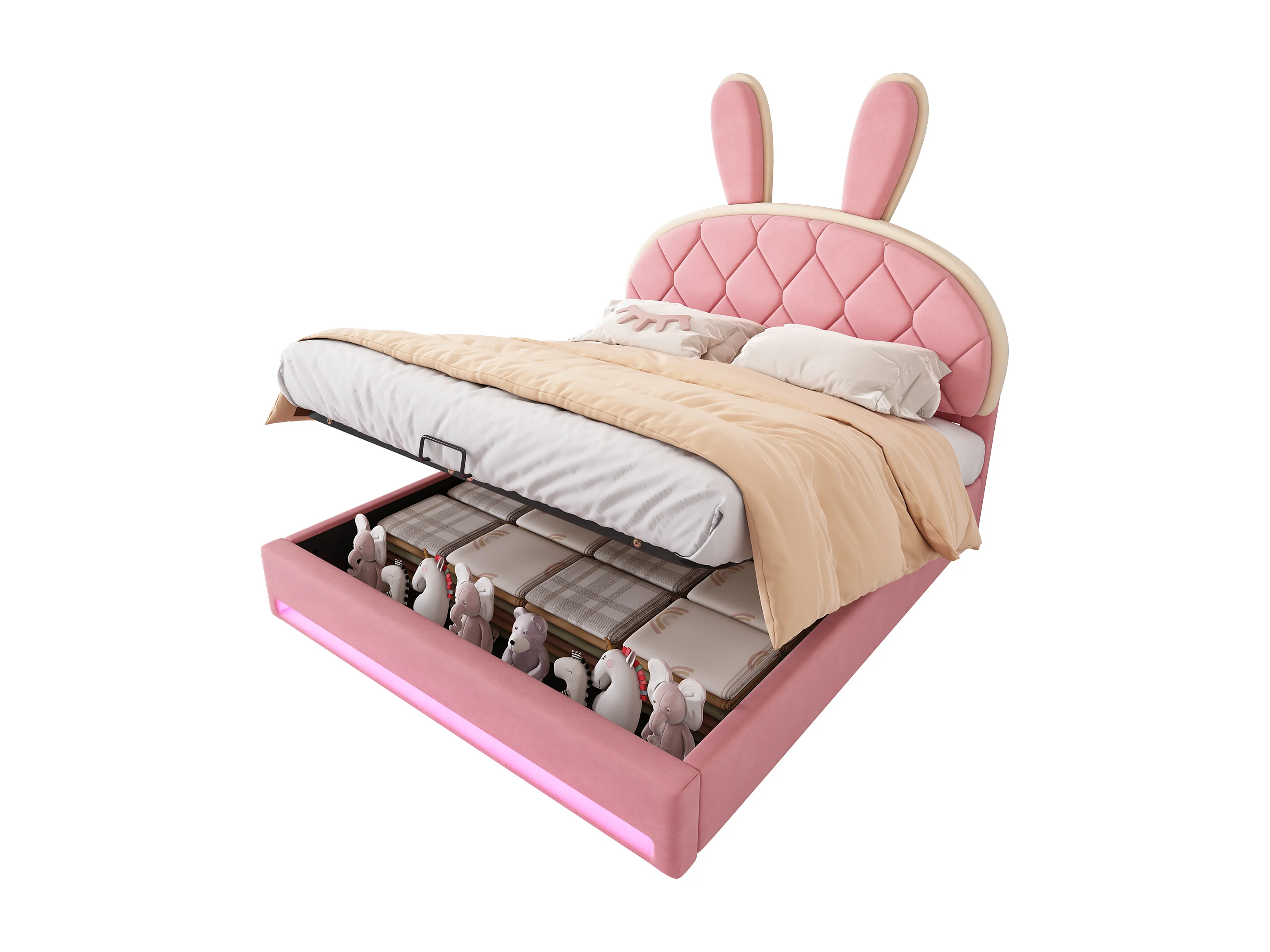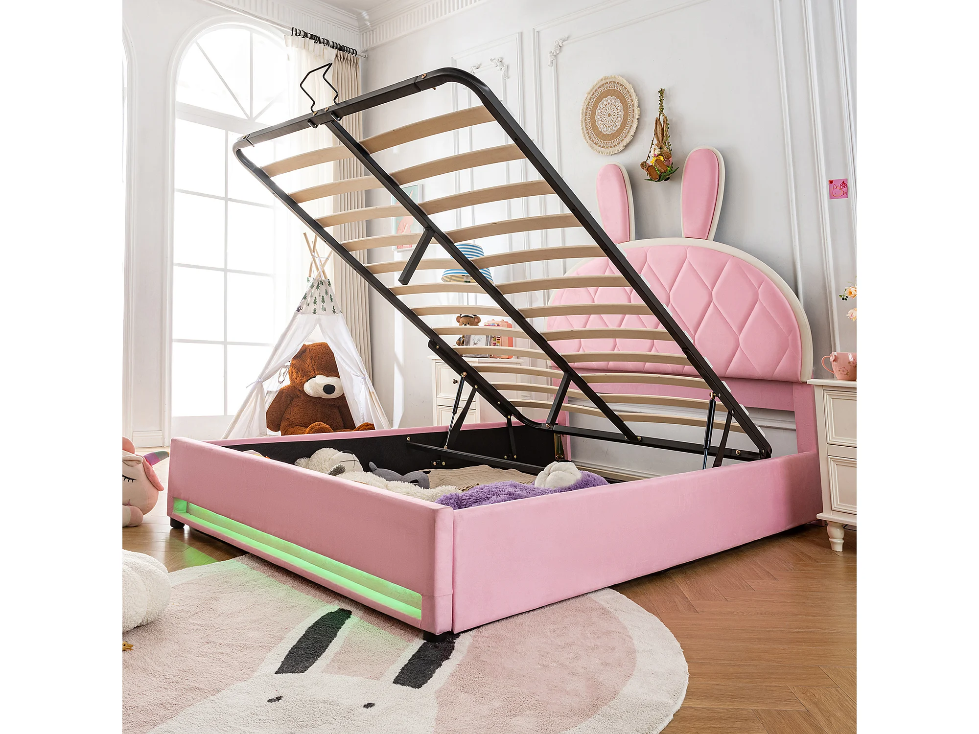 Hydraulisch gestoffeerd tweepersoonsbed, verstelbaar hoofdeinde (konijnenbont), metalen lattenbodem (opbergruimte), fluweel, roze, 140x200cm