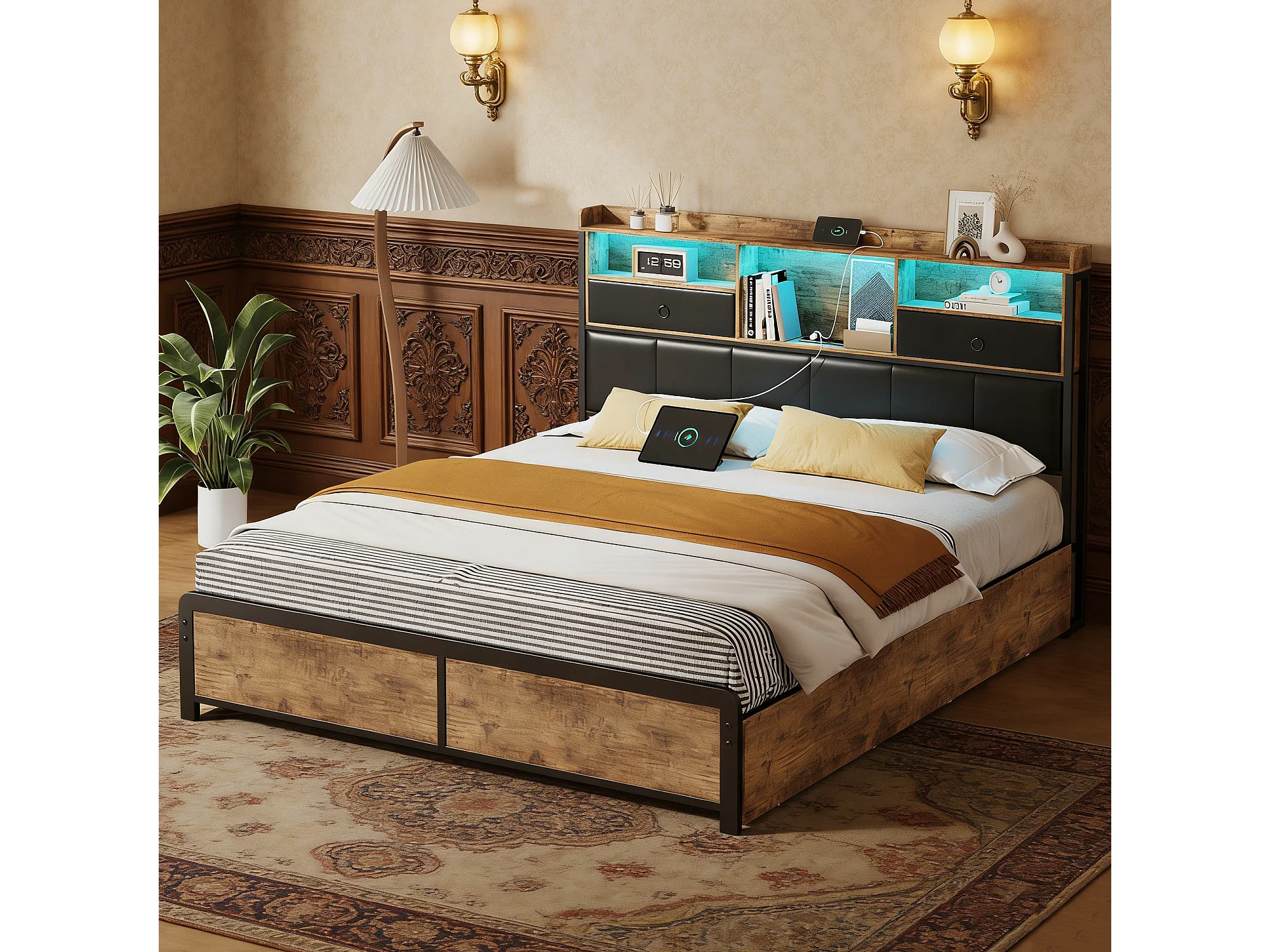 IJzeren bed 140x200 cm met lattenbodem - LED en USB - stoffen lade aan het hoofdeinde - gestoffeerd met PU - Zwart en bruin