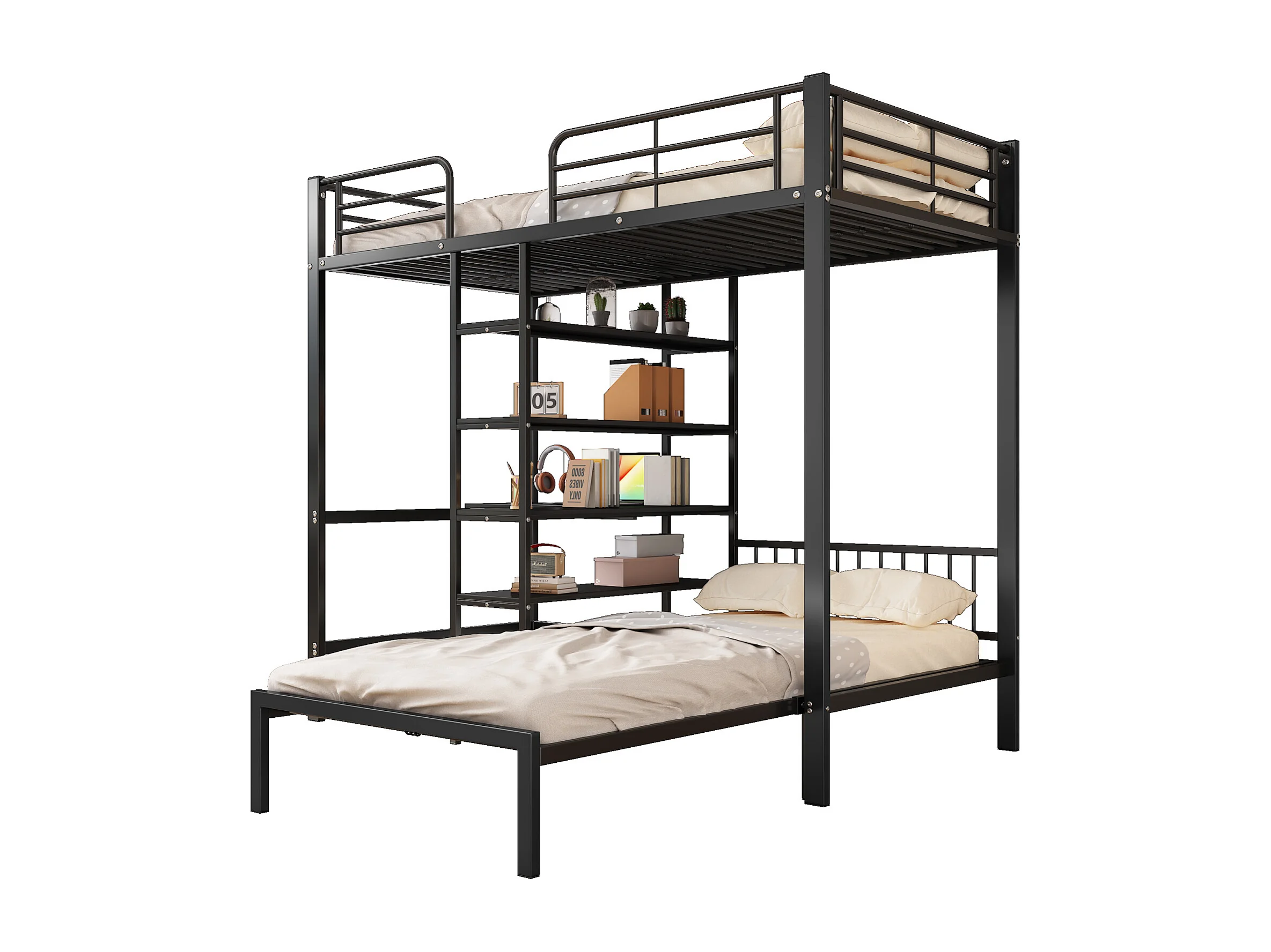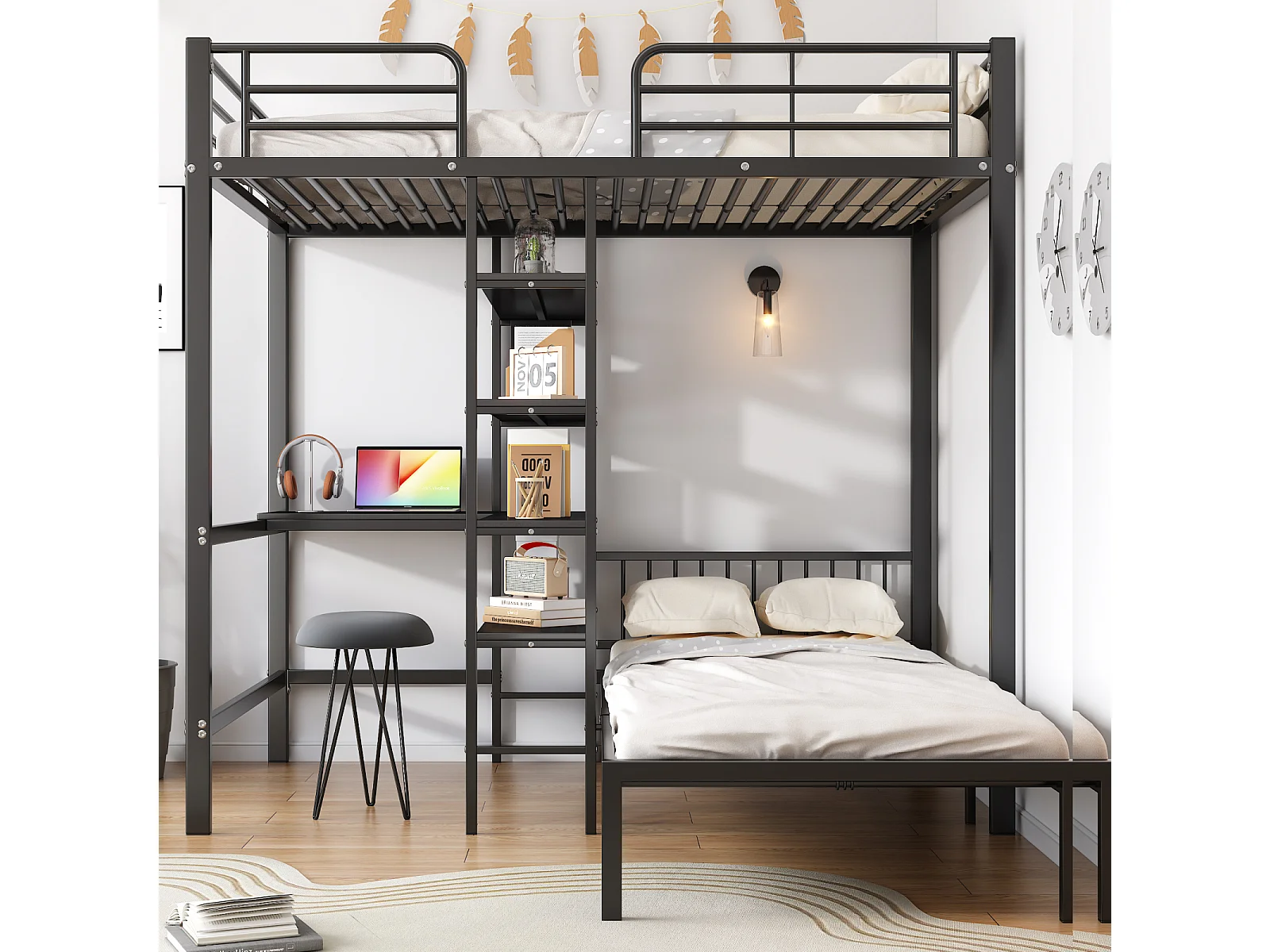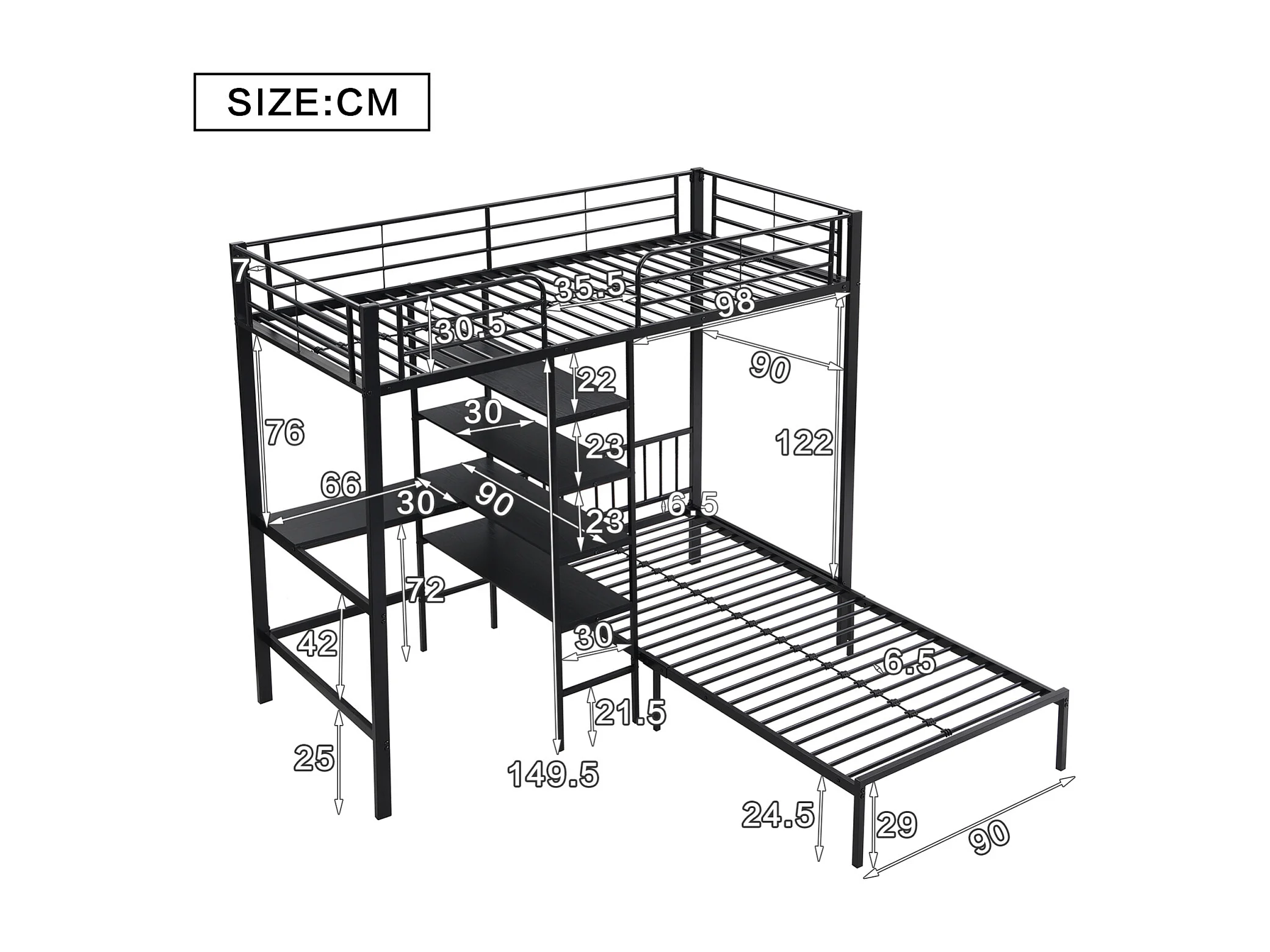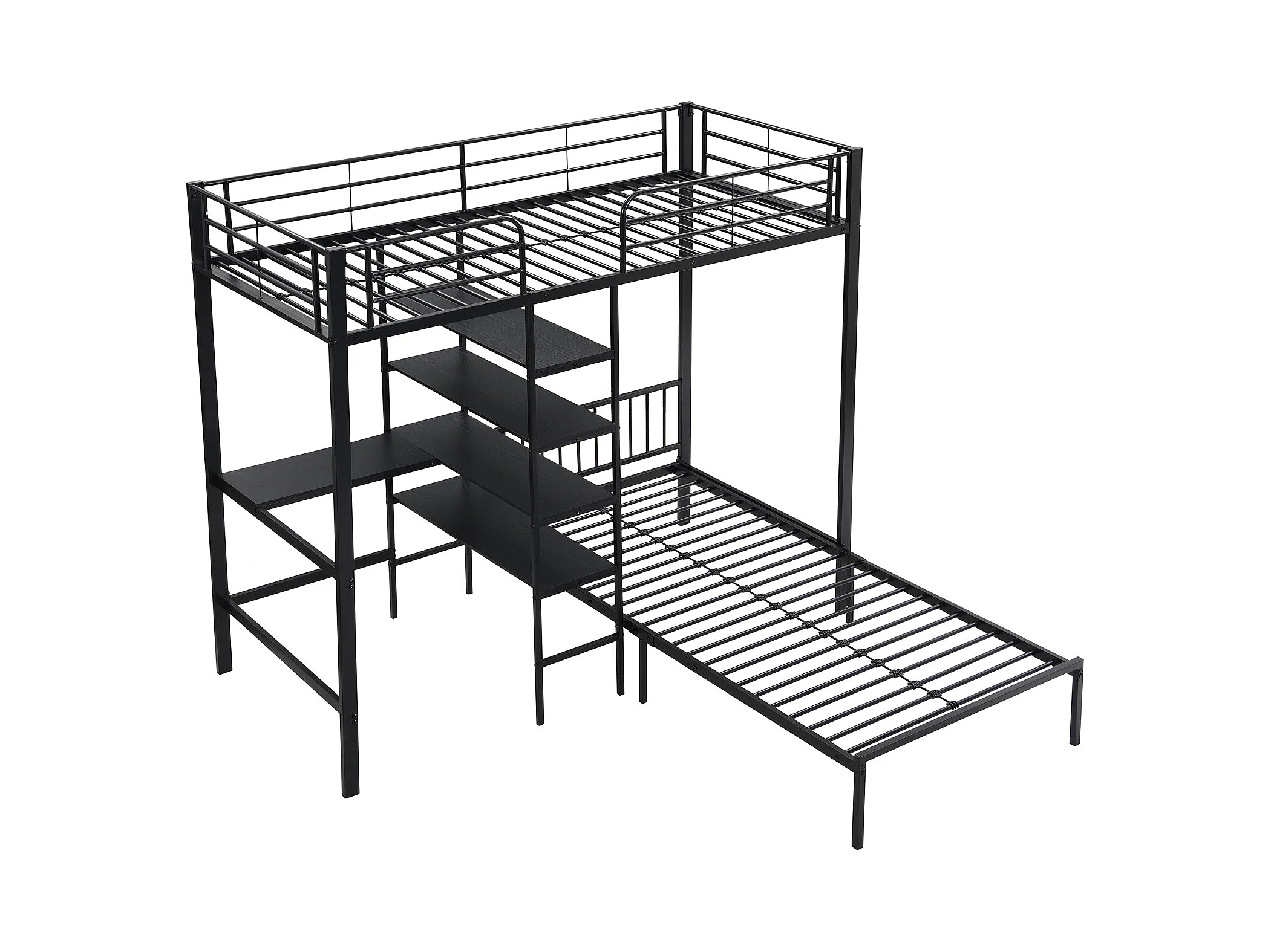 IJzeren stapelbed, tafel, planken, kinderen/tieners, 5-traps ladder (schuin), 4 leuningen, ijzer + MDF, zwart, 90x200cm