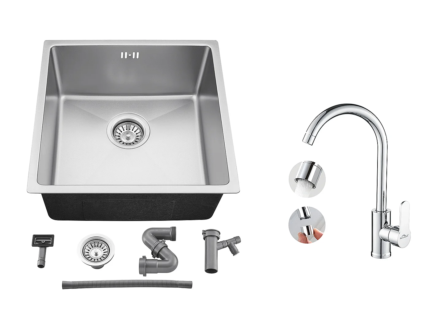 Inbouw Gootsteen 44x44x20CM- Keuken Gootsteen 1 Bak in 304 Roestvrij Staal, Zilver + Elegante Keukenmengkraan Verchroomd, 360° Pivot