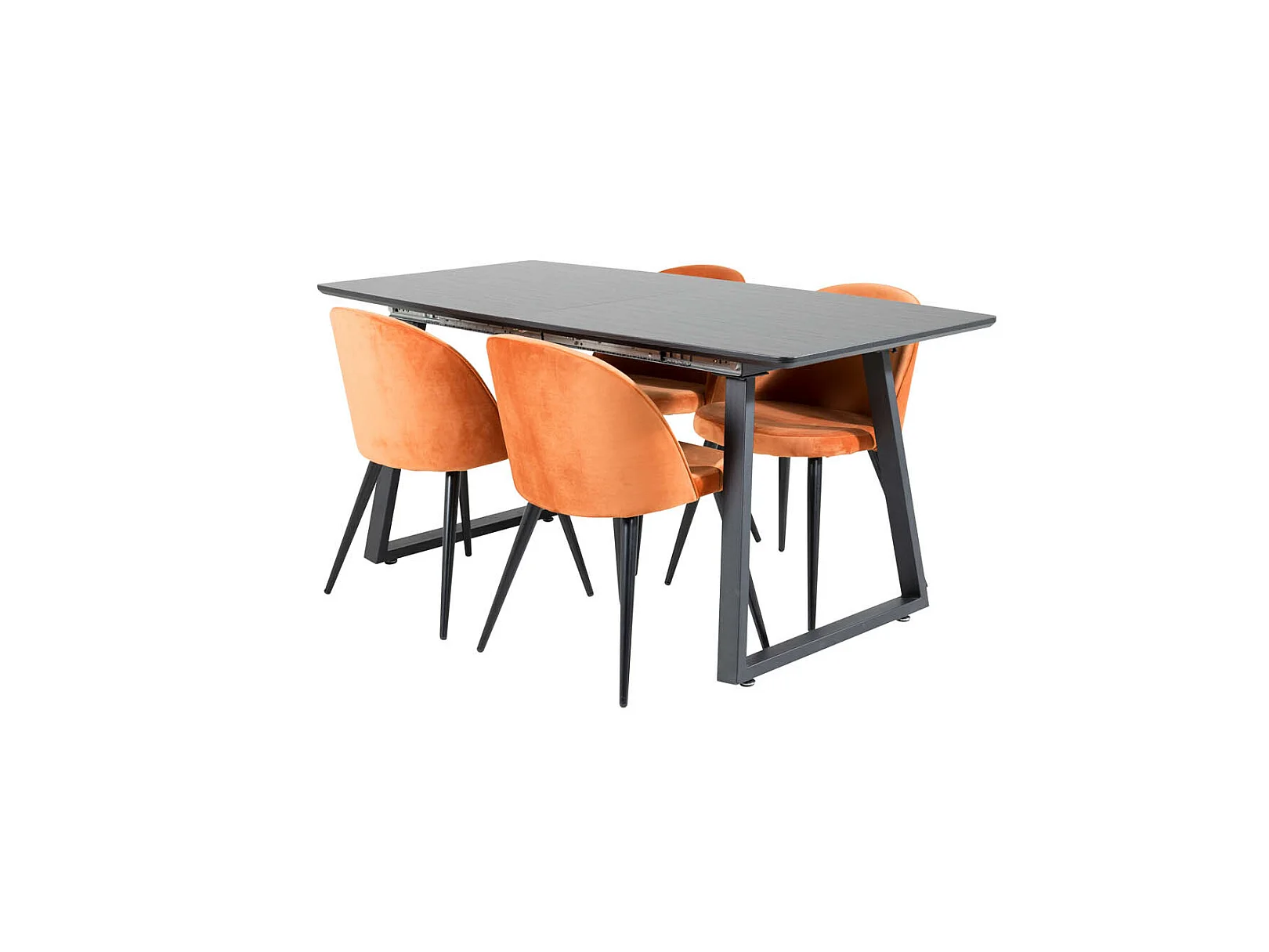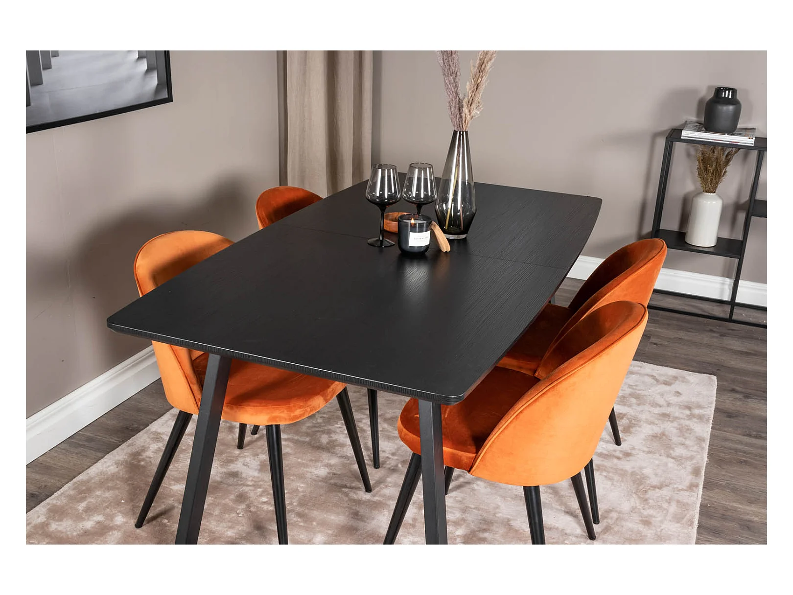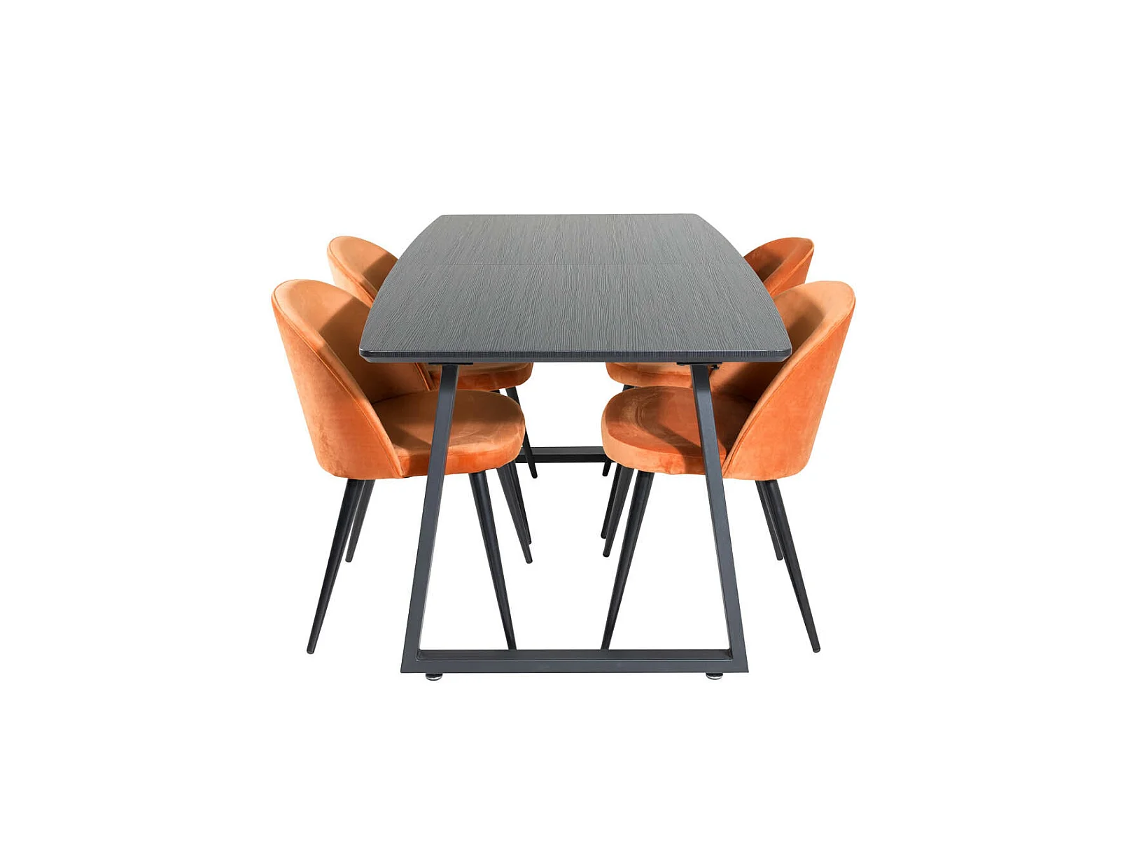 IncaBLBL eethoek eetkamertafel uitschuifbare tafel lengte cm 160 / 200 zwart en 4 Velvet eetkamerstal velours oranje, zwart.