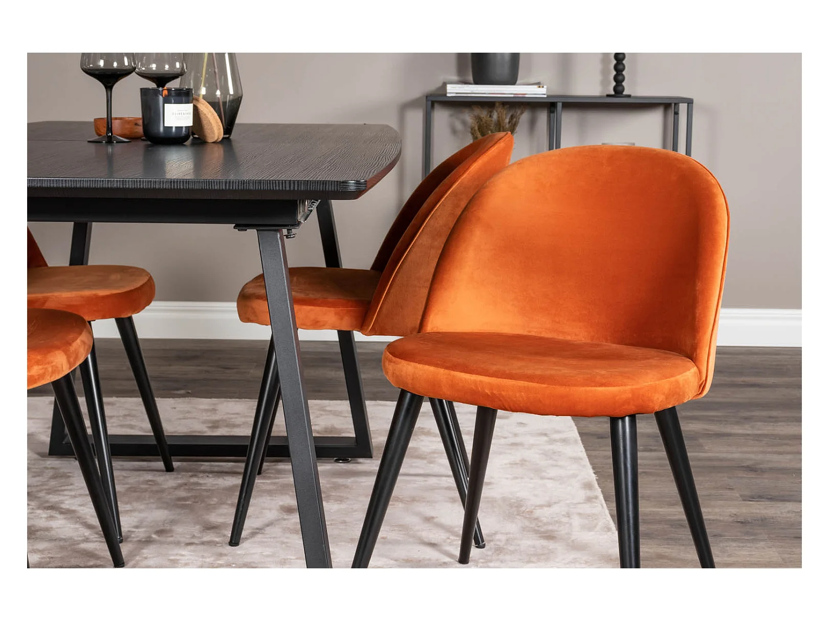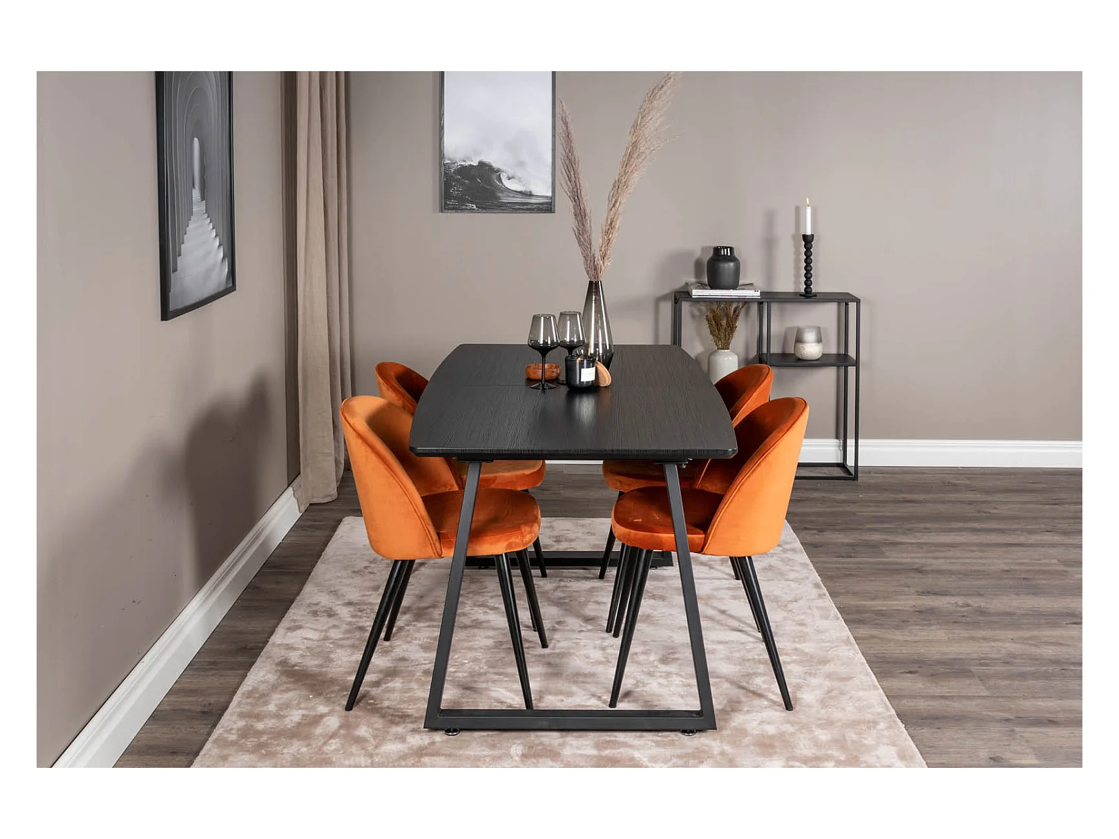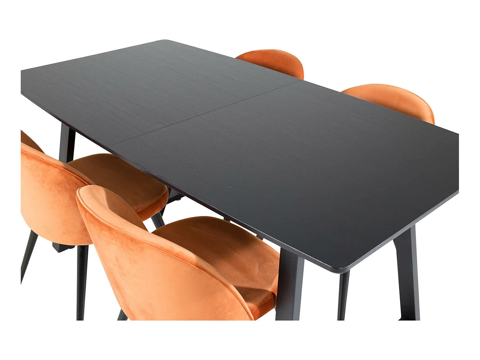 IncaBLBL eethoek eetkamertafel uitschuifbare tafel lengte cm 160 / 200 zwart en 4 Velvet eetkamerstal velours oranje, zwart.