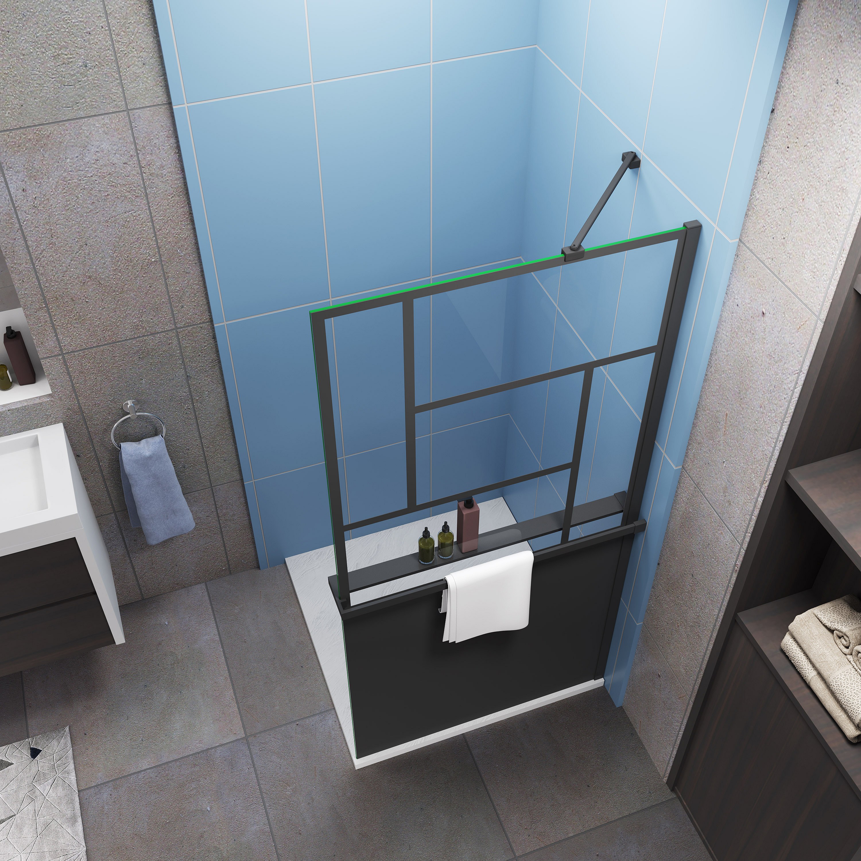 Vaste zwarte douchewand 100 x 200 cm, 8 mm antikalkglas + 140 cm montagestang met klem + 100 cm aluminium doucheplank