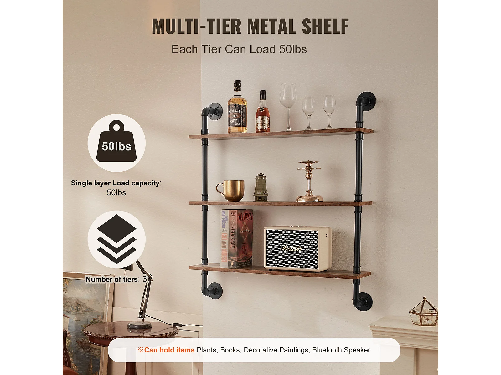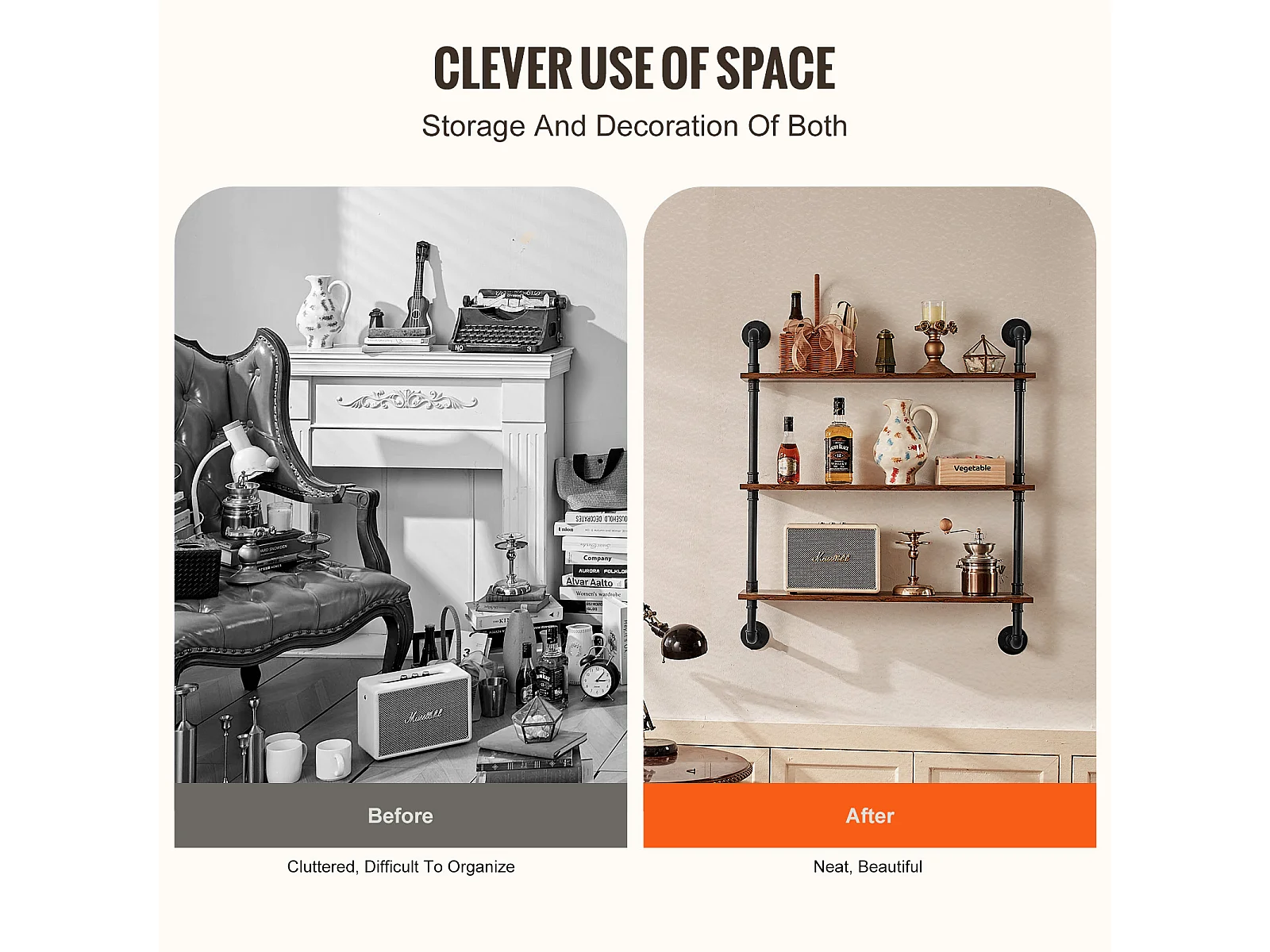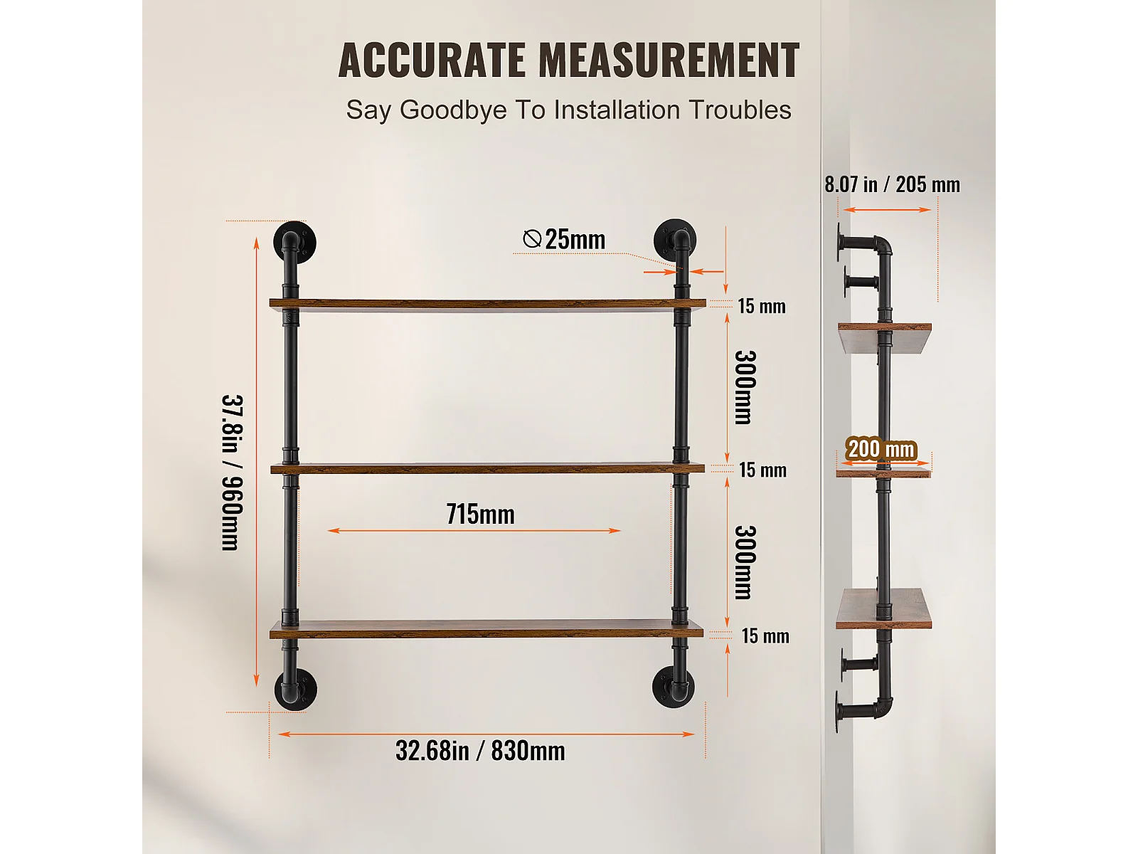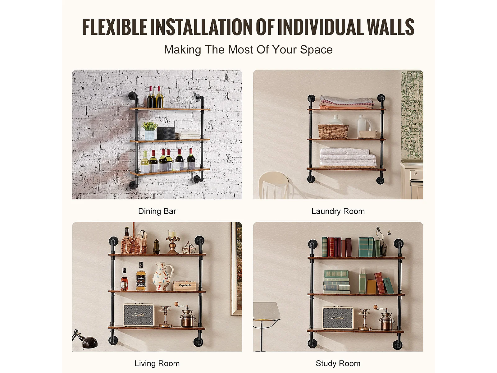 Industriële Pijp Wandplank SucceBuy, 83x20,5 cm, 3 Niveaus, Rustiek Houten Wand Opbergrek