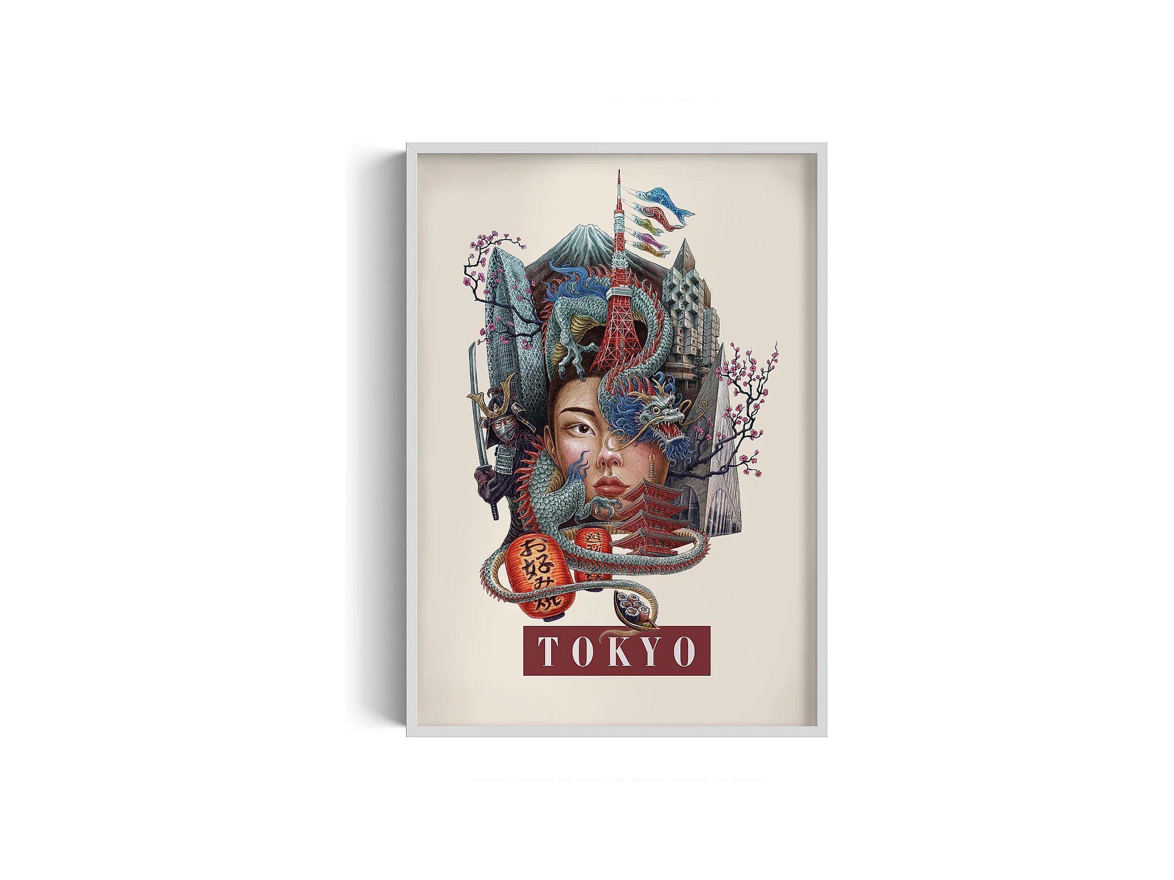 Ingelijste afbeelding, Japans stadsdecor, Tokyo print in witte lijst, afbeelding in stedelijke stijl Tokyo, 70x100 cm.