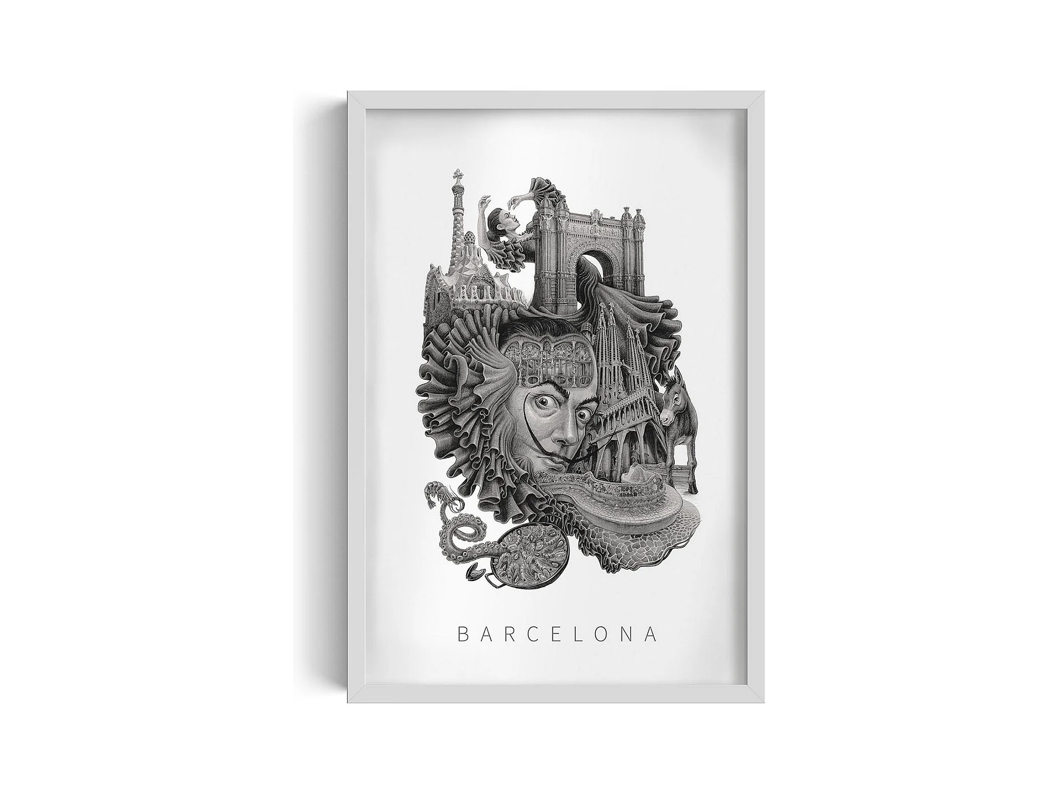 Ingelijste foto, levendig Spaans decor, witte kunstlijst Barcelona, minimalistische stadsprint van Barcelona, 40x60 cm.