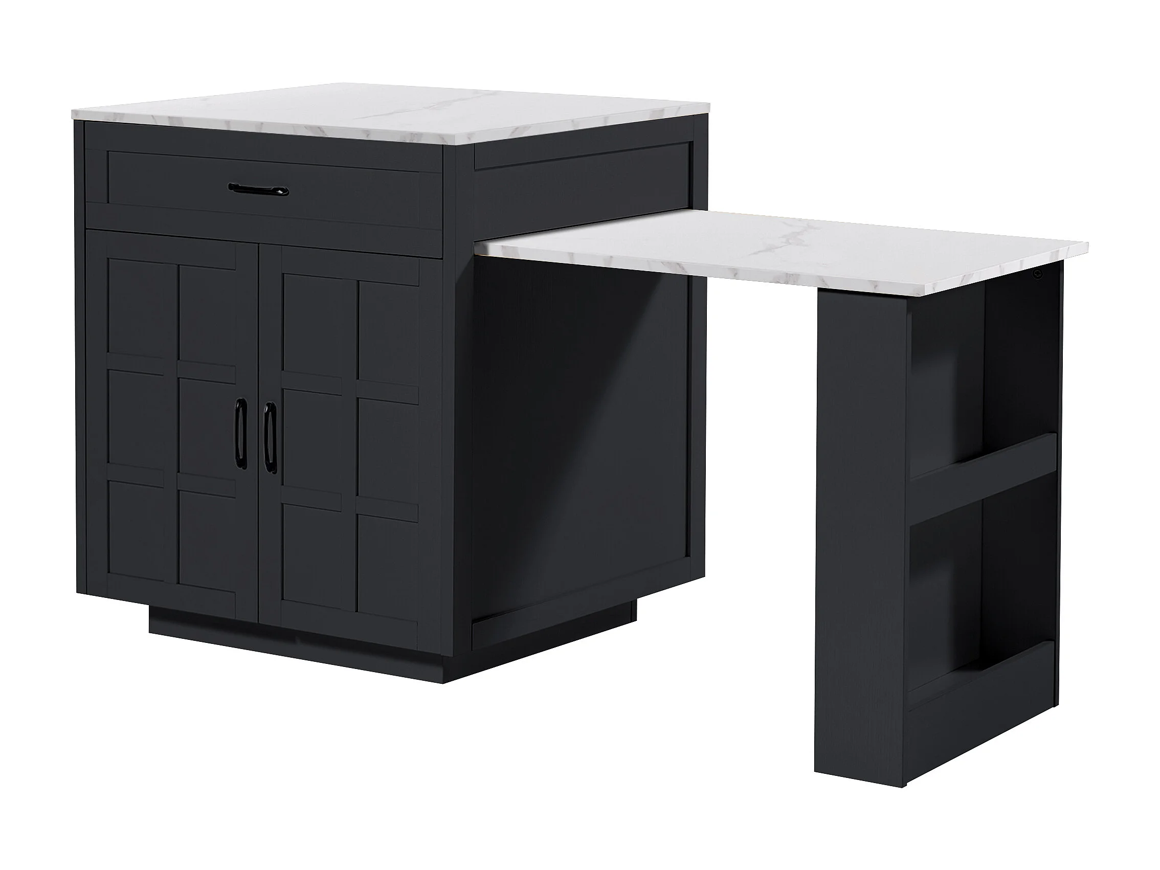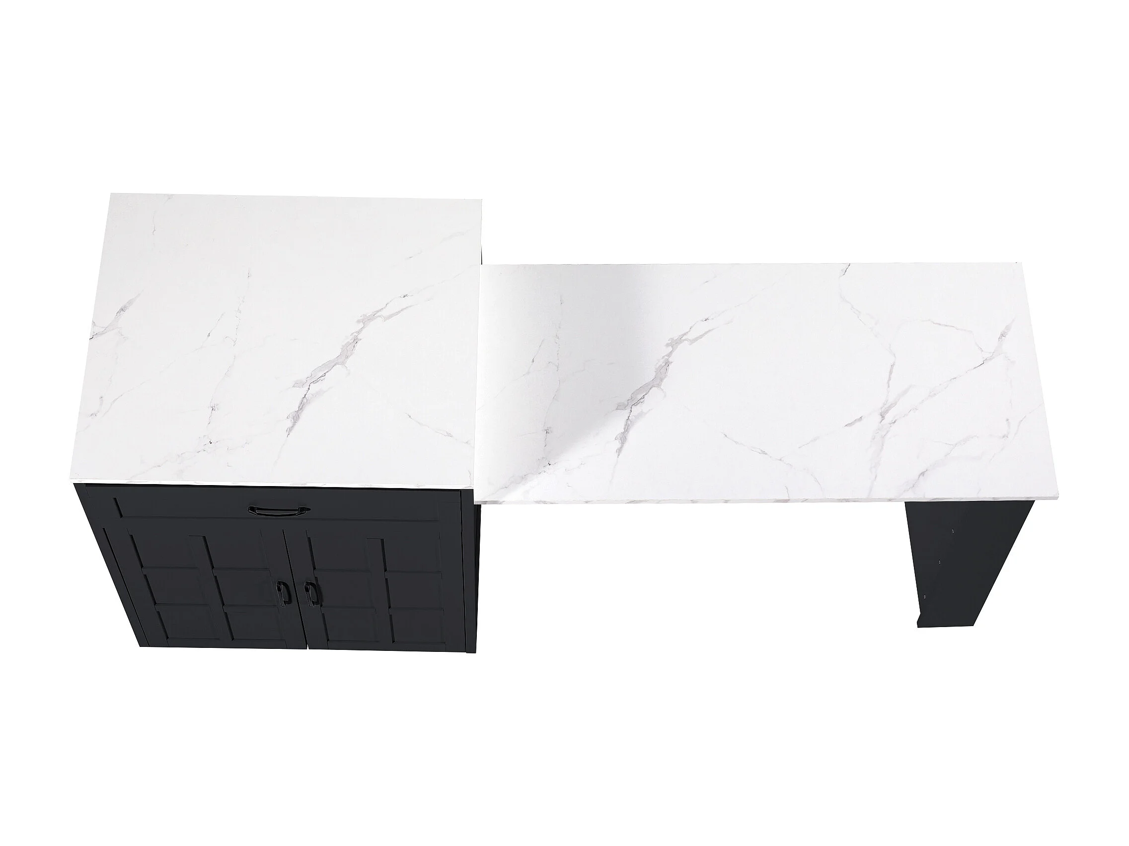 Centrale keukeneiland met 2 deuren en 2 lades - Uitklapbaar bord - Werkborden van kunstmatig marmer - 133(202)x59x93,5 cm - Voor 2 tot 6 personen - Zwart + Wit