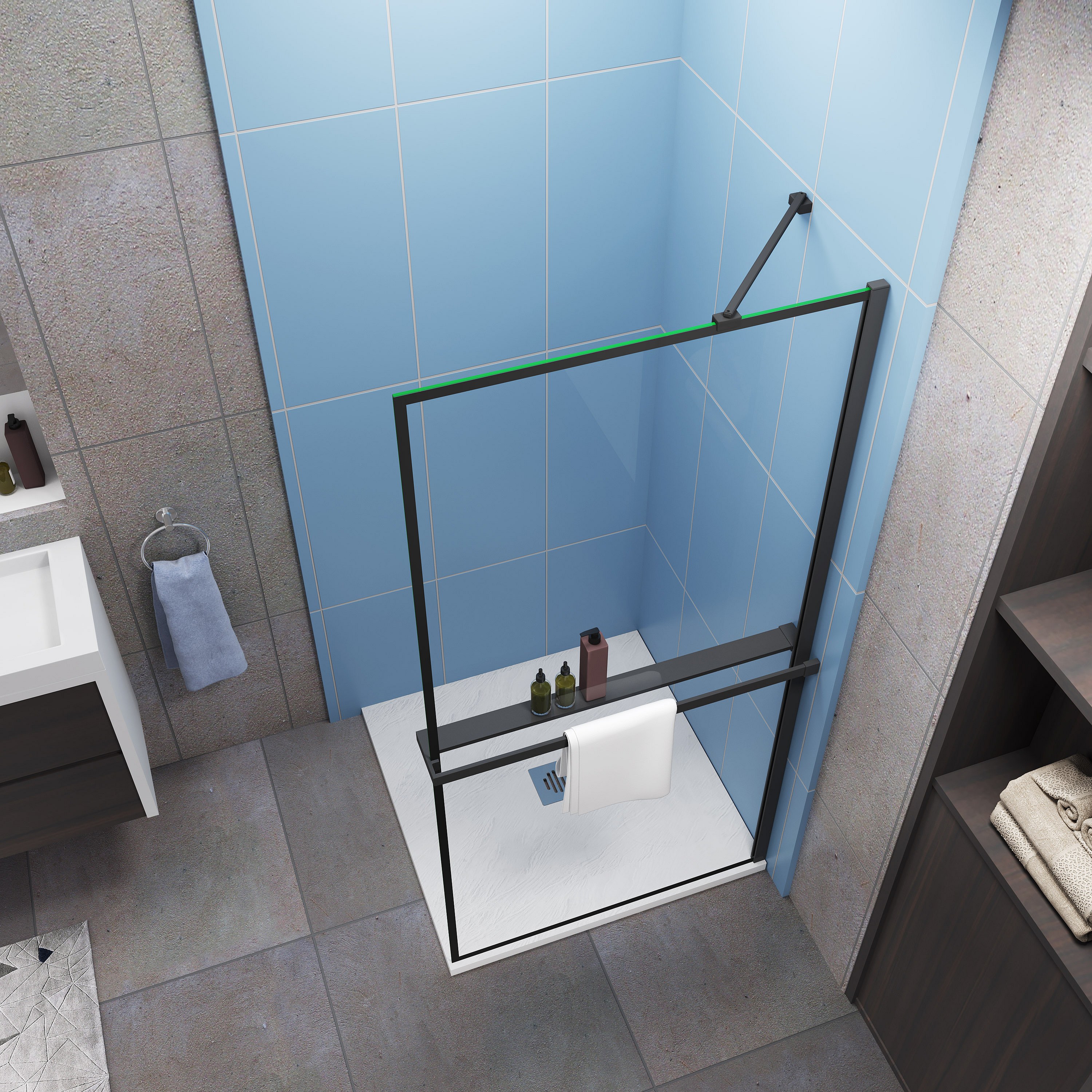 Inloopdouchewand met zwart profiel, 90x200cm - 8mm antikalkglas + 90cm zwarte aluminium doucheplank + 45cm montagestang