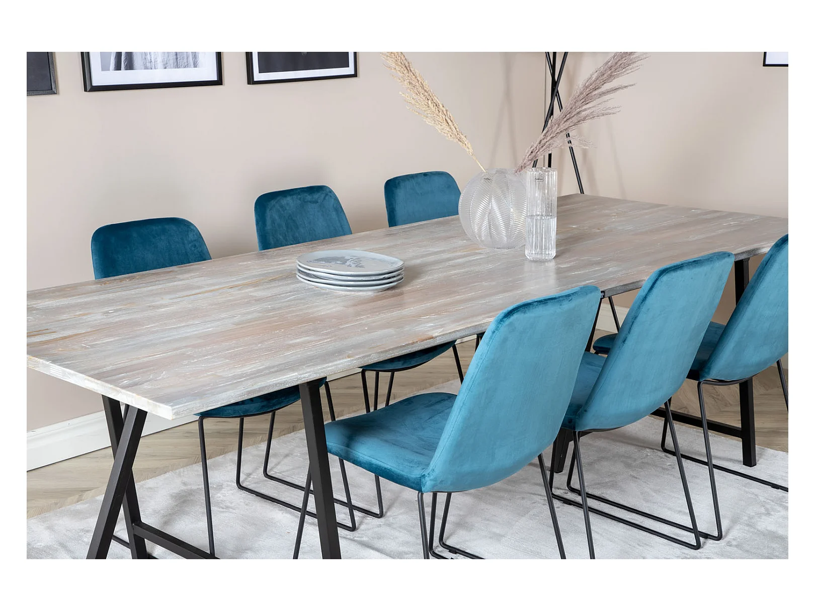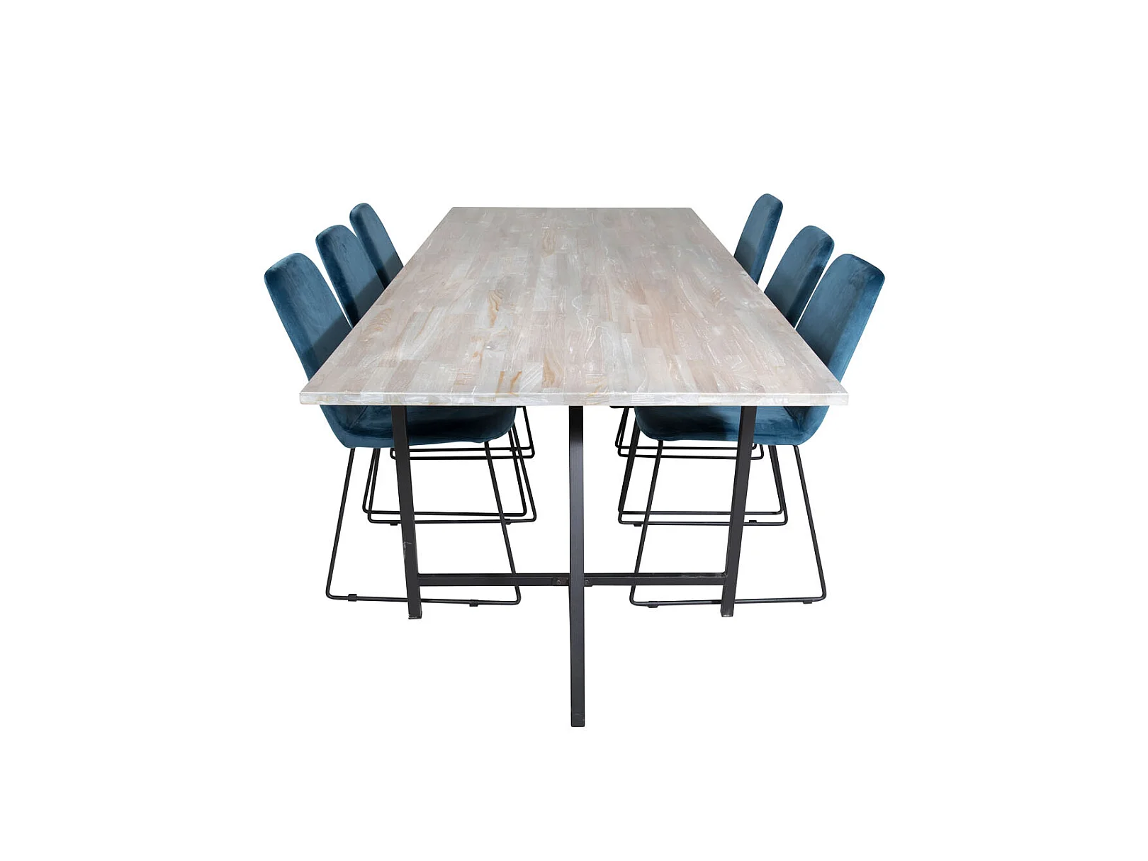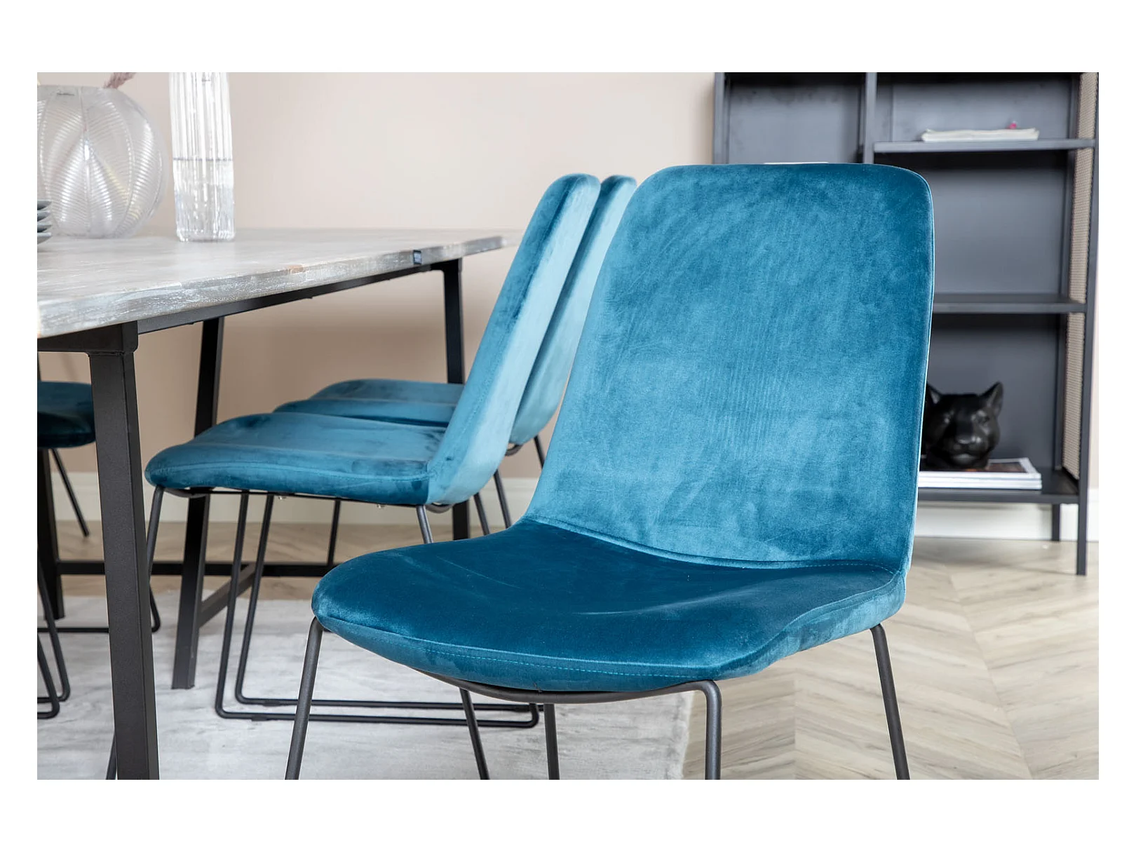 Jepara eethoek eetkamertafel teakhout en 6 Muce eetkamerstal velours blauw.