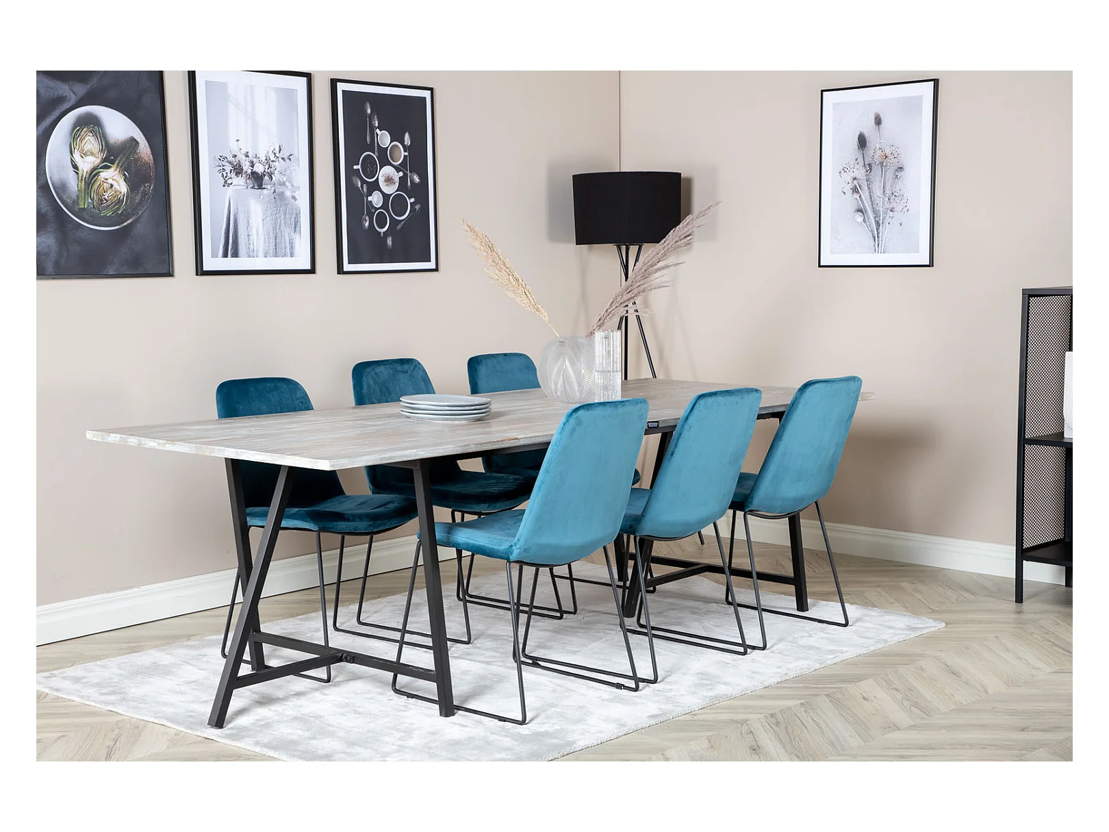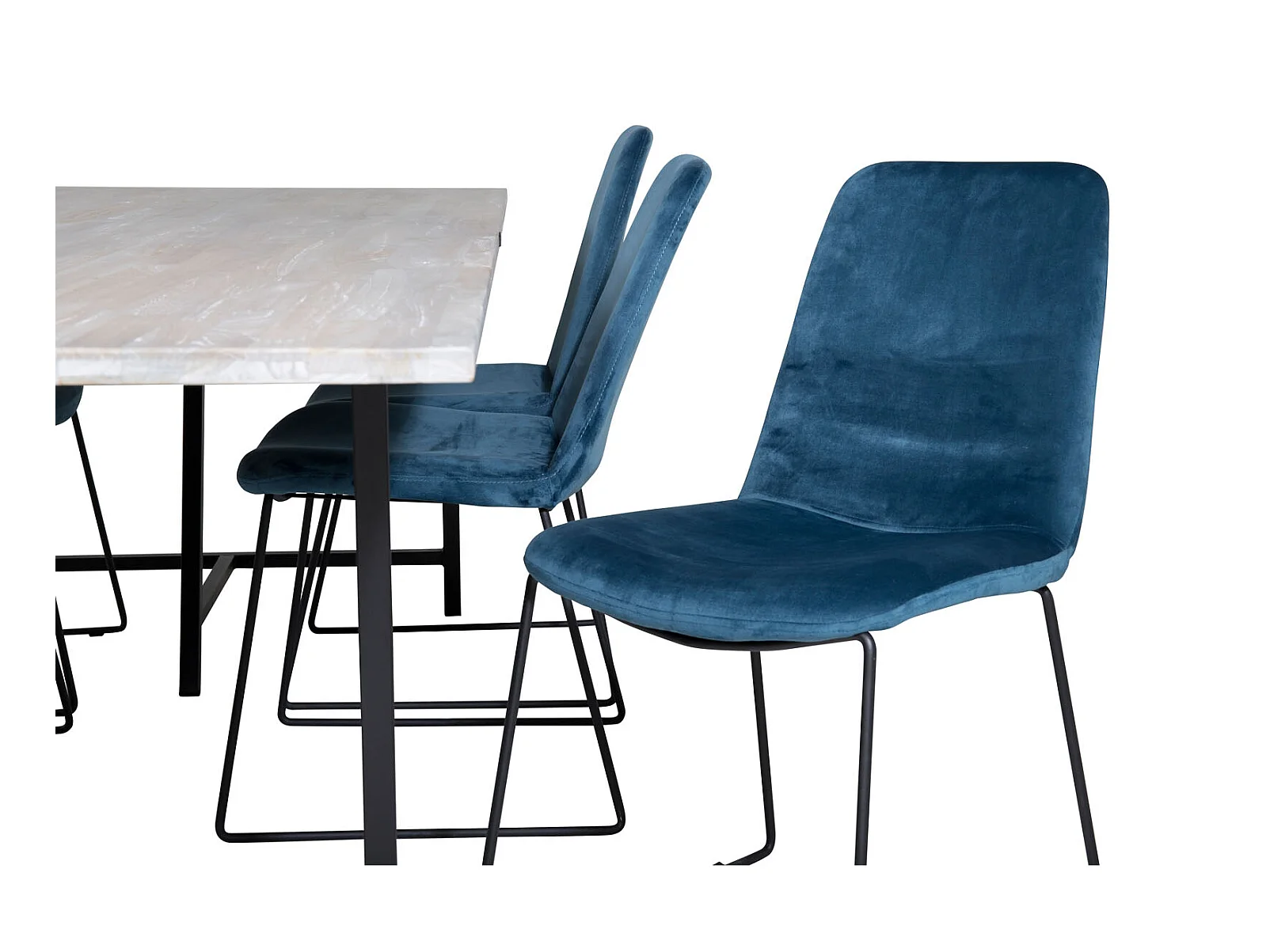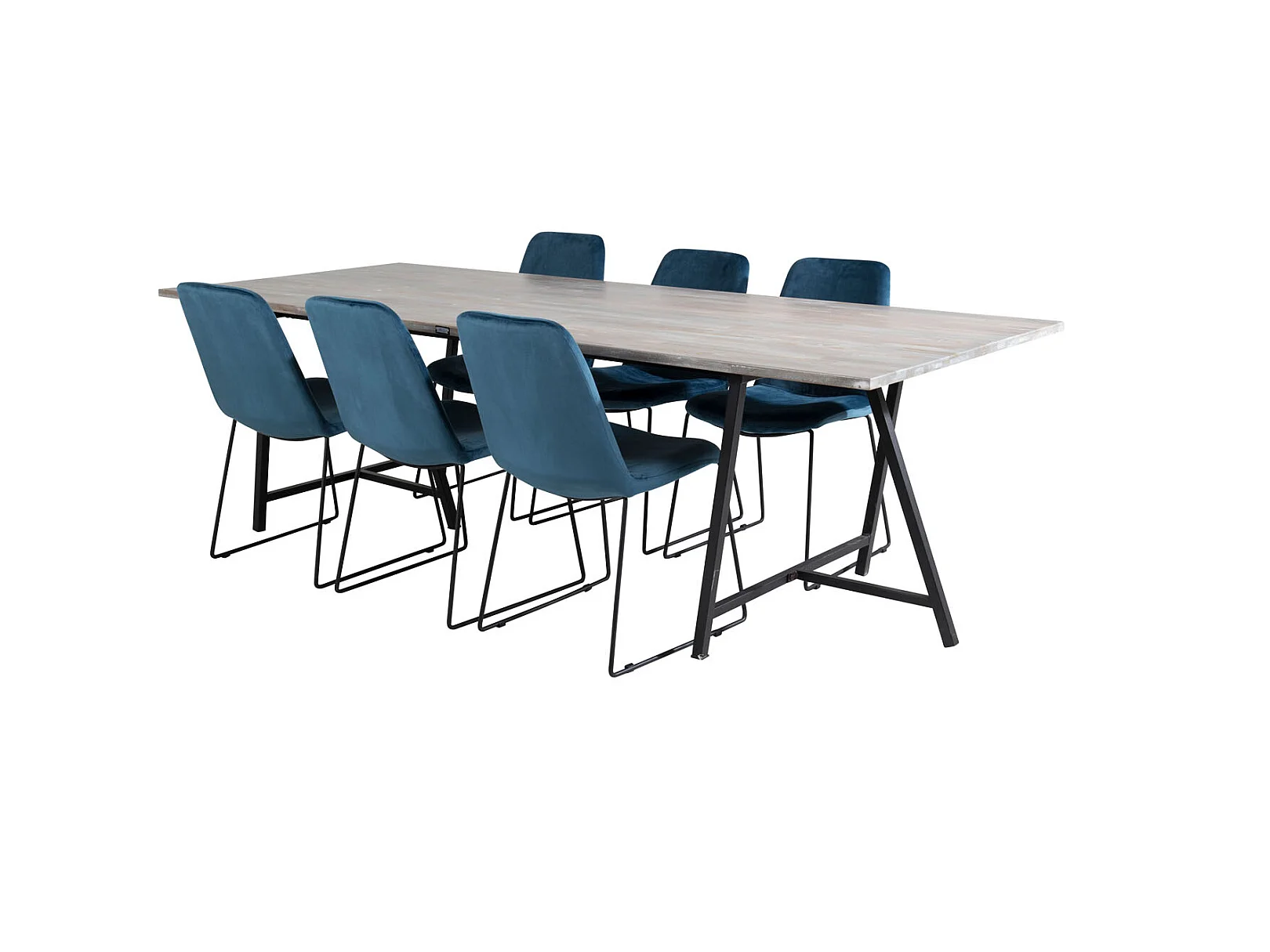 Jepara eethoek eetkamertafel teakhout en 6 Muce eetkamerstal velours blauw.