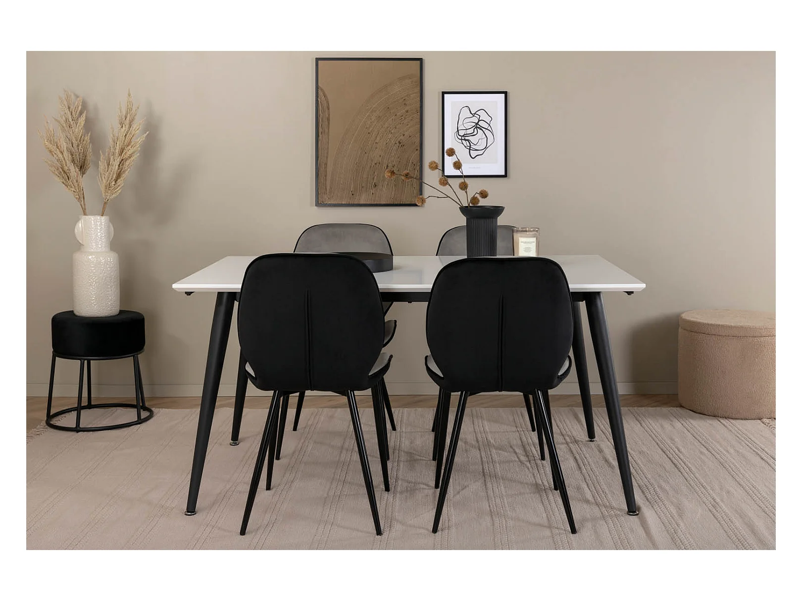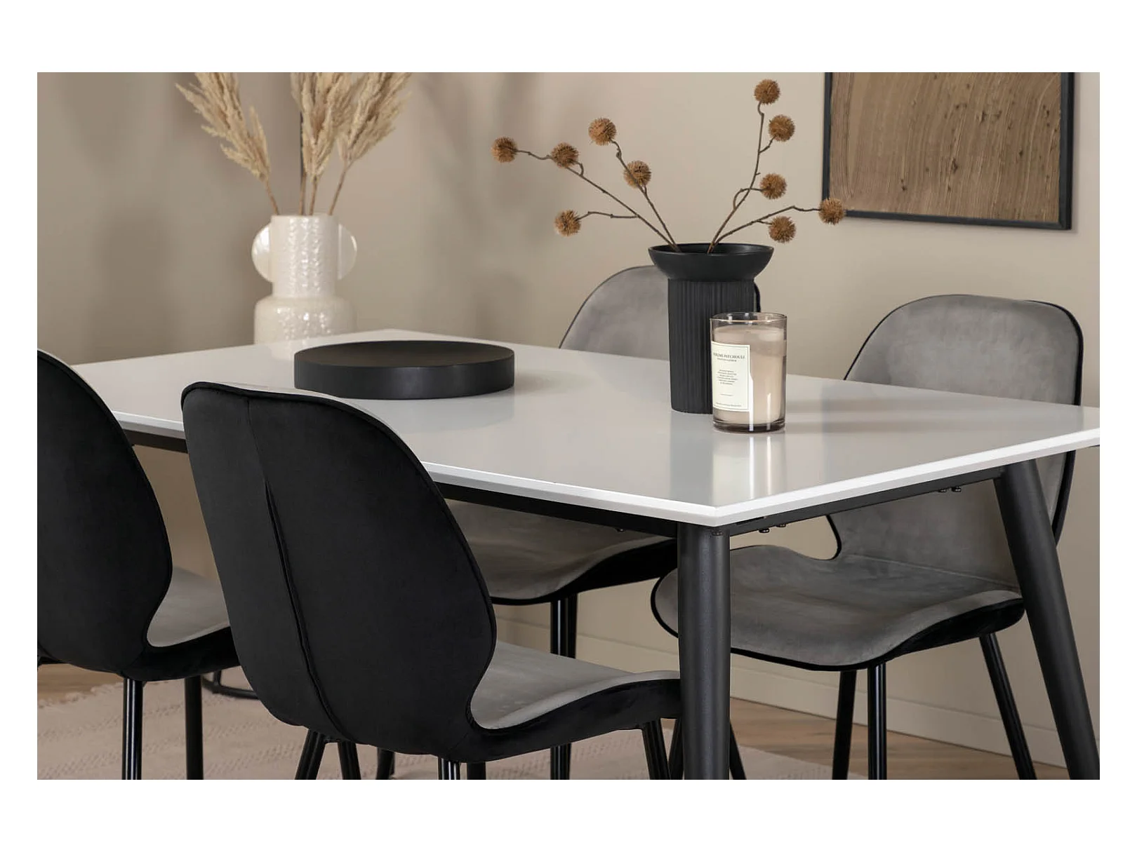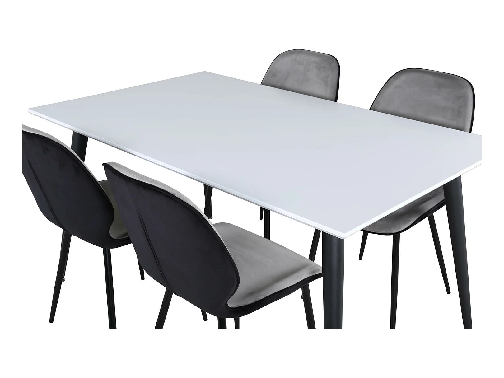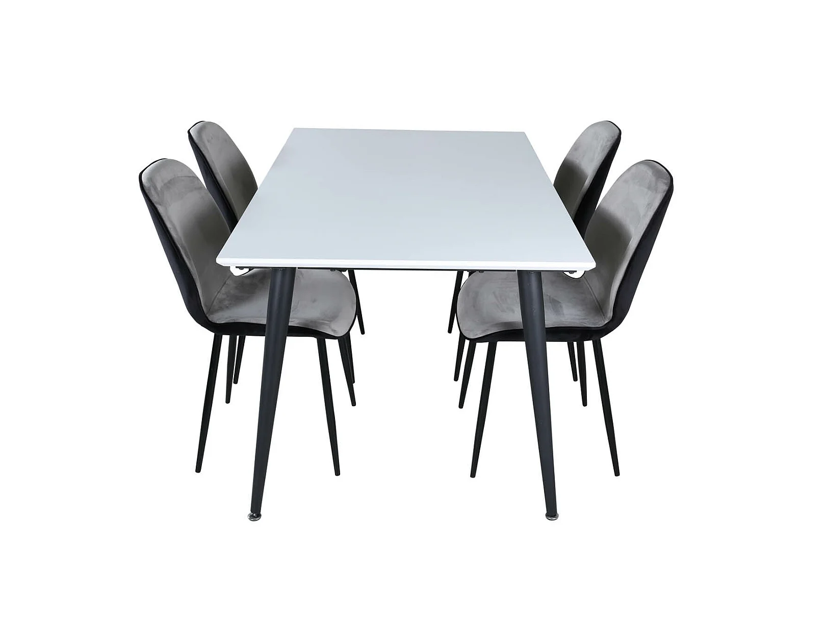 Jimmy150 eethoek eetkamertafel uitschuifbare tafel lengte cm 150 / 240 wit en 4 Emma eetkamerstal velours grijs,zwart.