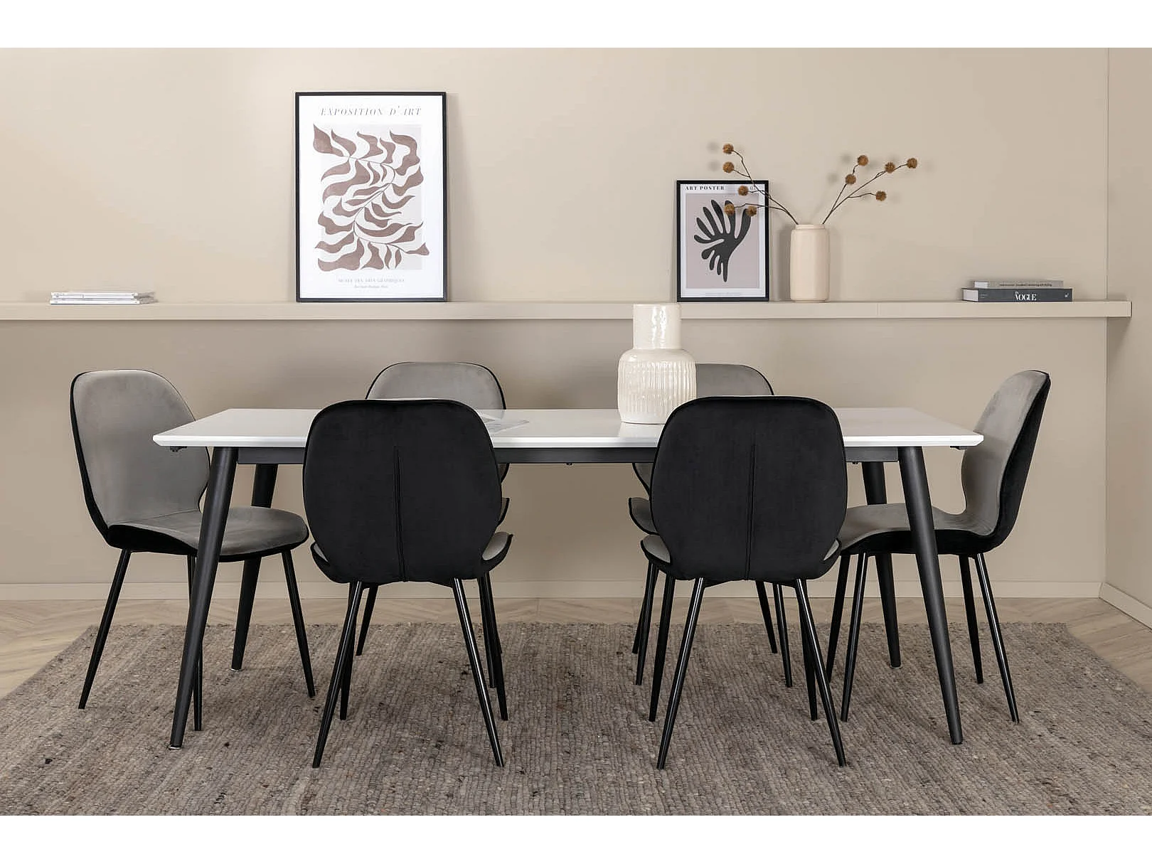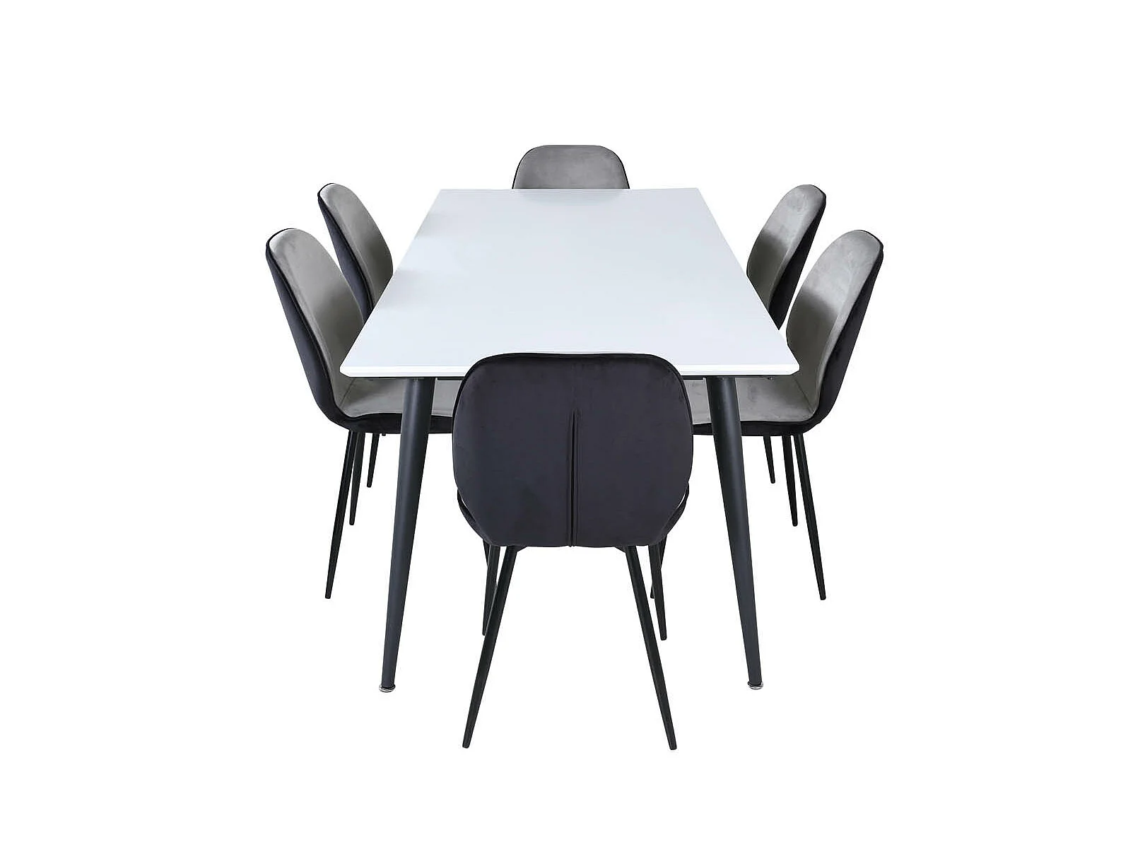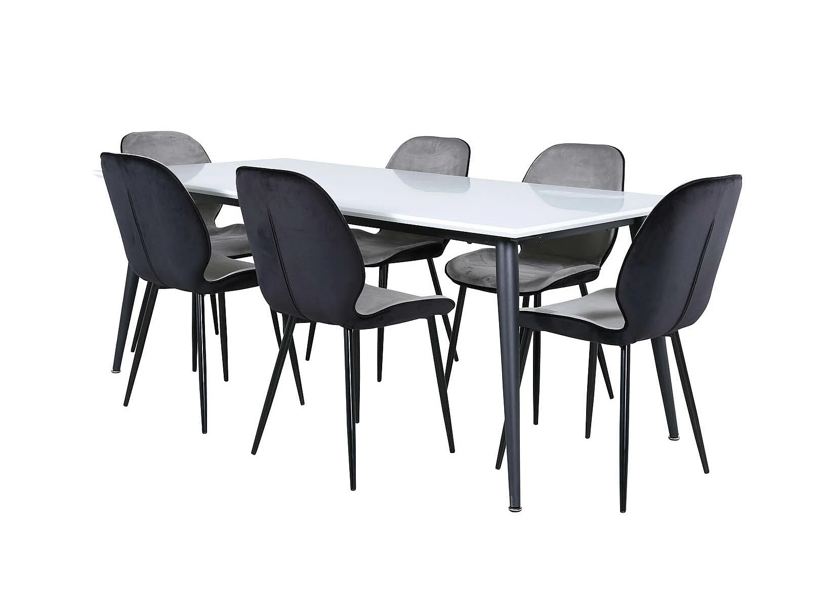 Jimmy195 eethoek eetkamertafel uitschuifbare tafel lengte cm 195 / 285 wit en 6 Emma eetkamerstal velours grijs,zwart.