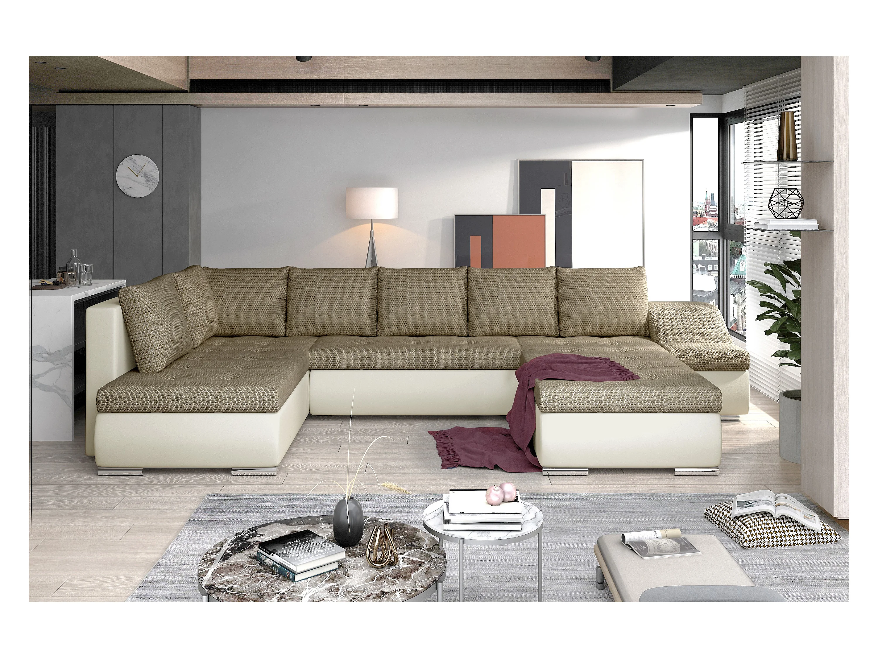 JONAZ omvormbare panoramische bank in imitatieleer en stof - Geïntegreerde opbergruimte-Kleur Lichtbeige/gemêleerd beige-Dagbed Naar links