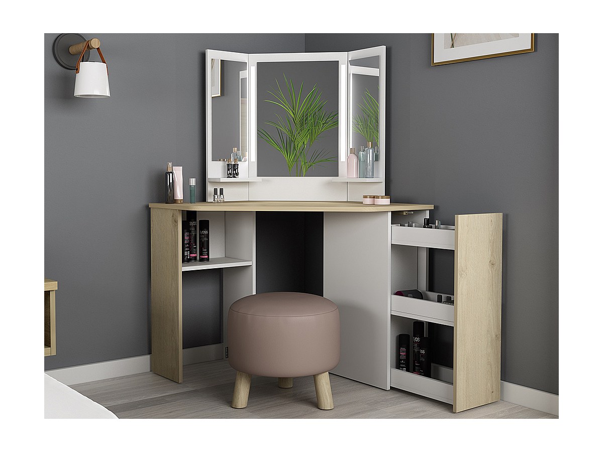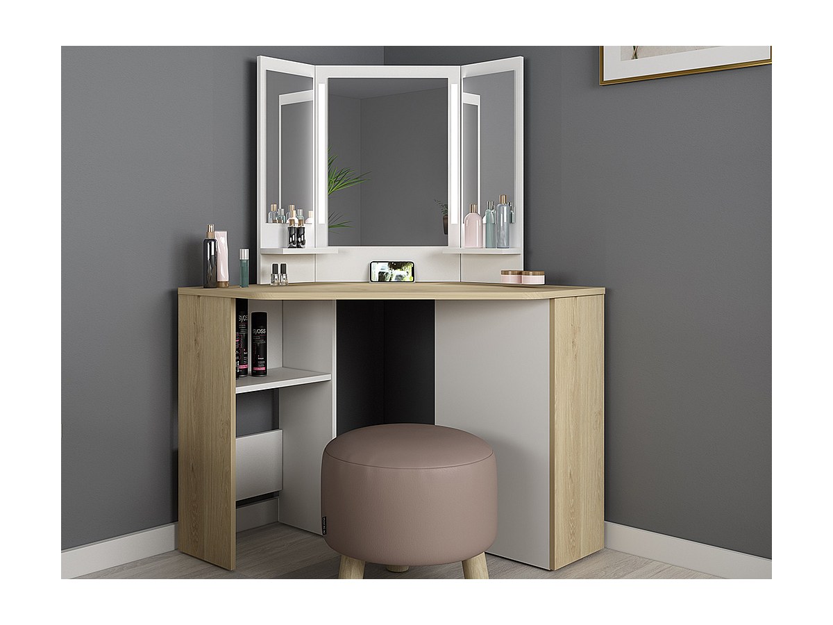 Kaptafel CHARLENE - Spiegel met ledverlichting en opbergruimtes - Wit en eiken